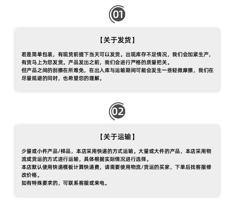 Si se empaqueta de forma sencilla, se puede enviar el mismo día si está en stock. Si no hay suficiente inventario, aumentaremos la producción y se lo enviaremos en cuanto esté disponible. Antes del envío, realizamos un estricto control de calidad. Sin embargo, es inevitable que se produzcan rayones durante el almacenamiento y el transporte. Si bien intentamos evitar cualquier fricción, esperamos su comprensión.