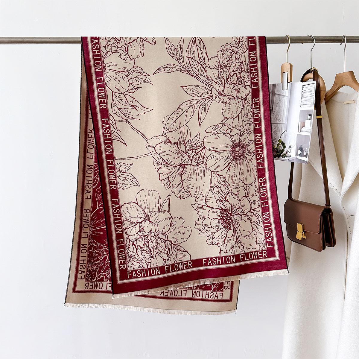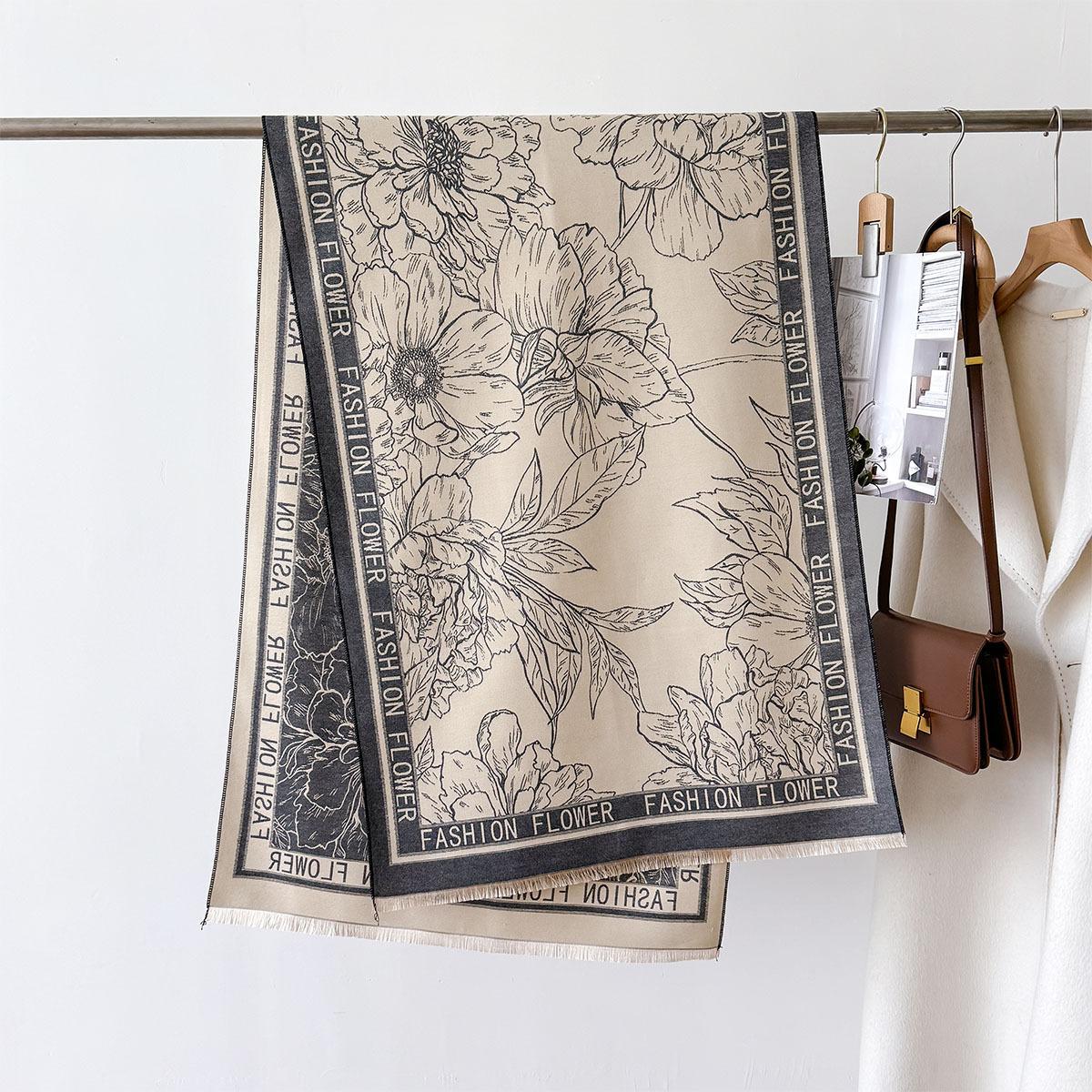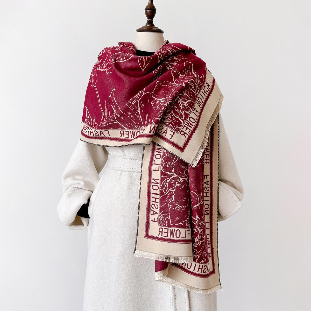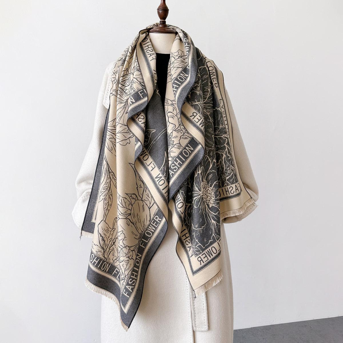 Bufanda de cachemira de doble cara cálida y combinable con todo, estilo étnico, con estampado vintage de flores y letras, para otoño e invierno, para mujer.