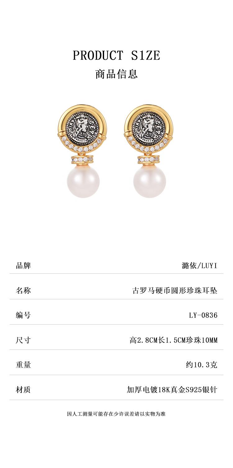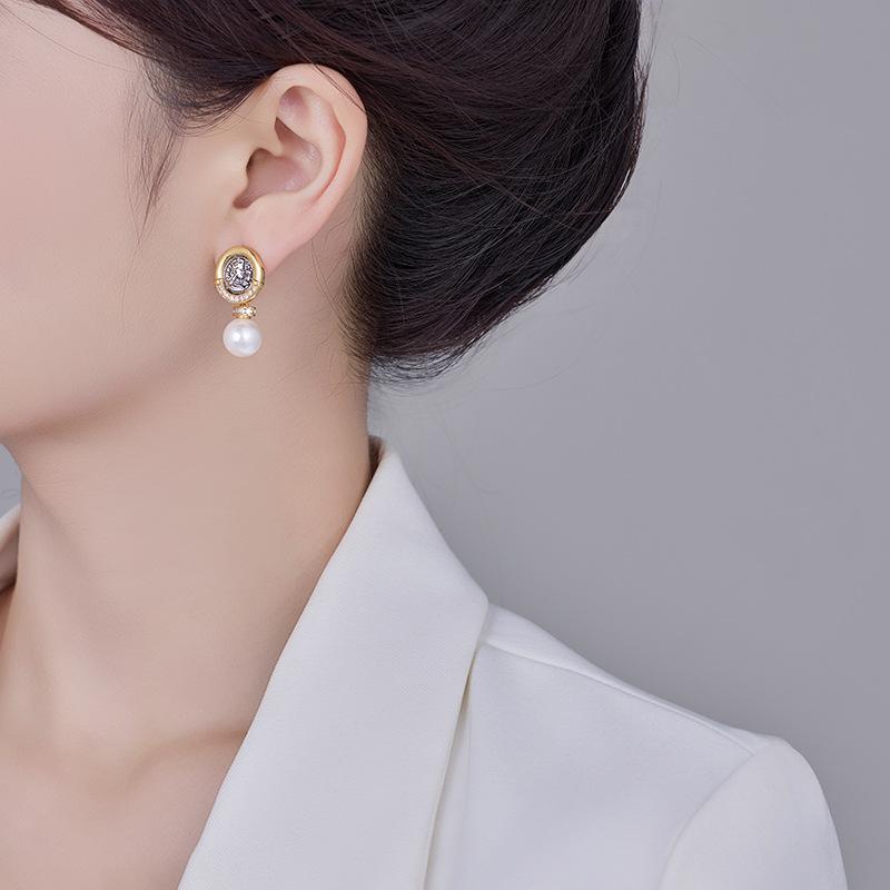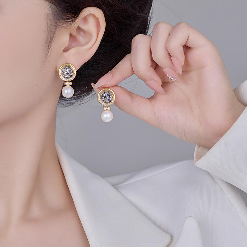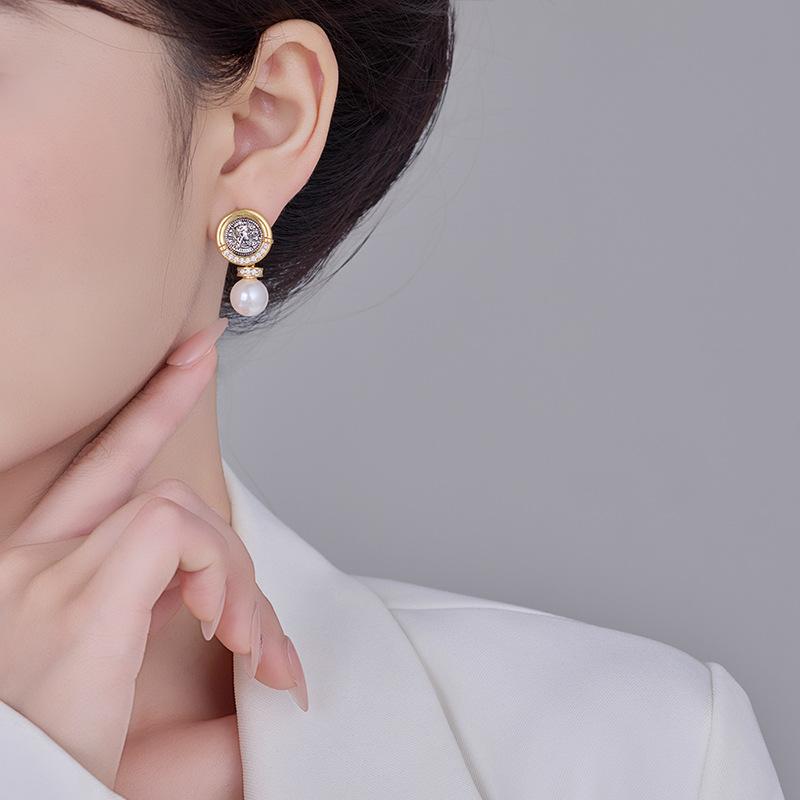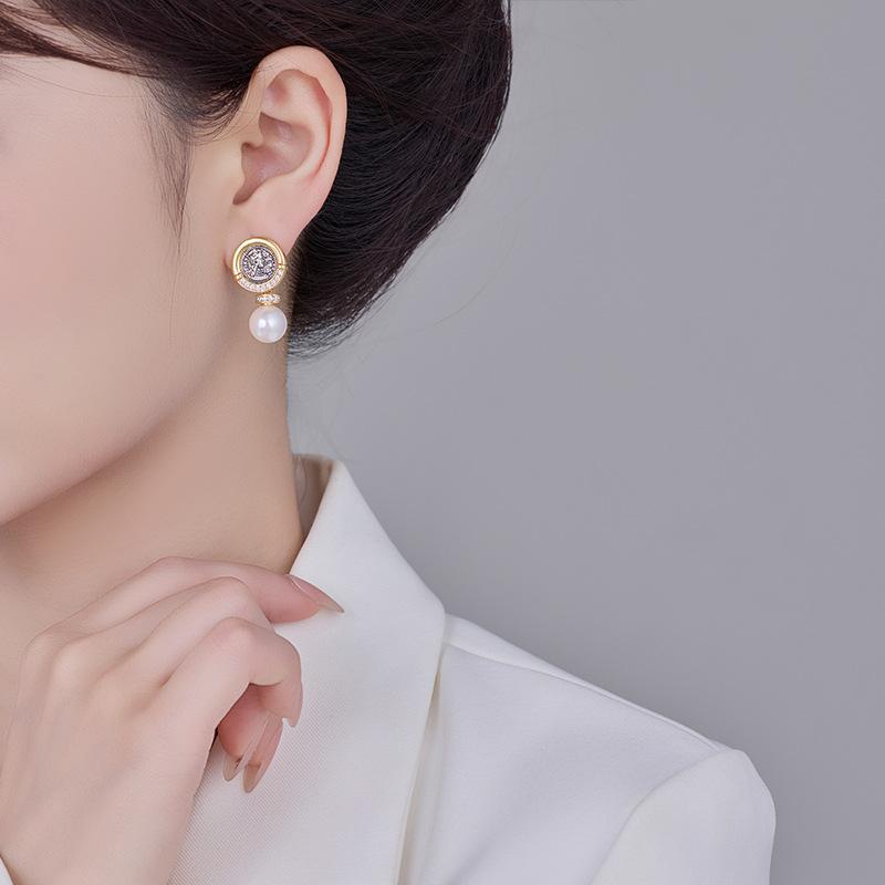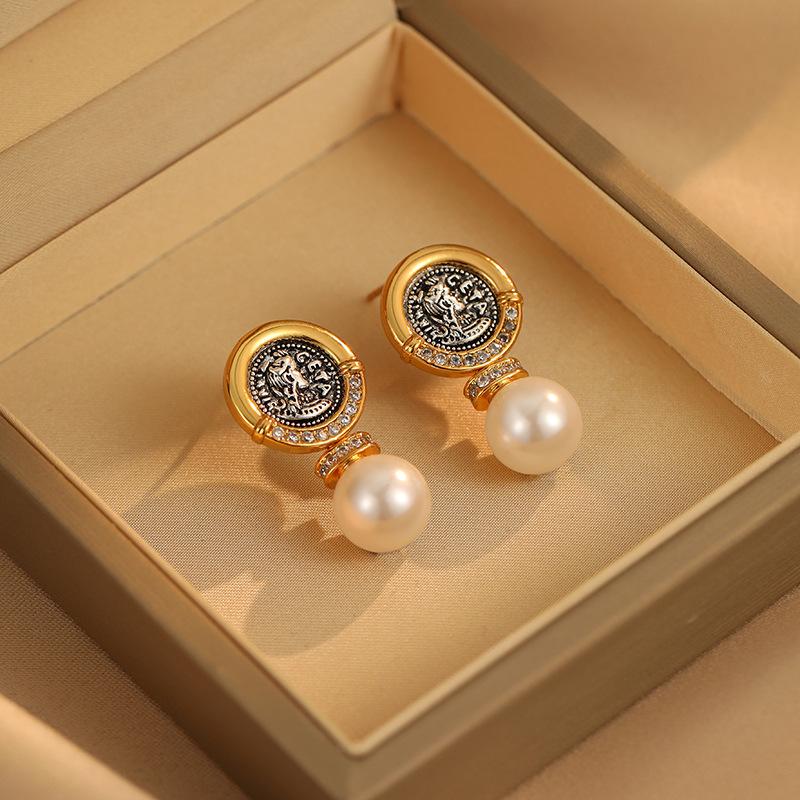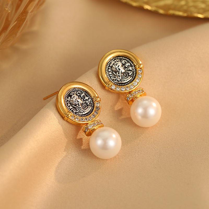 Pendientes de moneda antigua de dos colores con perla de circón, pendientes retro de moda para mujer, diseño de nicho, pendientes de alta gama