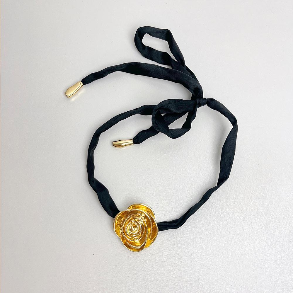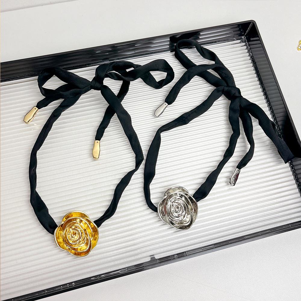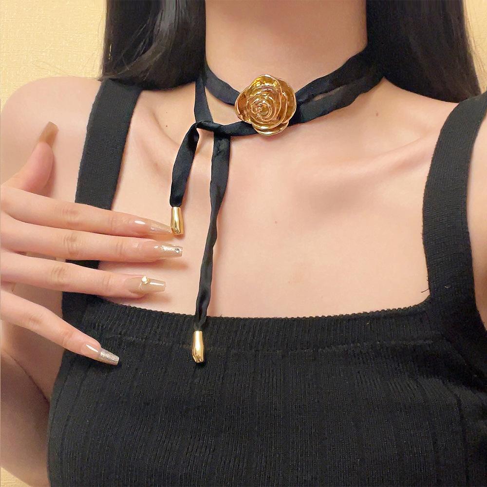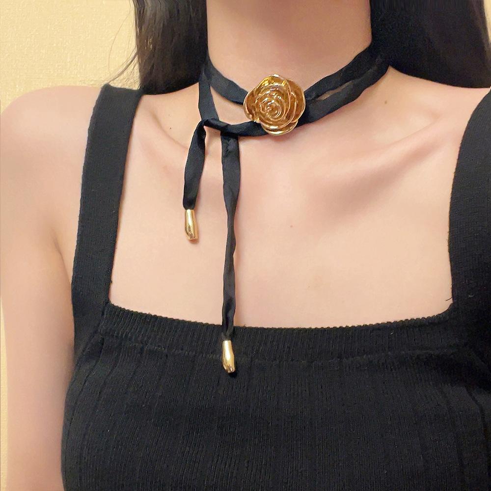 Collar de Rosa de Metal Tridimensional Estilo Francés Vintage Gargantilla Larga de Encaje de Tela Nicho Cadena de Clavícula de Alta Gama