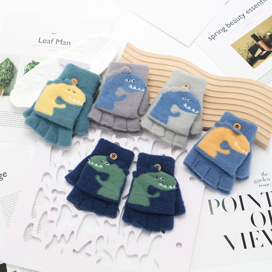 Guantes para niños de otoño e invierno cálidos de medio dedo con dibujos animados, bonitos guantes de punto extra largos con forro polar grueso para niños y niñas.