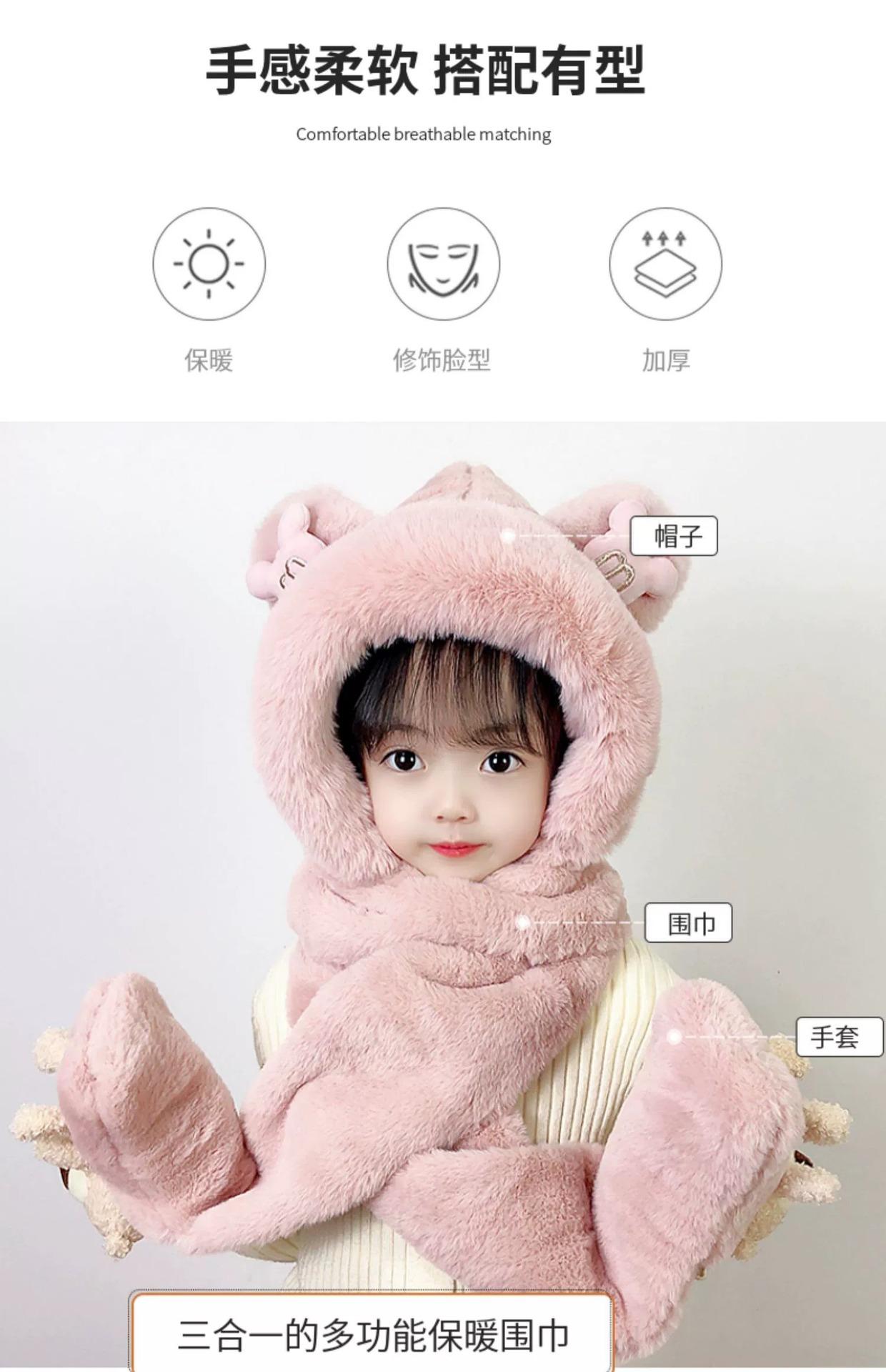 Conjunto de tres piezas de gorro, bufanda y guantes para niños, gorro grueso de terciopelo de invierno, resistente al viento, para niñas y niños, gorro familiar de una pieza.
