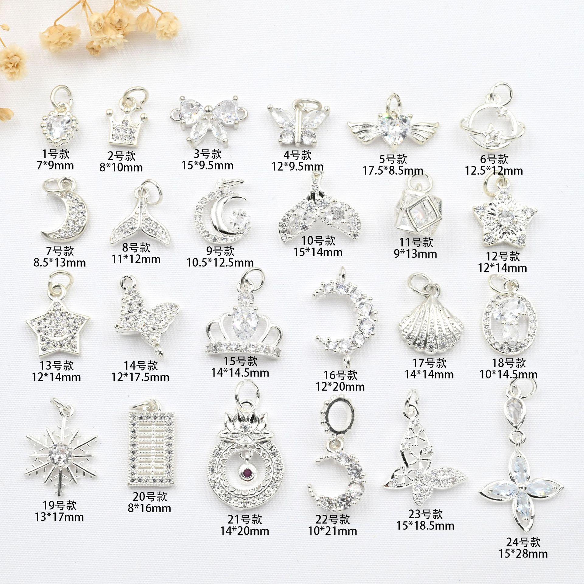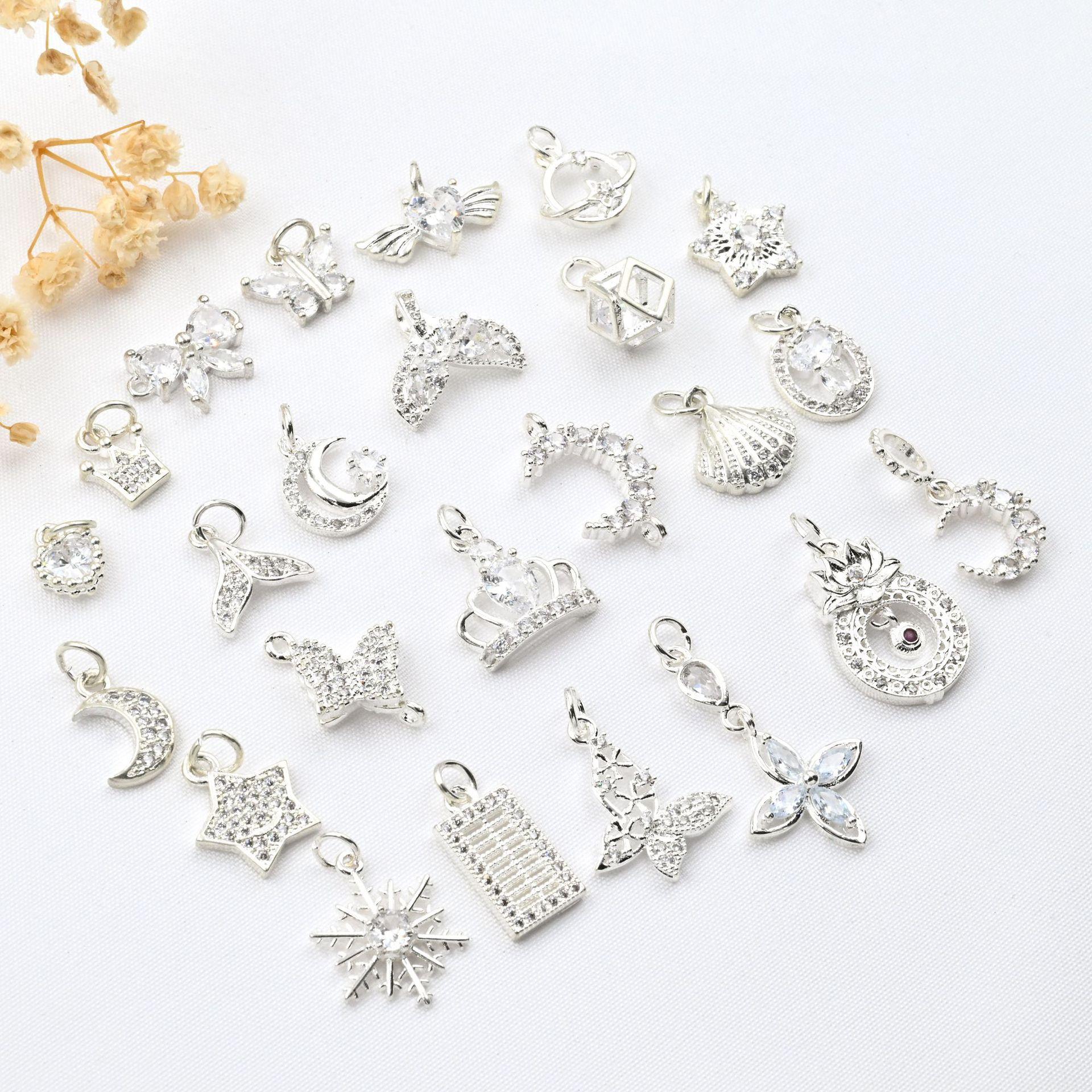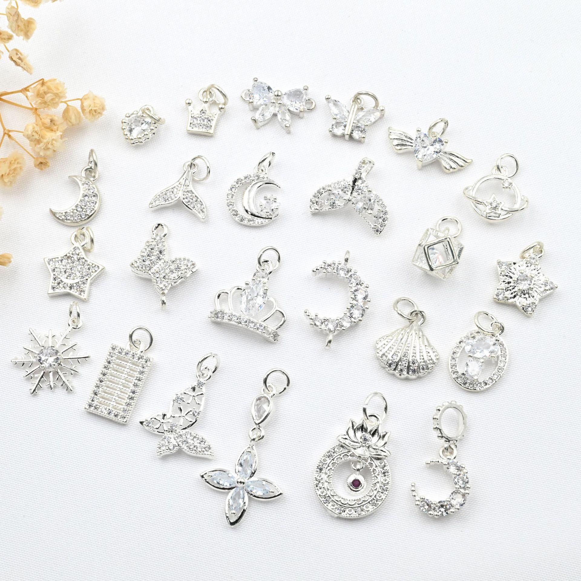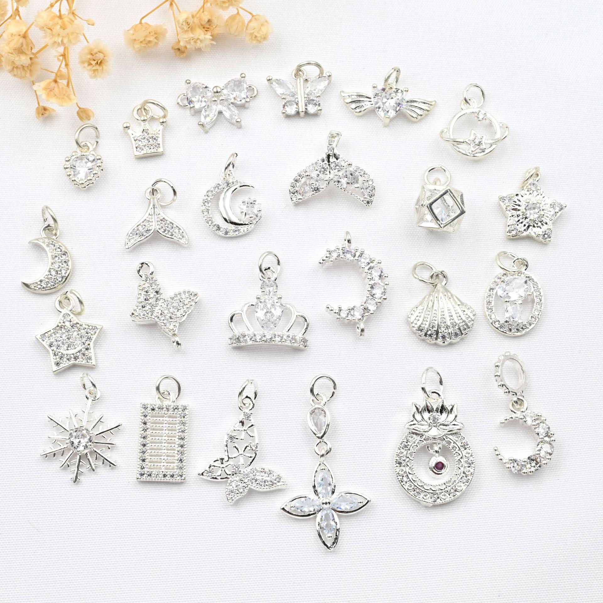 Colgante de cobre plateado con microincrustaciones de circonita, diseño de luna, ábaco, mariposa, cola de pez, pequeño colgante, collar, pendientes, accesorios DIY