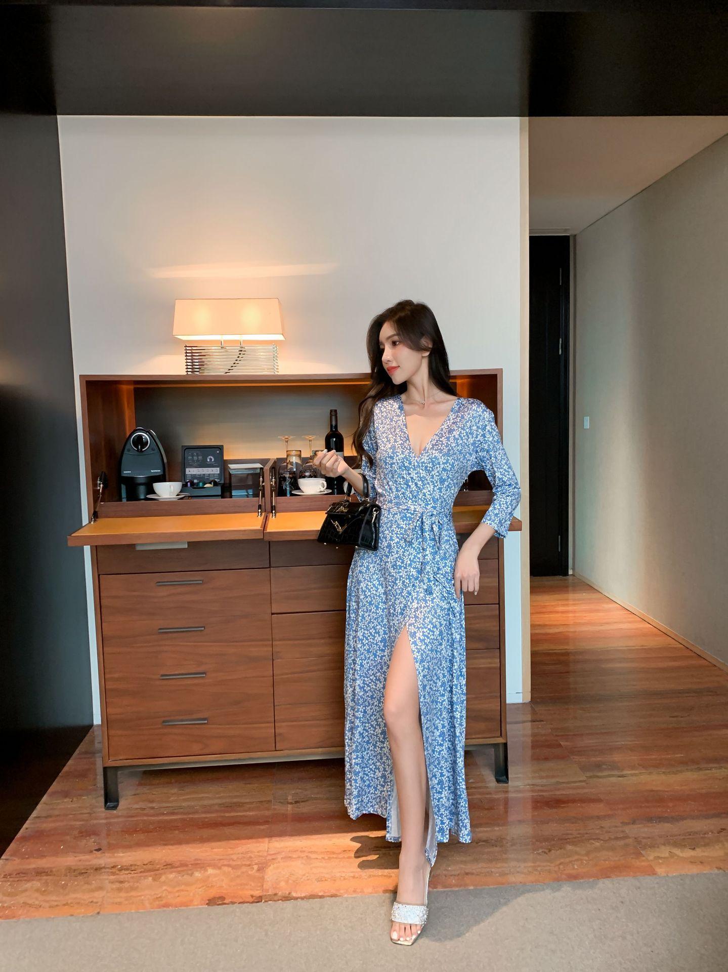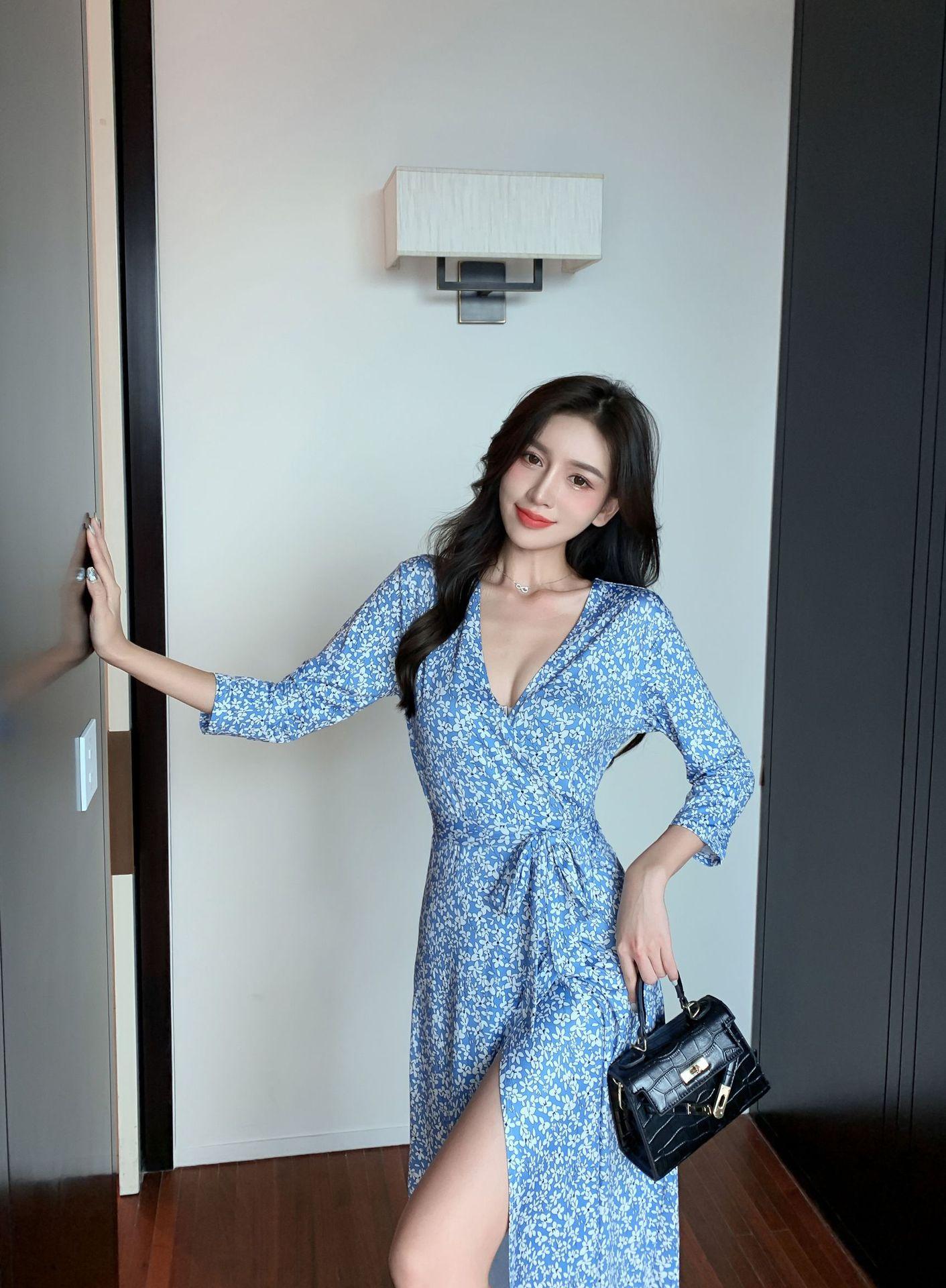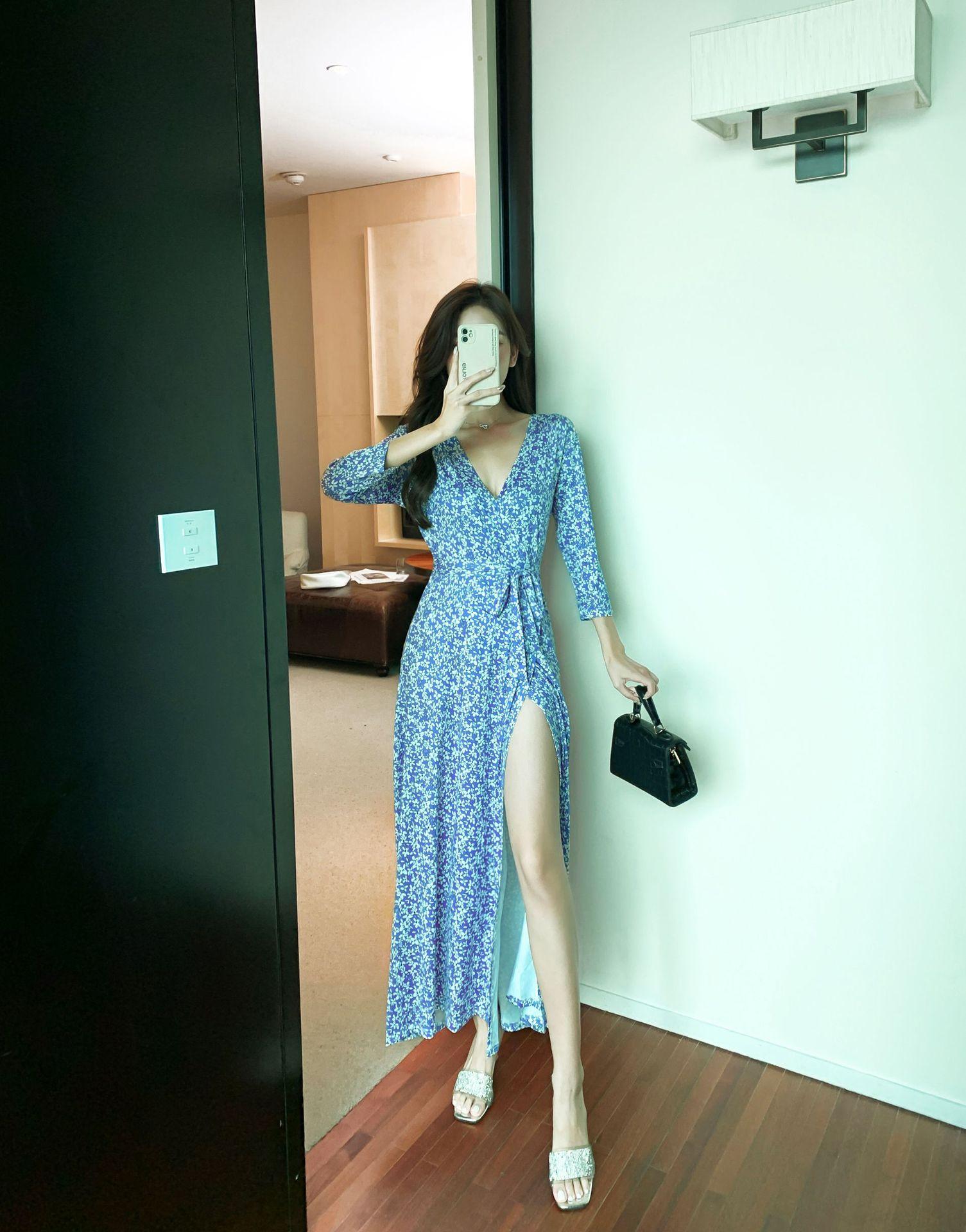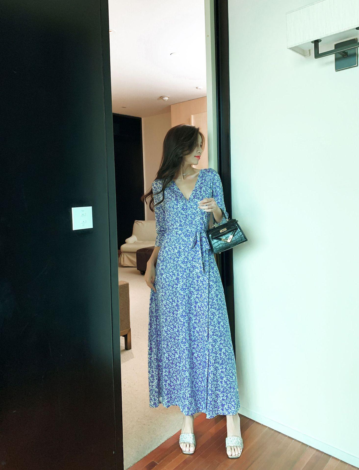 Ropa de mujer transfronteriza 2022 nuevo vestido de una pieza para mujer, cintura fresca, adelgazamiento, falda floral, vestido cruzado en el pecho