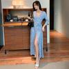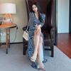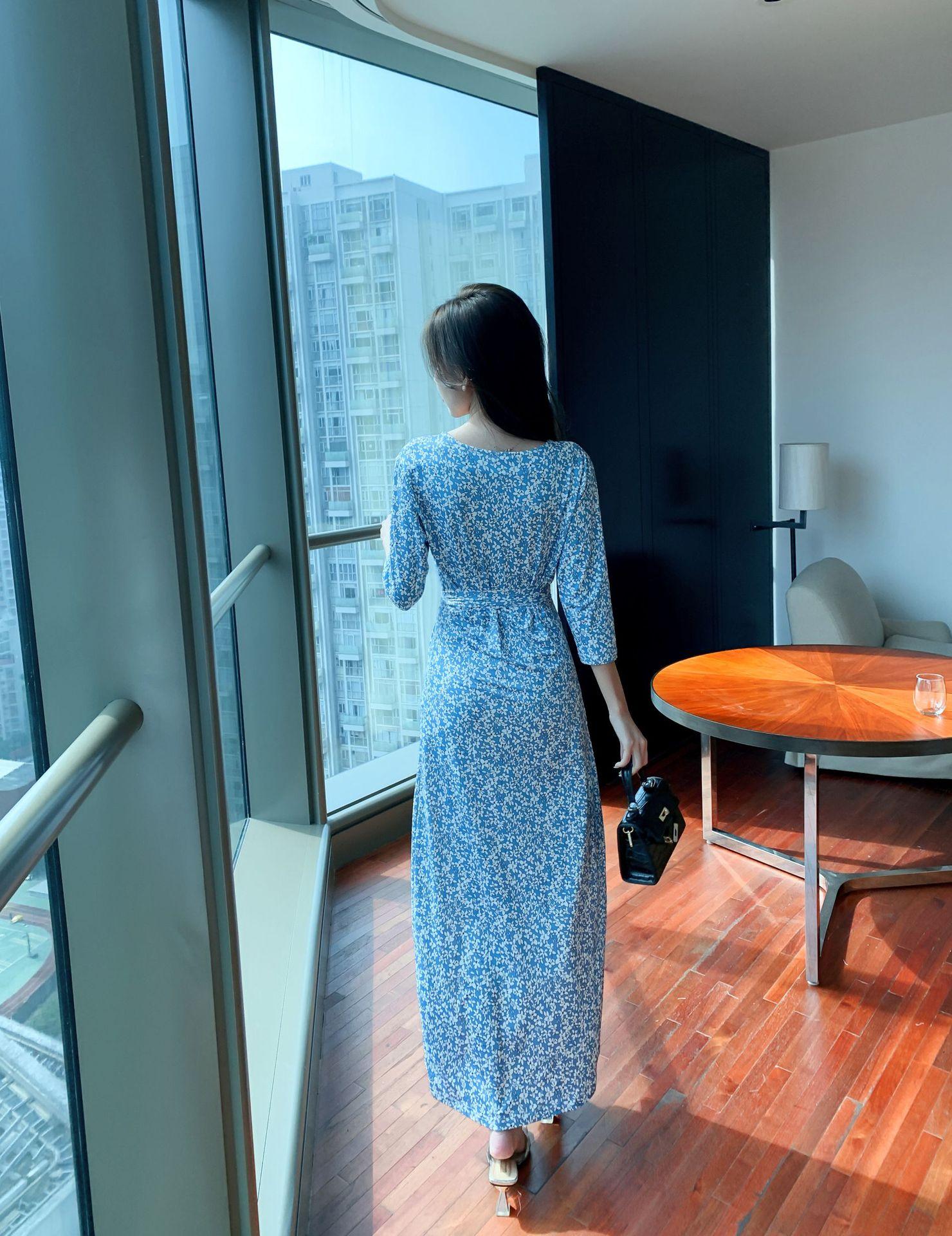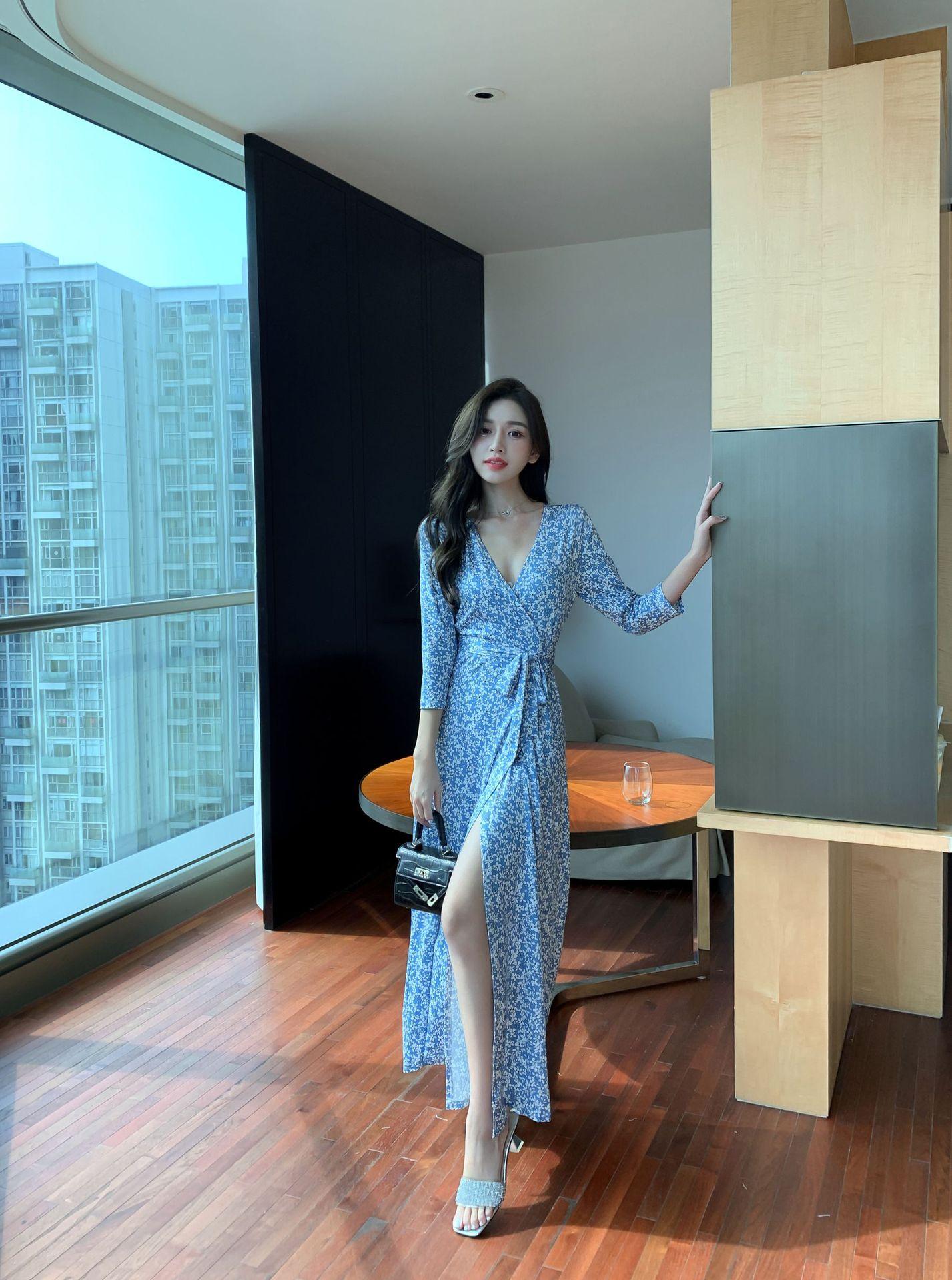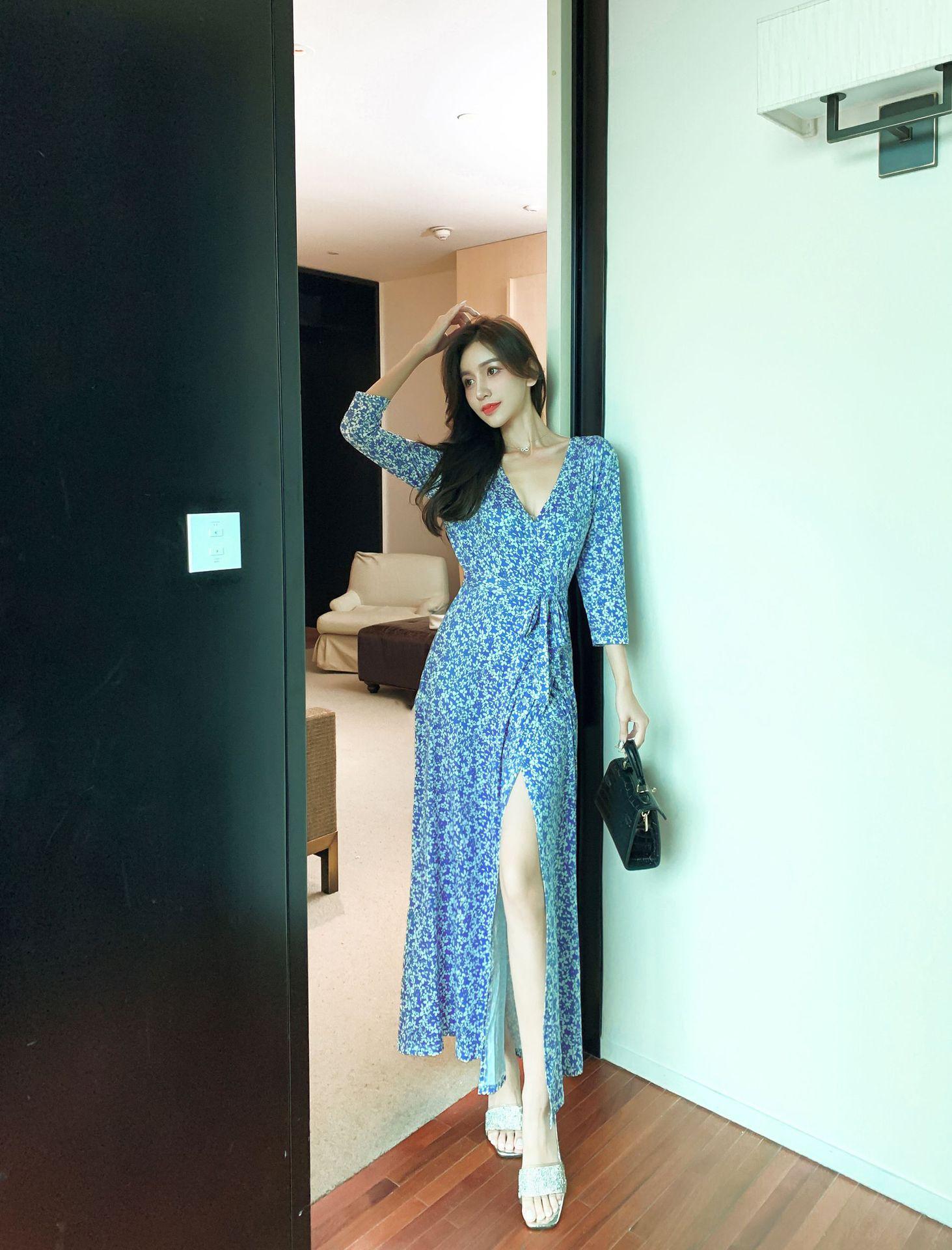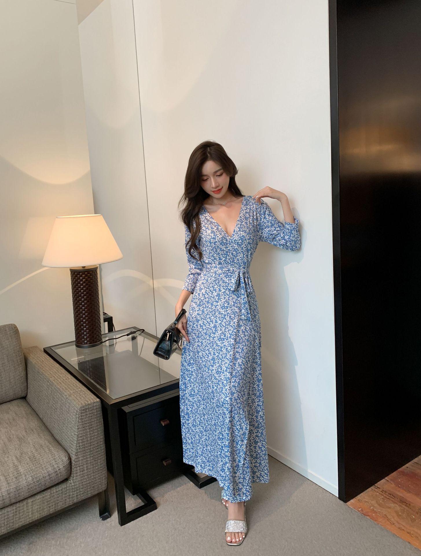 Ropa de mujer transfronteriza 2022 nuevo vestido de una pieza para mujer, cintura fresca, adelgazamiento, falda floral, vestido cruzado en el pecho