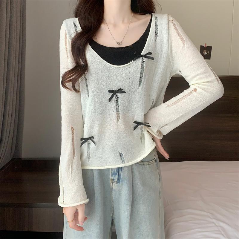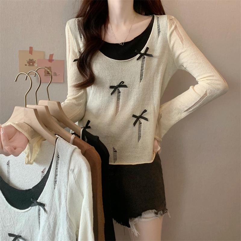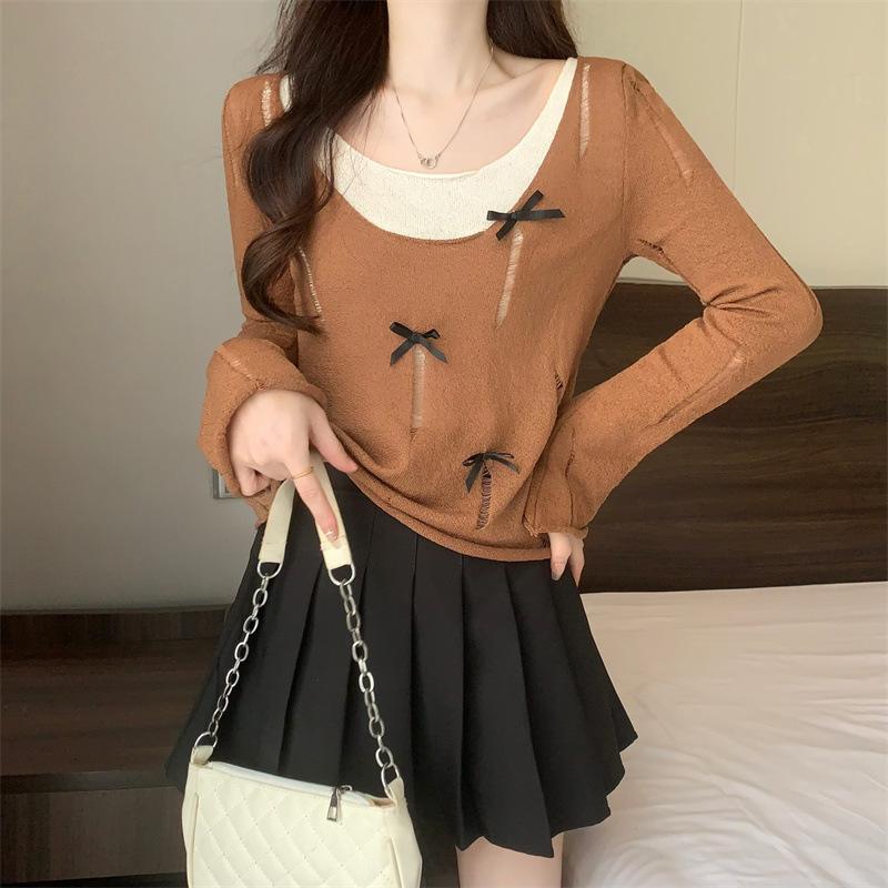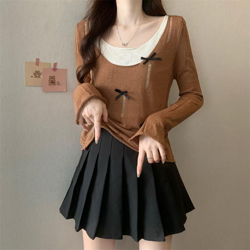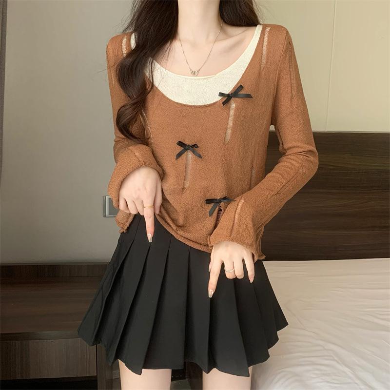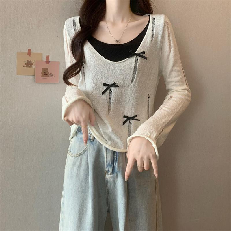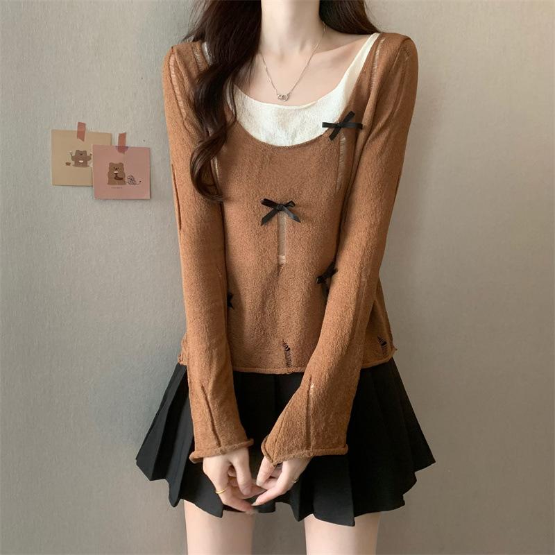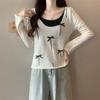 Camiseta de Contraste de Dos Piezas Falsas con Lazo para Mujer Otoño Delgada Única Elegante Camisa de Punto Top Ajustado de Manga Larga
