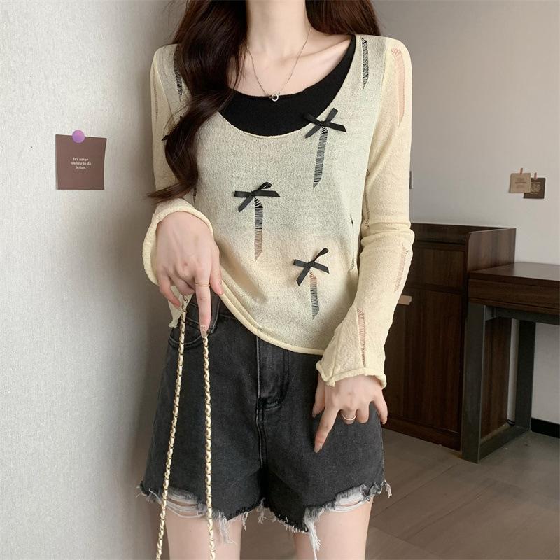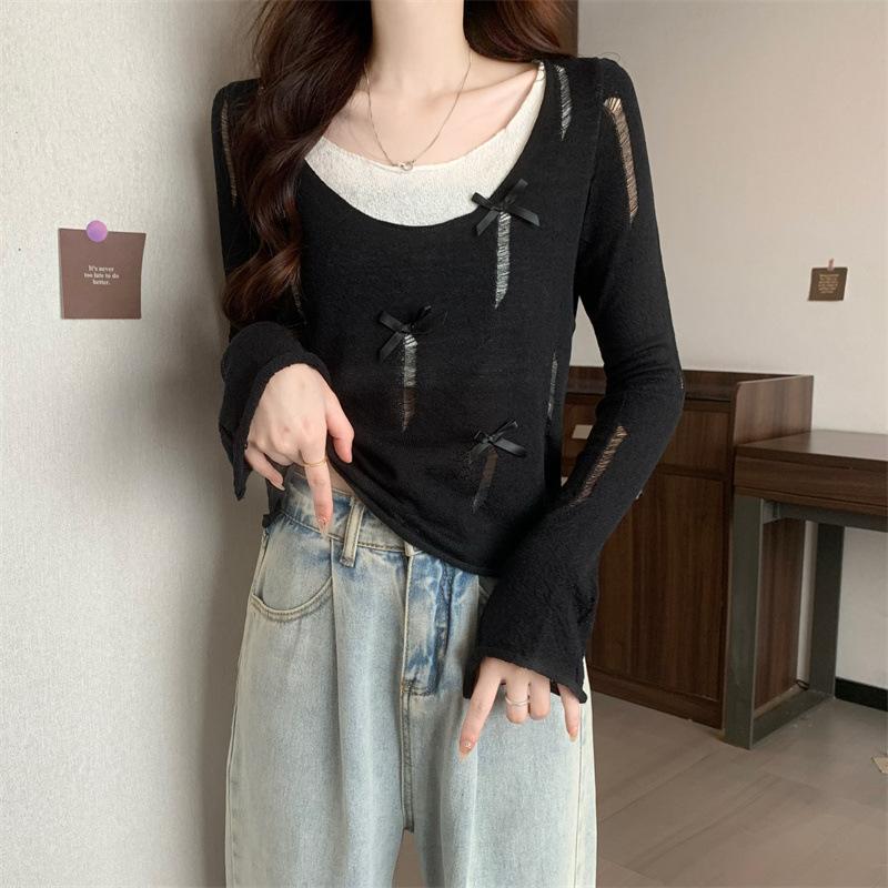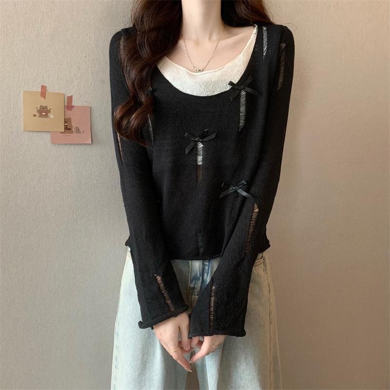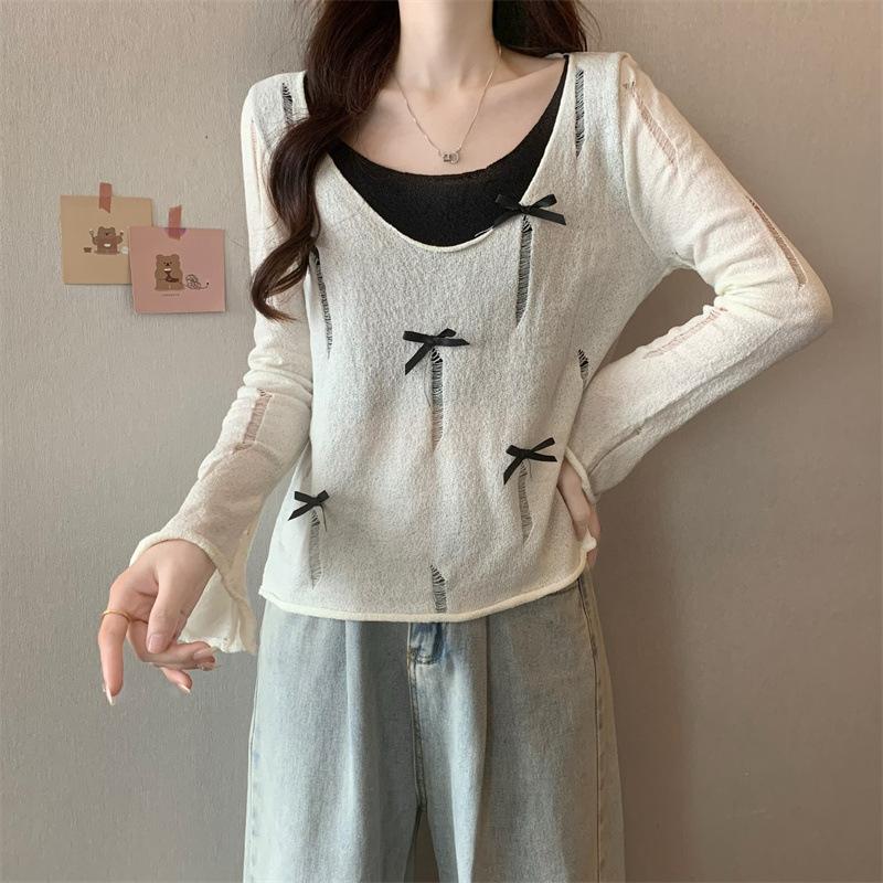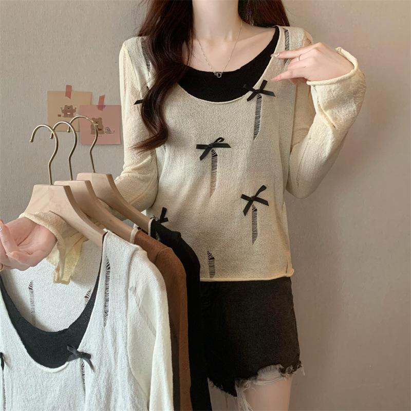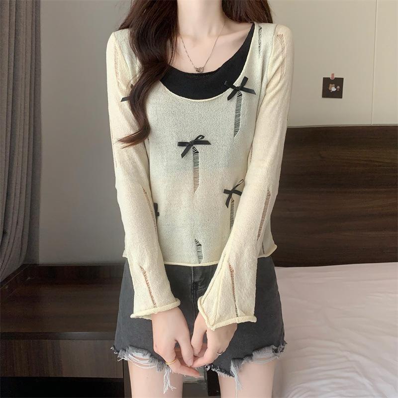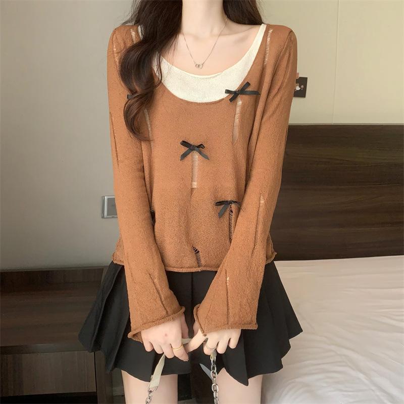Camiseta de Contraste de Dos Piezas Falsas con Lazo para Mujer Otoño Delgada Única Elegante Camisa de Punto Top Ajustado de Manga Larga