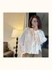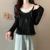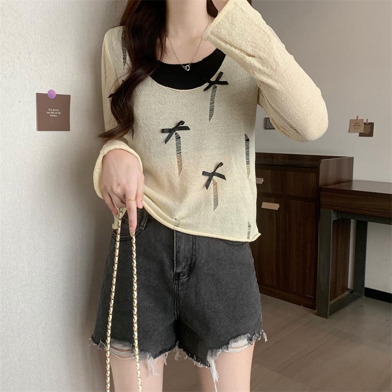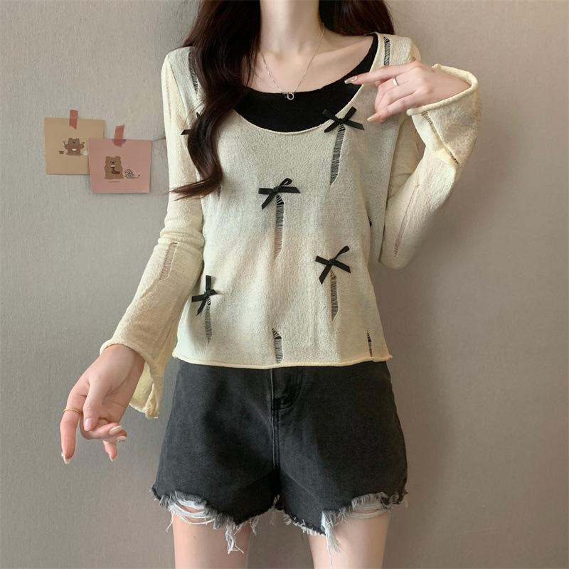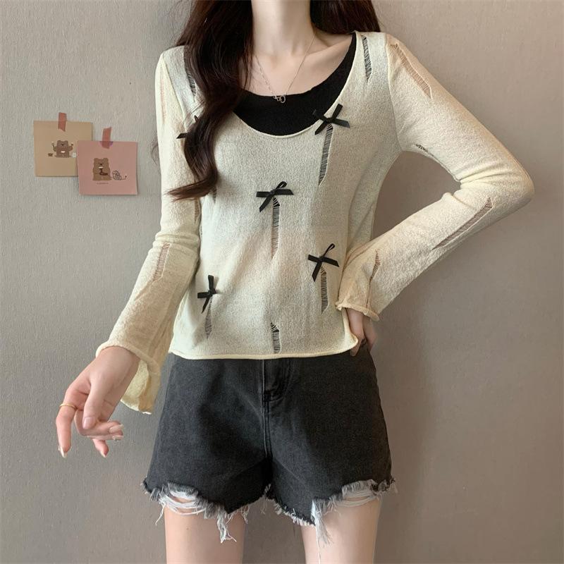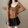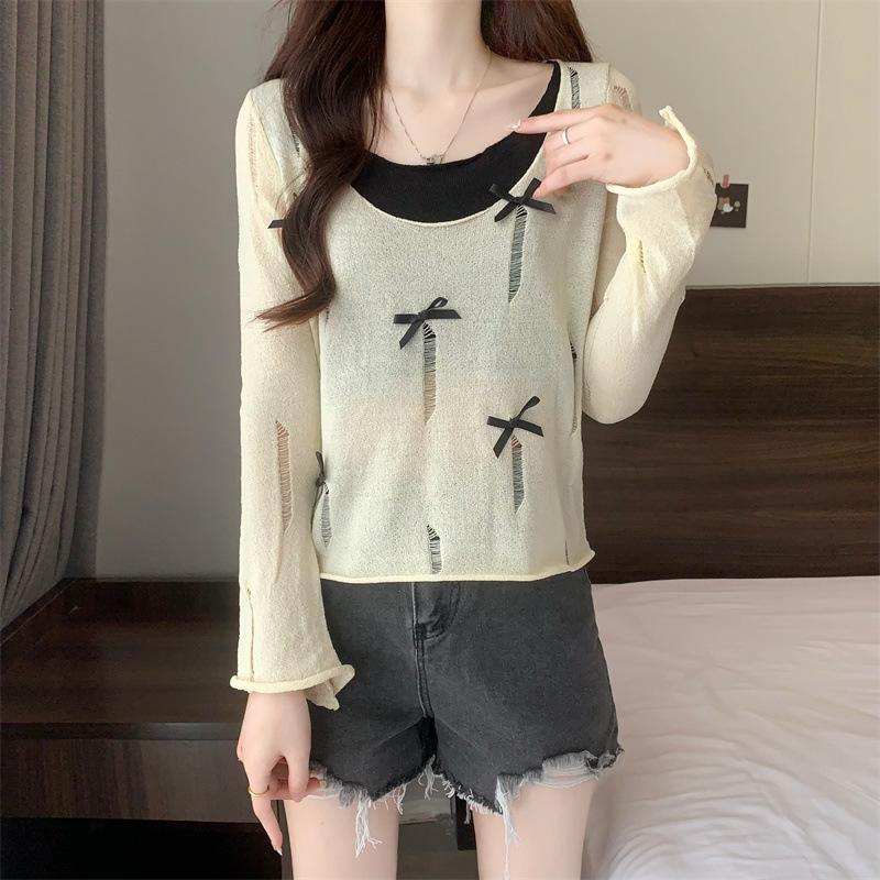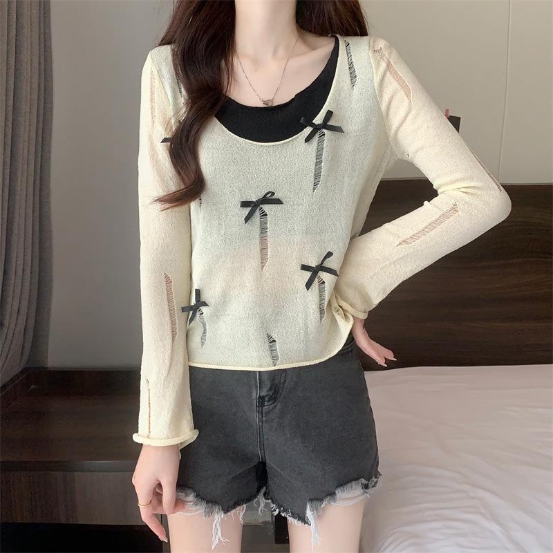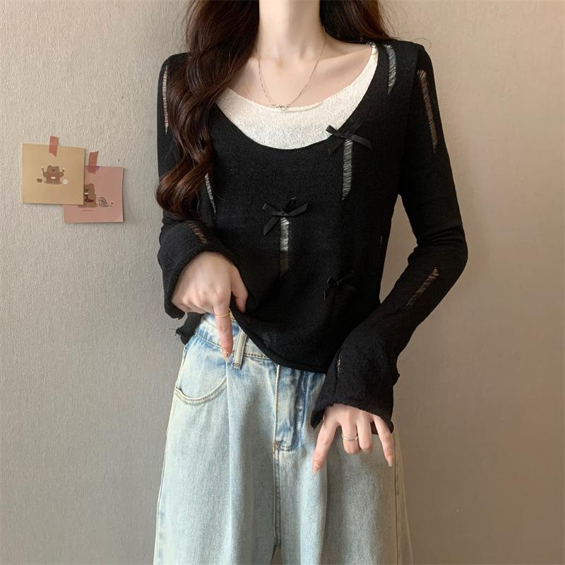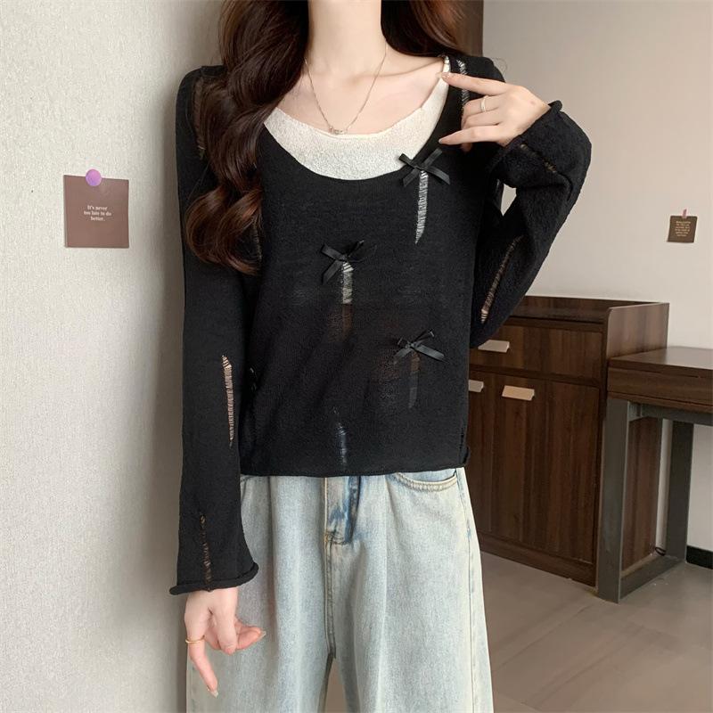 Camiseta de Contraste de Dos Piezas Falsas con Lazo para Mujer Otoño Delgada Única Elegante Camisa de Punto Top Ajustado de Manga Larga