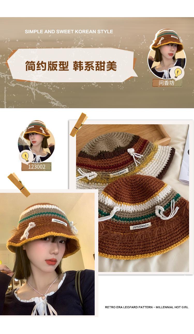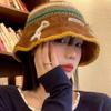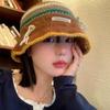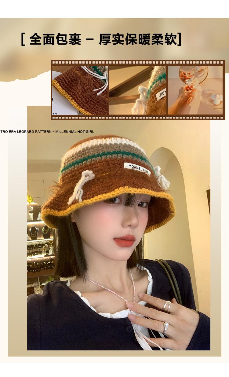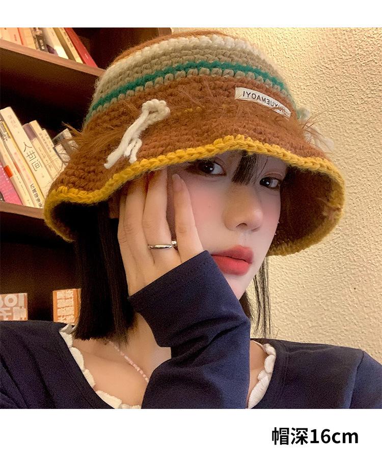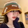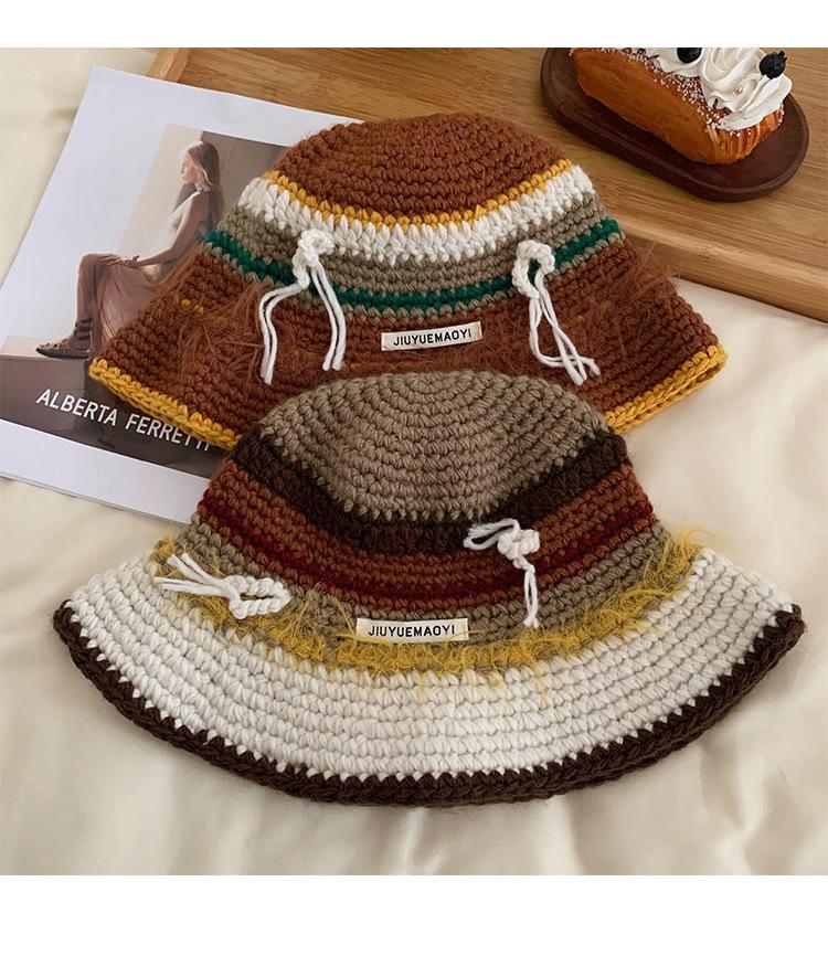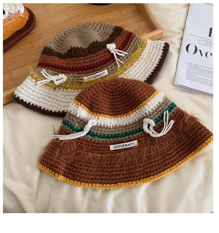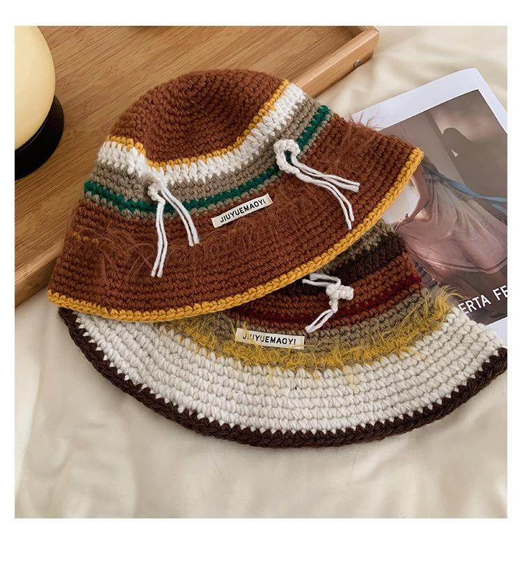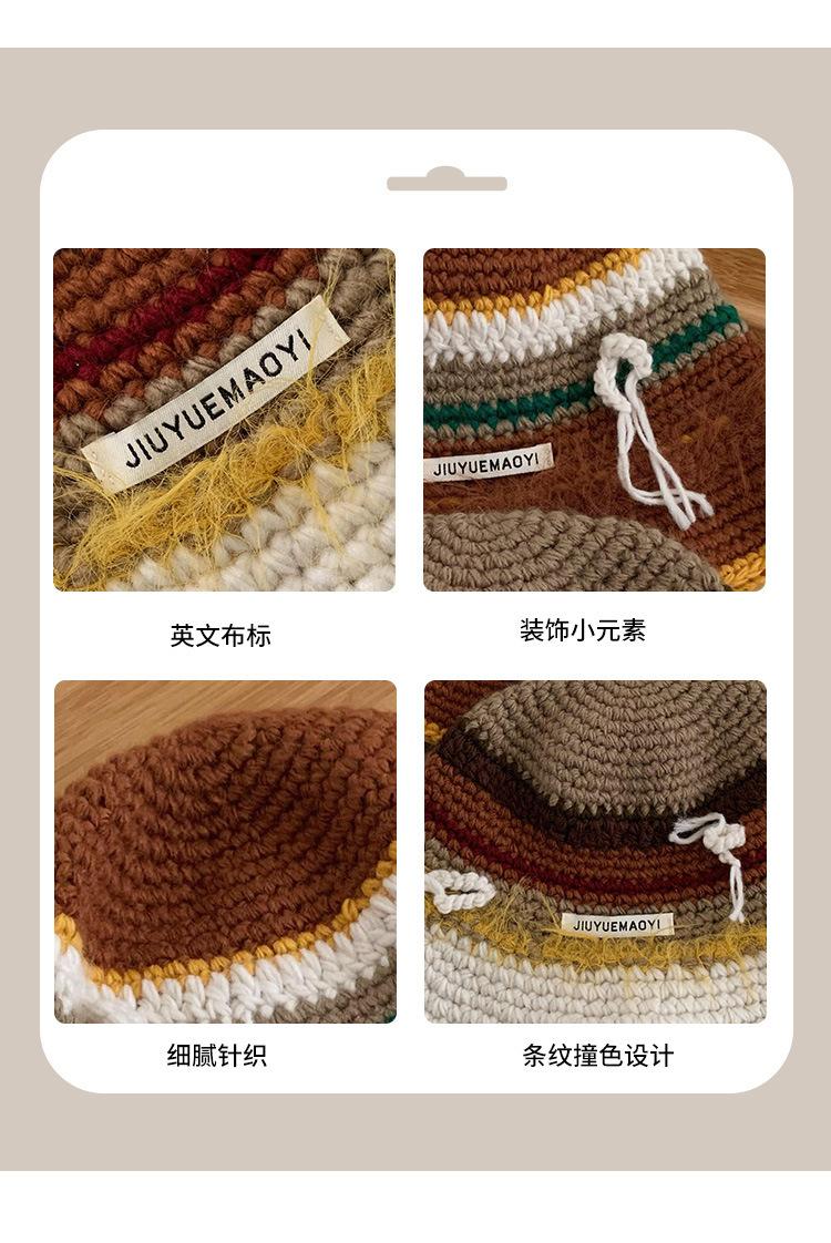 Sombrero de Pescador de Punto Japonés de Rayas con Combinación de Colores de Otoño e Invierno para Mujer, Retro, Combinable con Todo, Tipo Cubo para Cabeza Grande y Gorro de Lana Pequeño