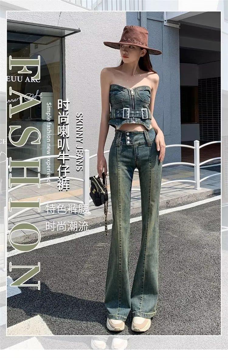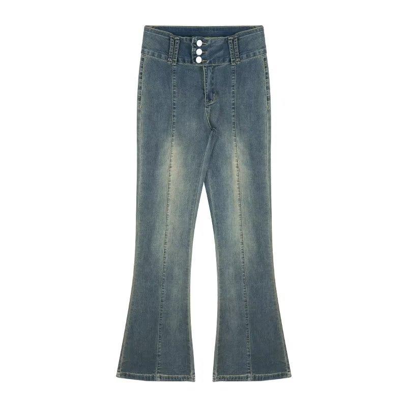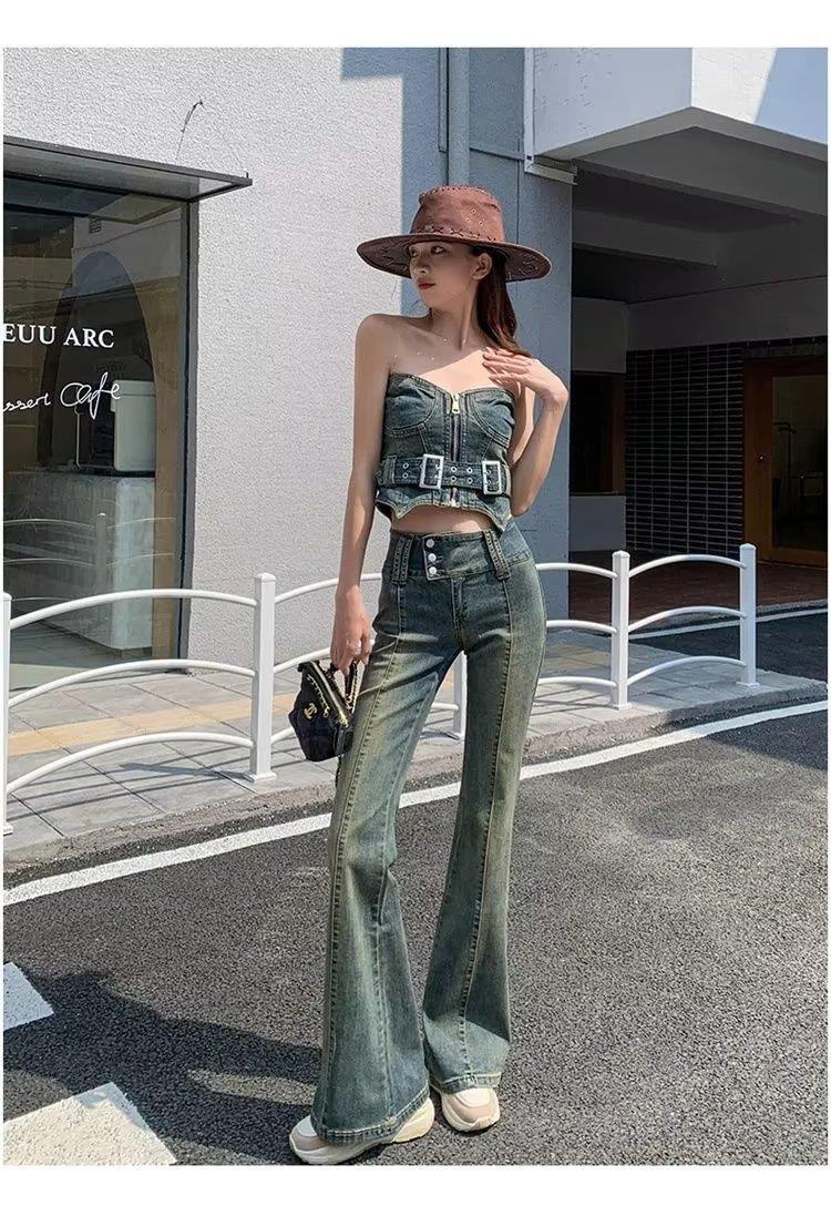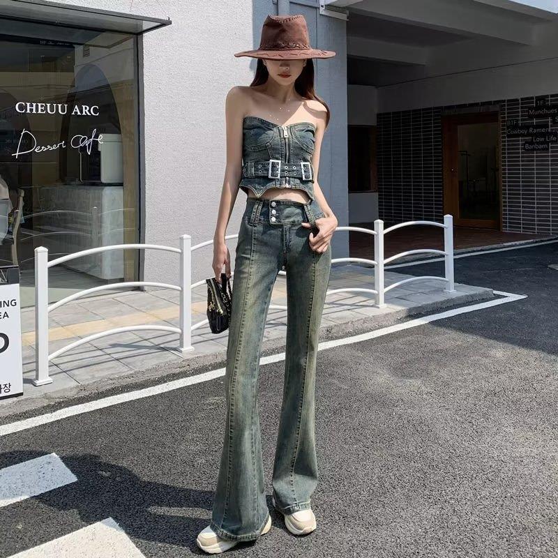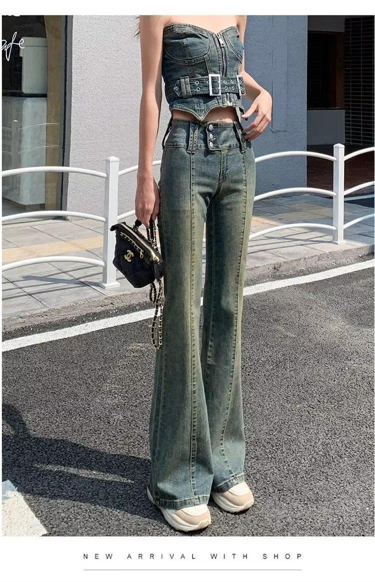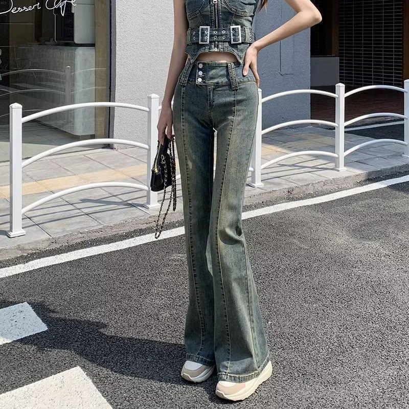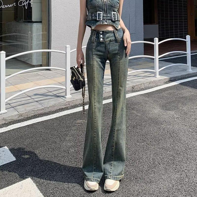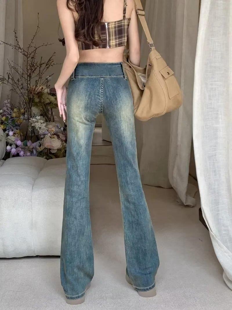 Vaqueros acampanados de cintura alta azul retro 2024 para mujer, nuevos diseños de verano, pantalones desgastados con diseño de nicho Sense