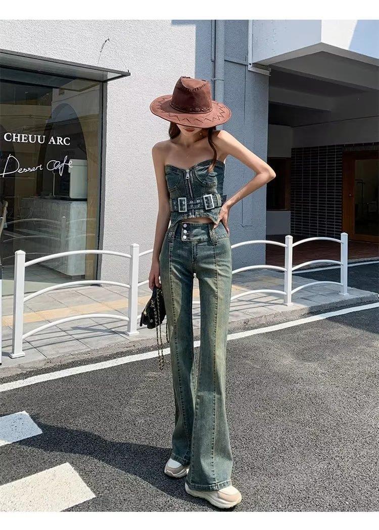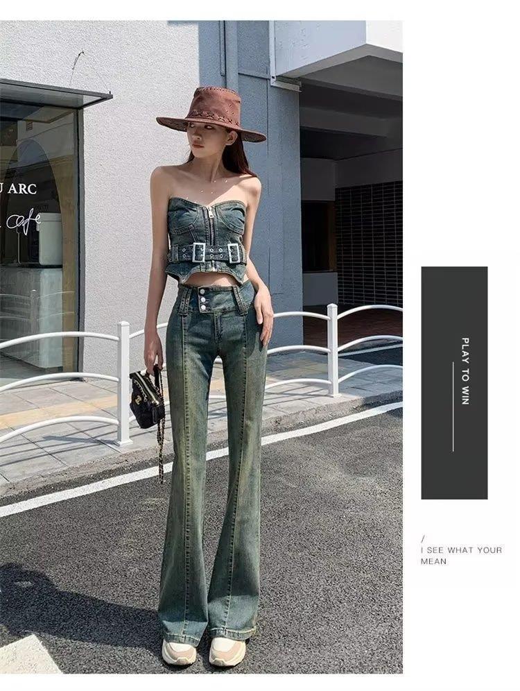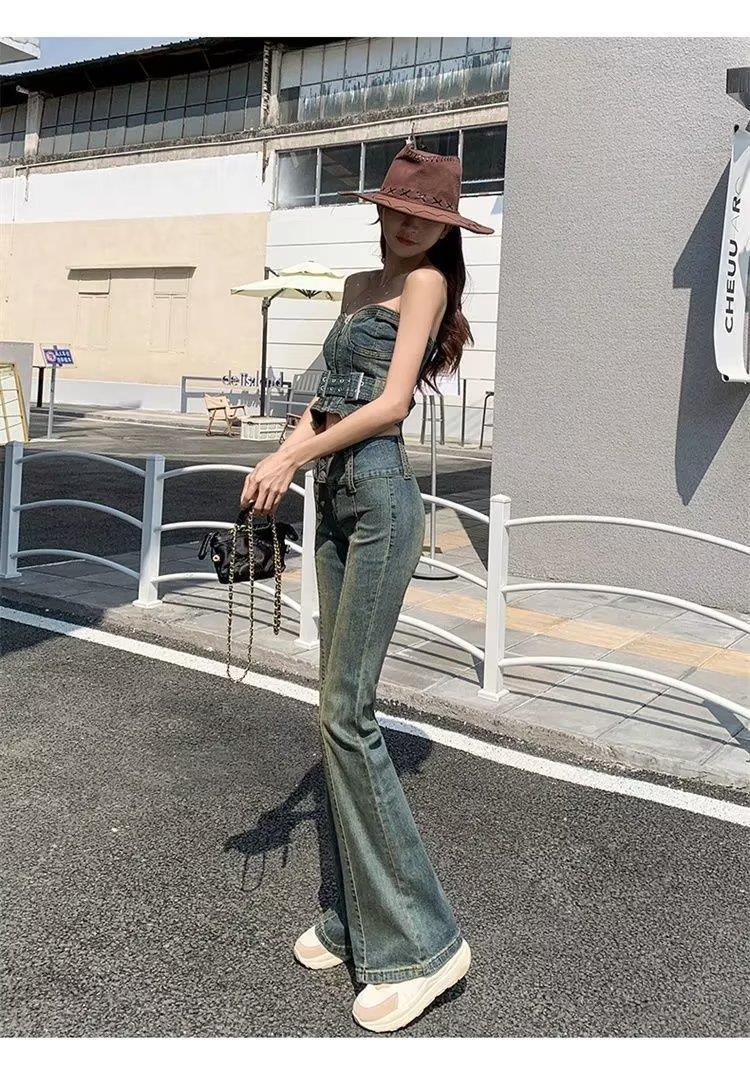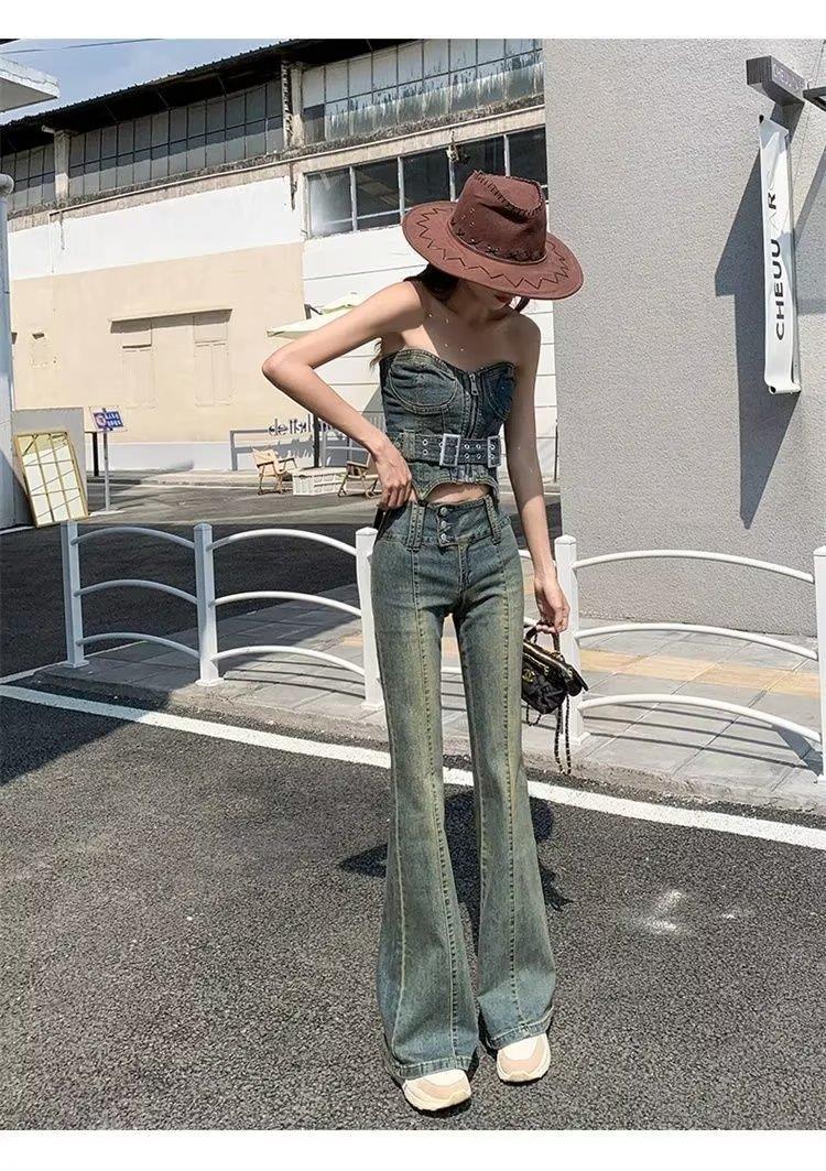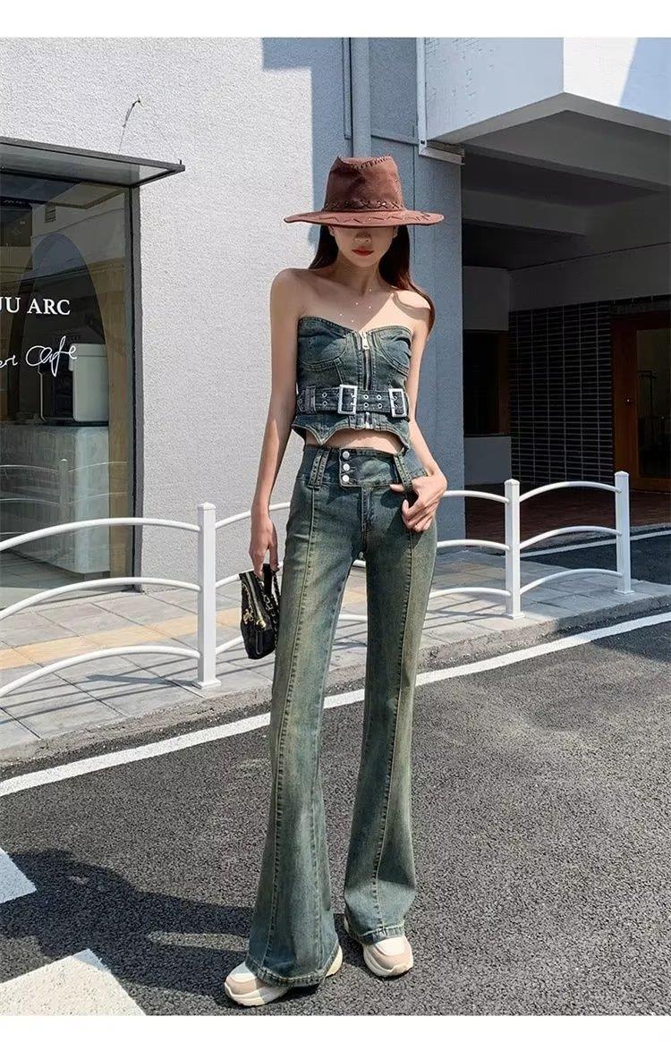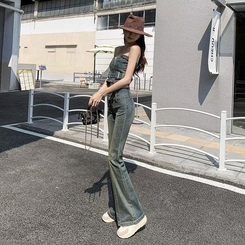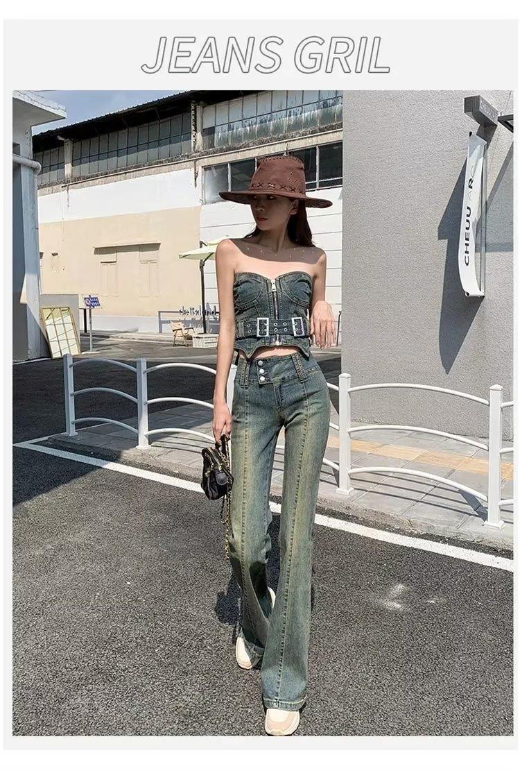 Vaqueros acampanados de cintura alta azul retro 2024 para mujer, nuevos diseños de verano, pantalones desgastados con diseño de nicho Sense