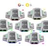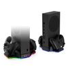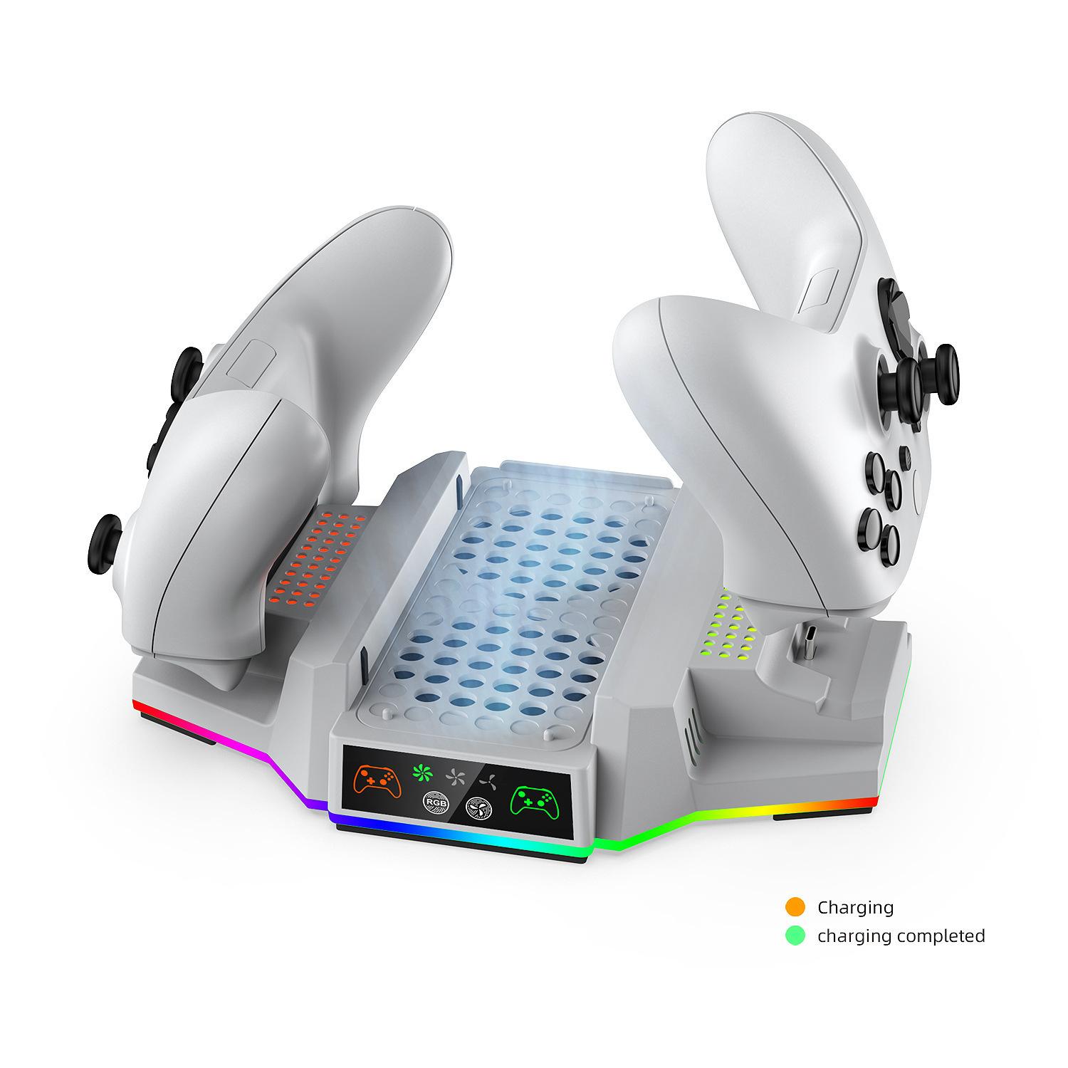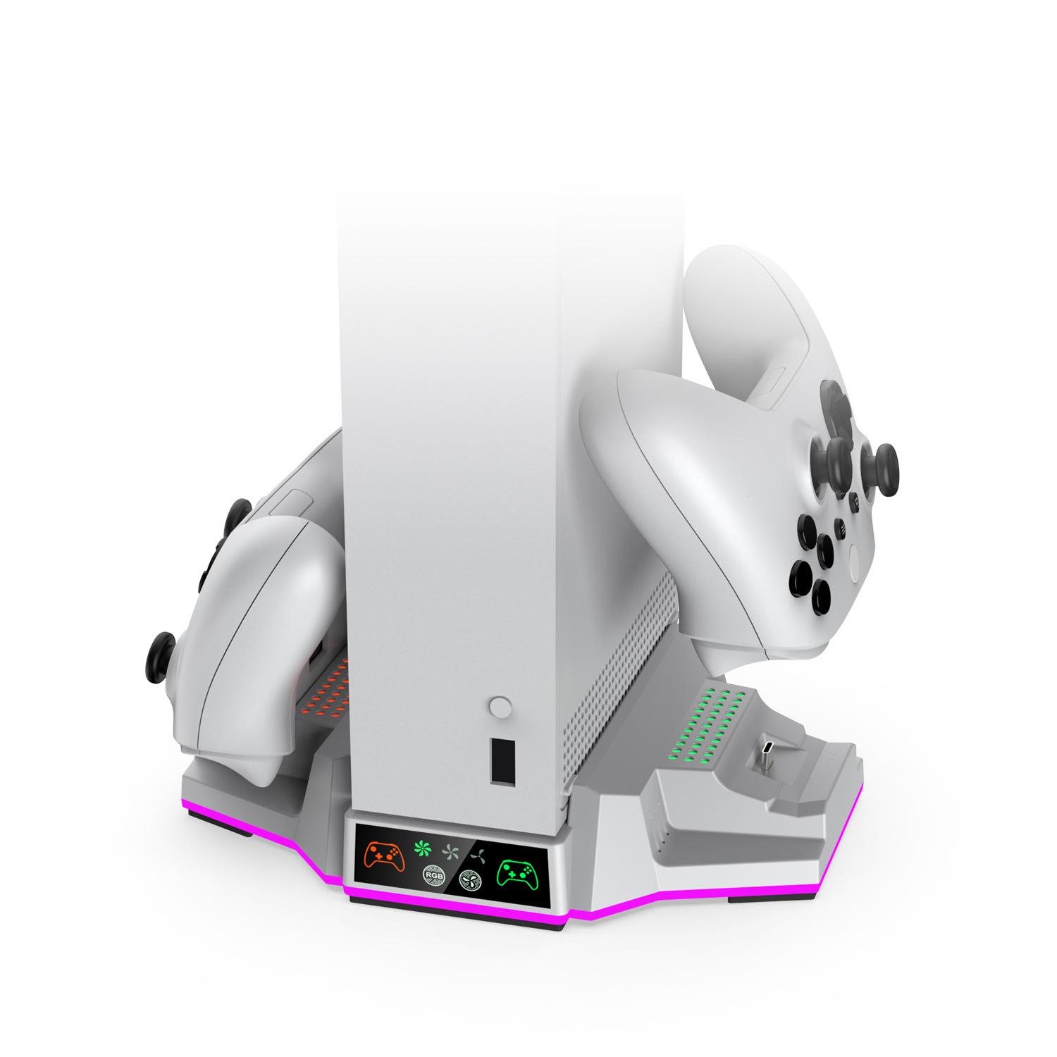 2. Chip de control inteligente de alta precisión integrado, control inteligente de velocidad del ventilador con memoria y modo de luz ambiental. Esta base no solo reduce la temperatura de funcionamiento de la consola Xbox Series S, sino que también permite cargar dos mandos Xbox simultáneamente (con batería TYX-3607) y muestra el estado de carga mediante los iconos correspondientes en el panel y los orificios de la luz de matriz a ambos lados. El anillo de luz ambiental RGB está ubicado en la parte inferior del producto, y sus diferentes modos se pueden ajustar mediante la tecla táctil RGB del panel de control frontal.