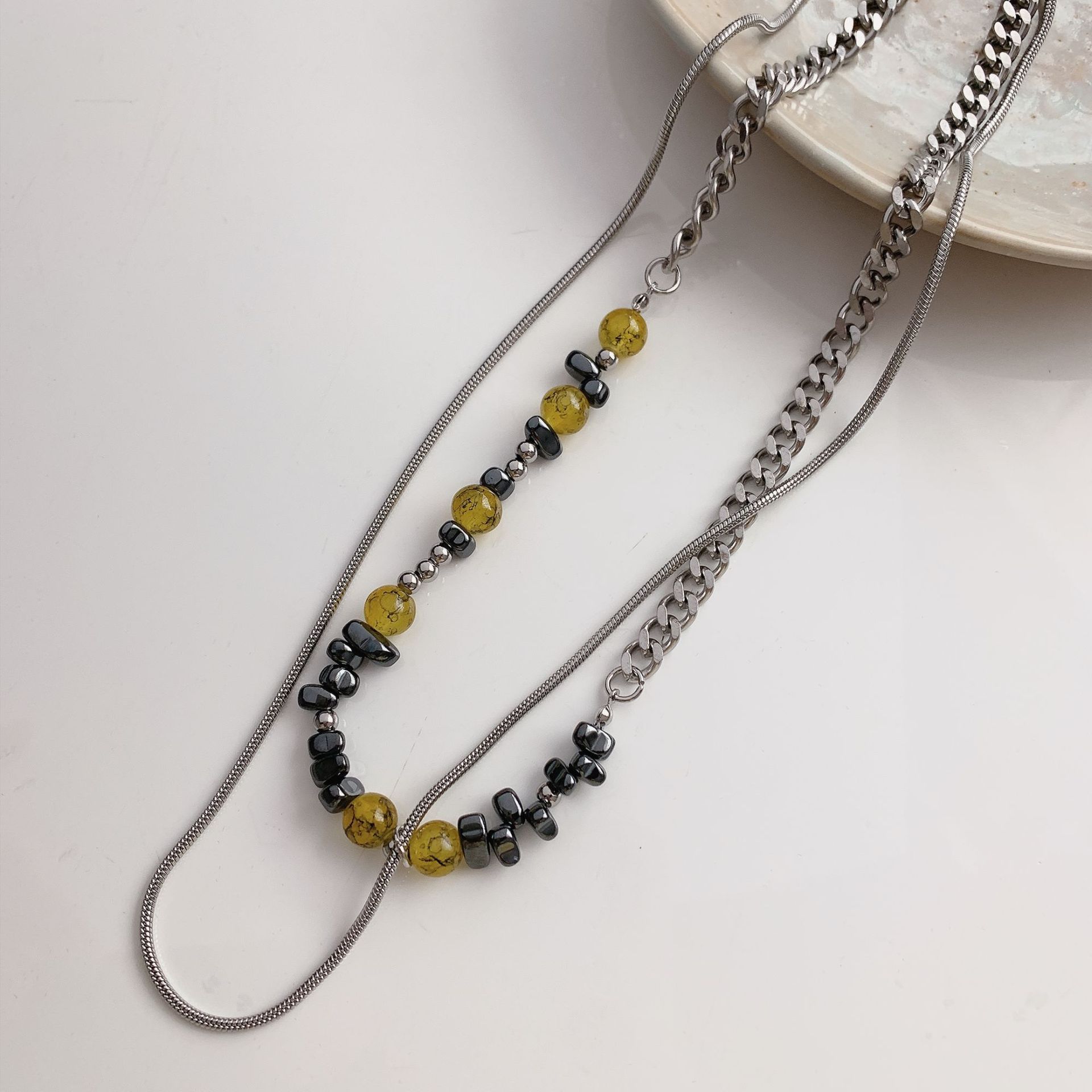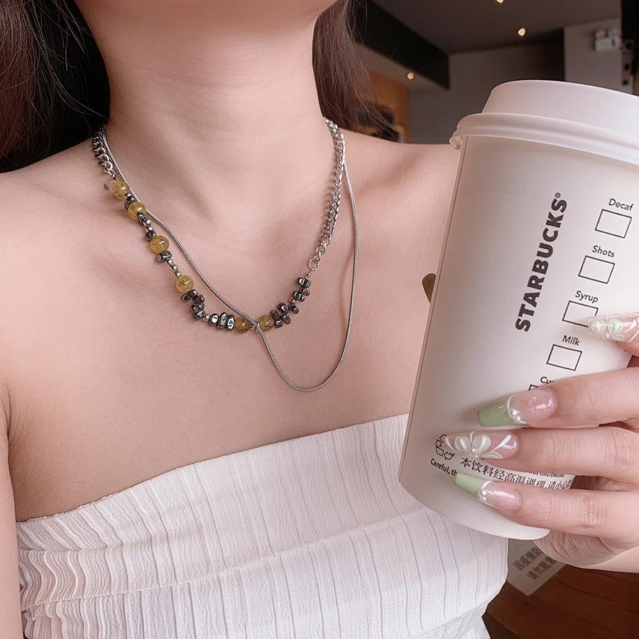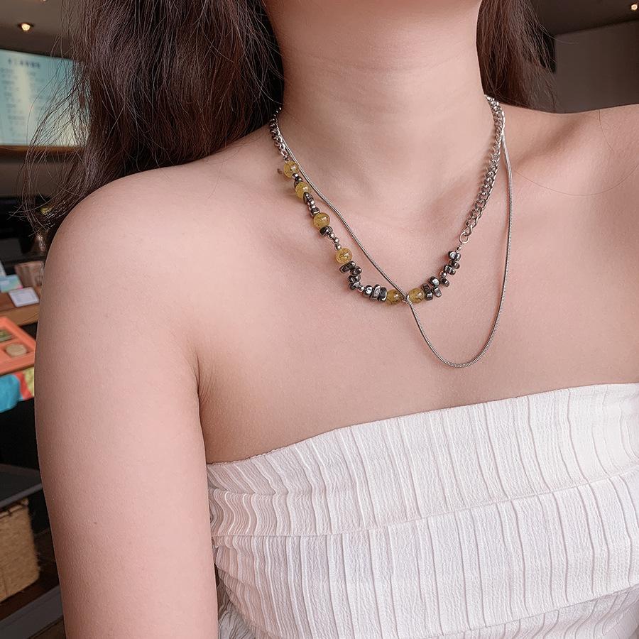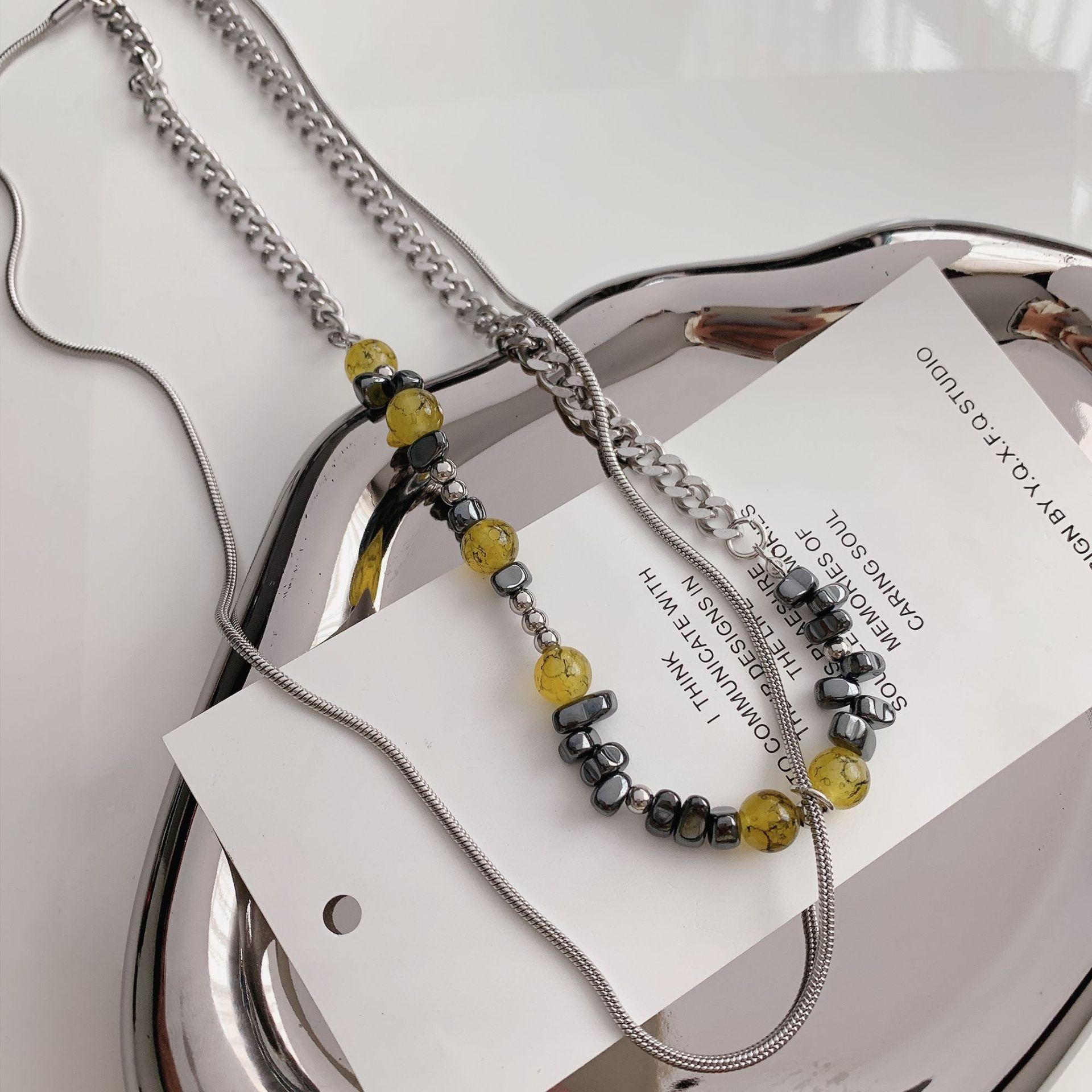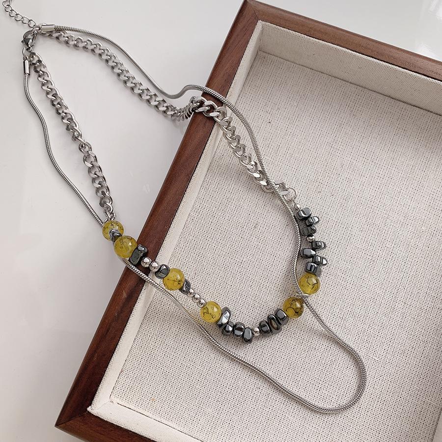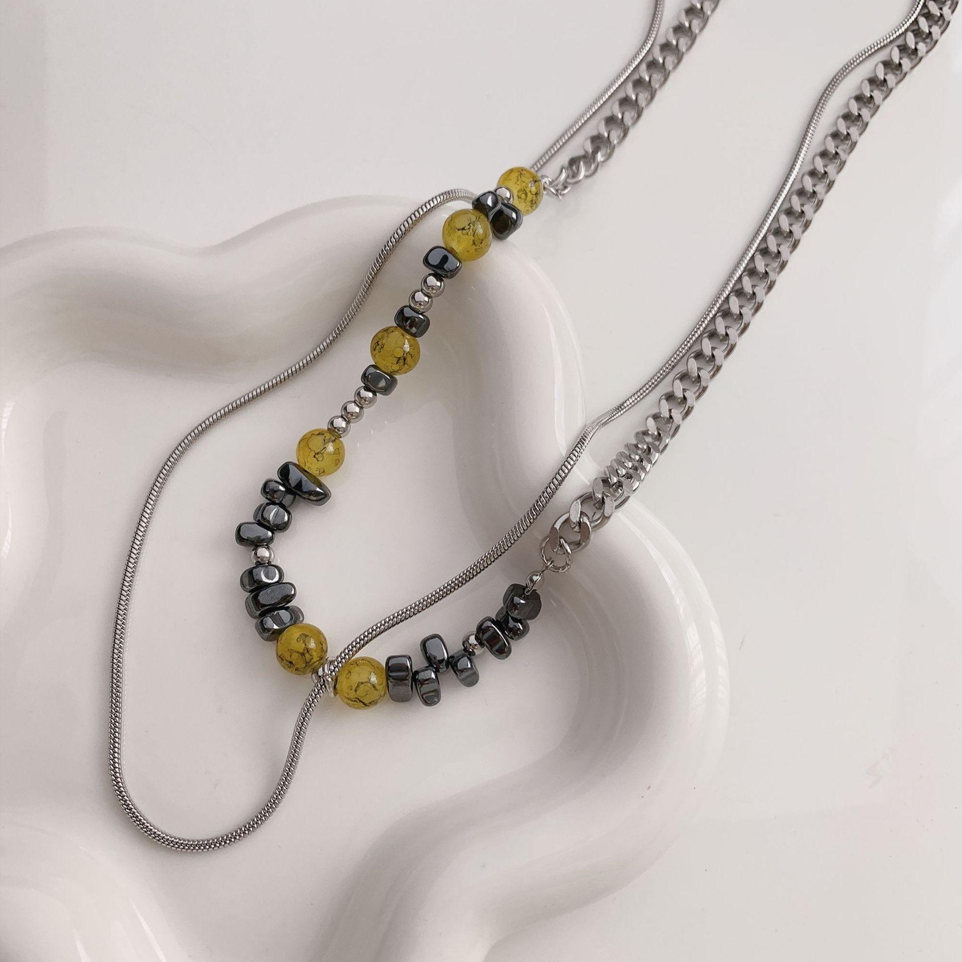 Nuevo collar chino de cadena de acero de titanio con piedra irregular de color tierra y costuras de hueso de serpiente, cadena de clavícula para pareja, dulce y genial.