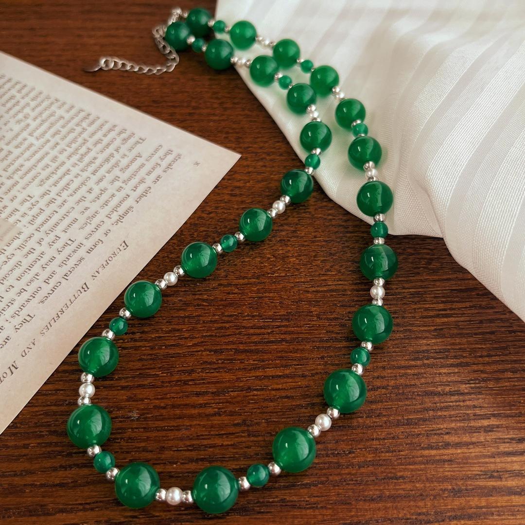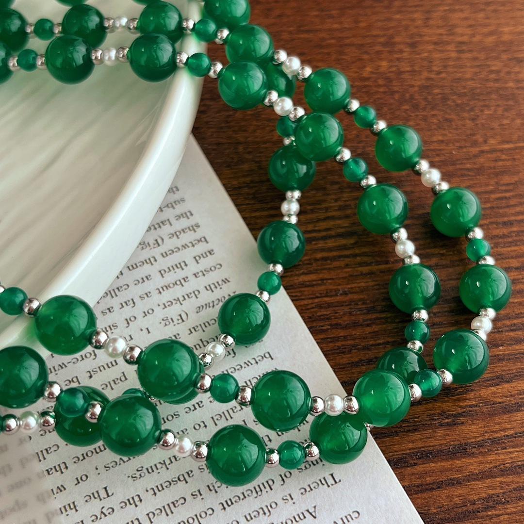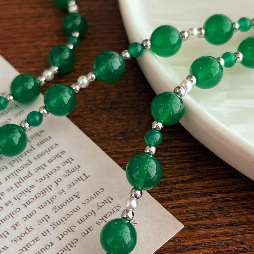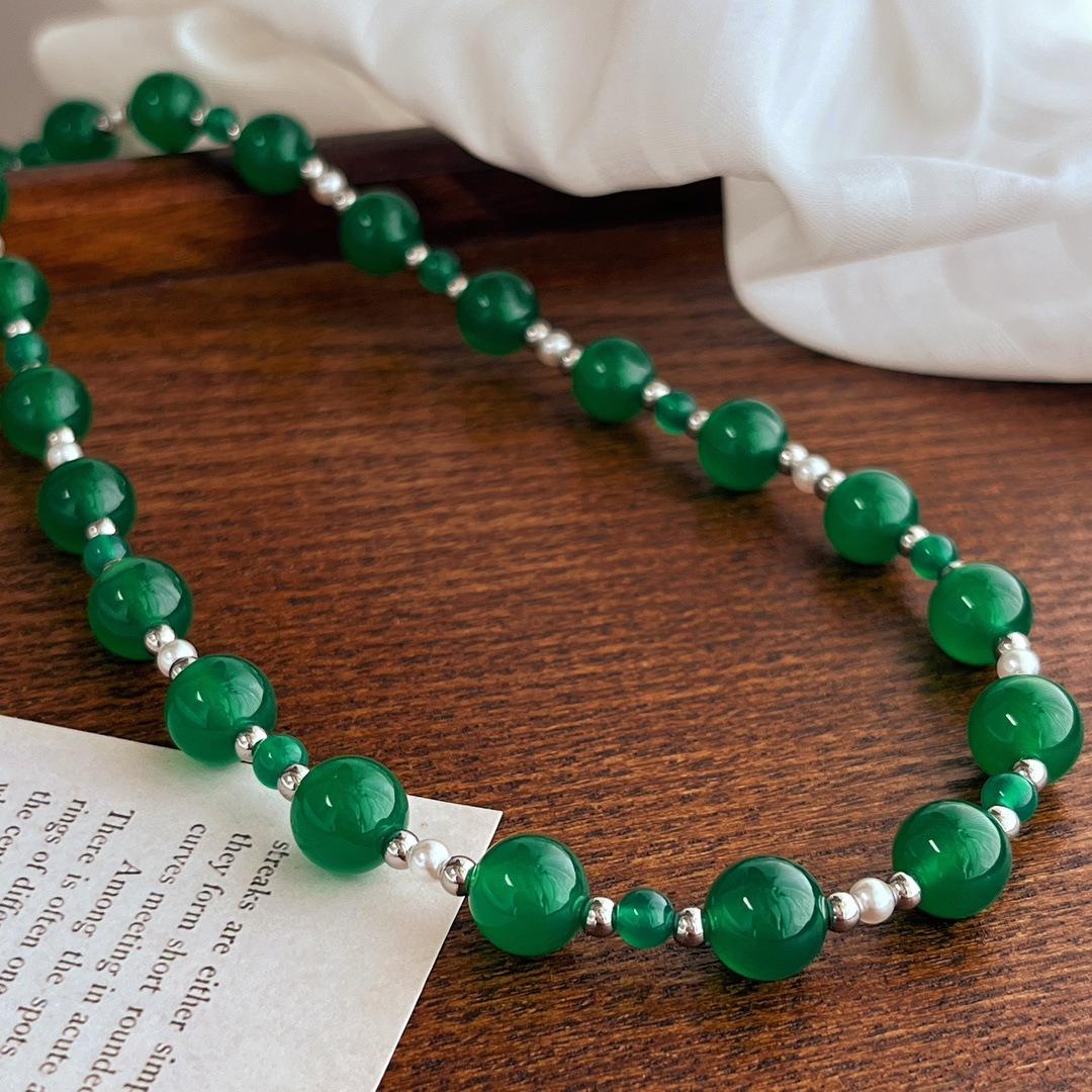 Collar Retro Fresco Calcedonia Verde Natural Shijia Perla Blanca Fría Gipsófila Ágata Cadena para Clavícula para Mujer