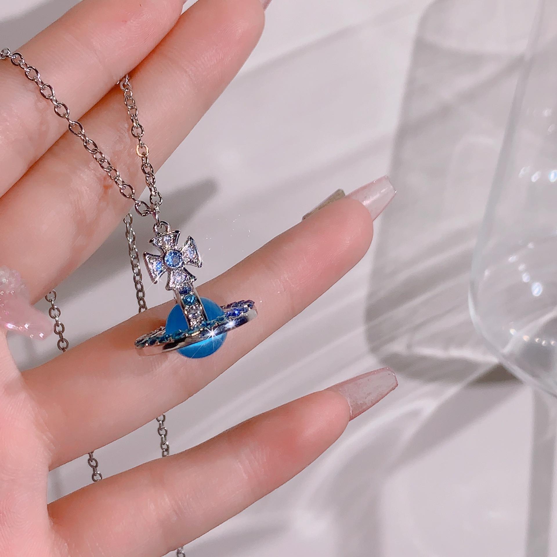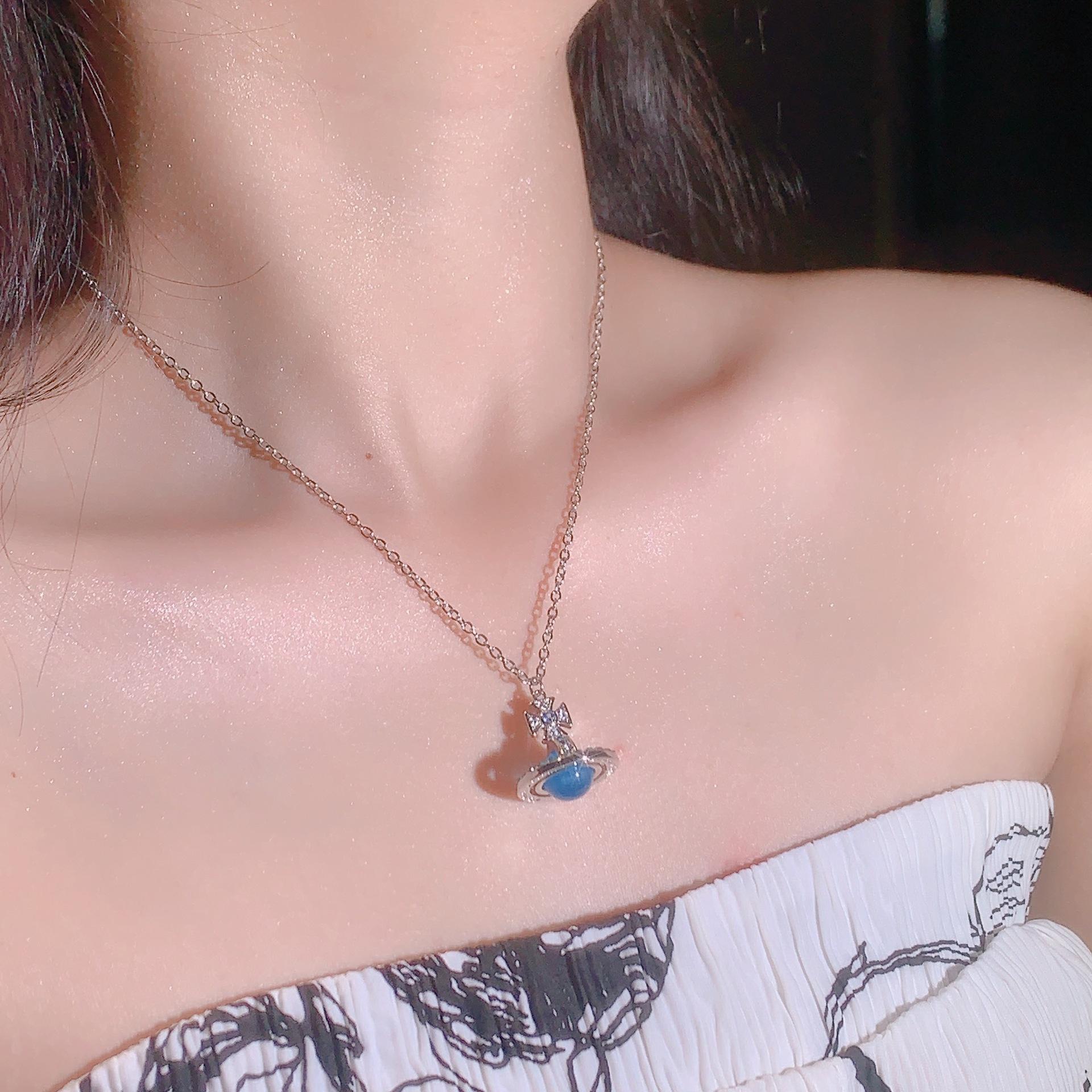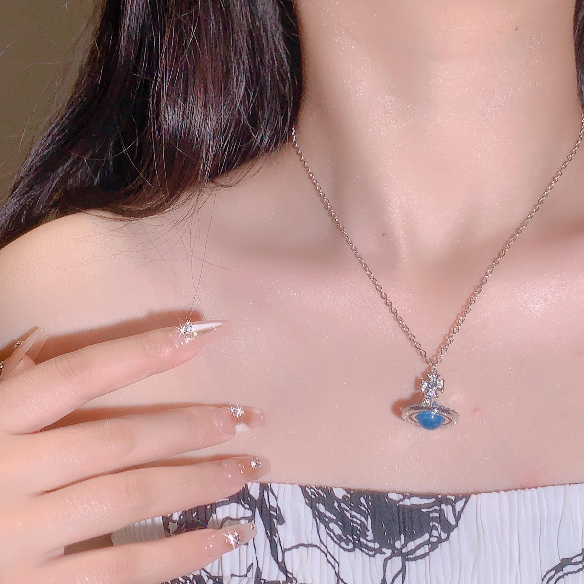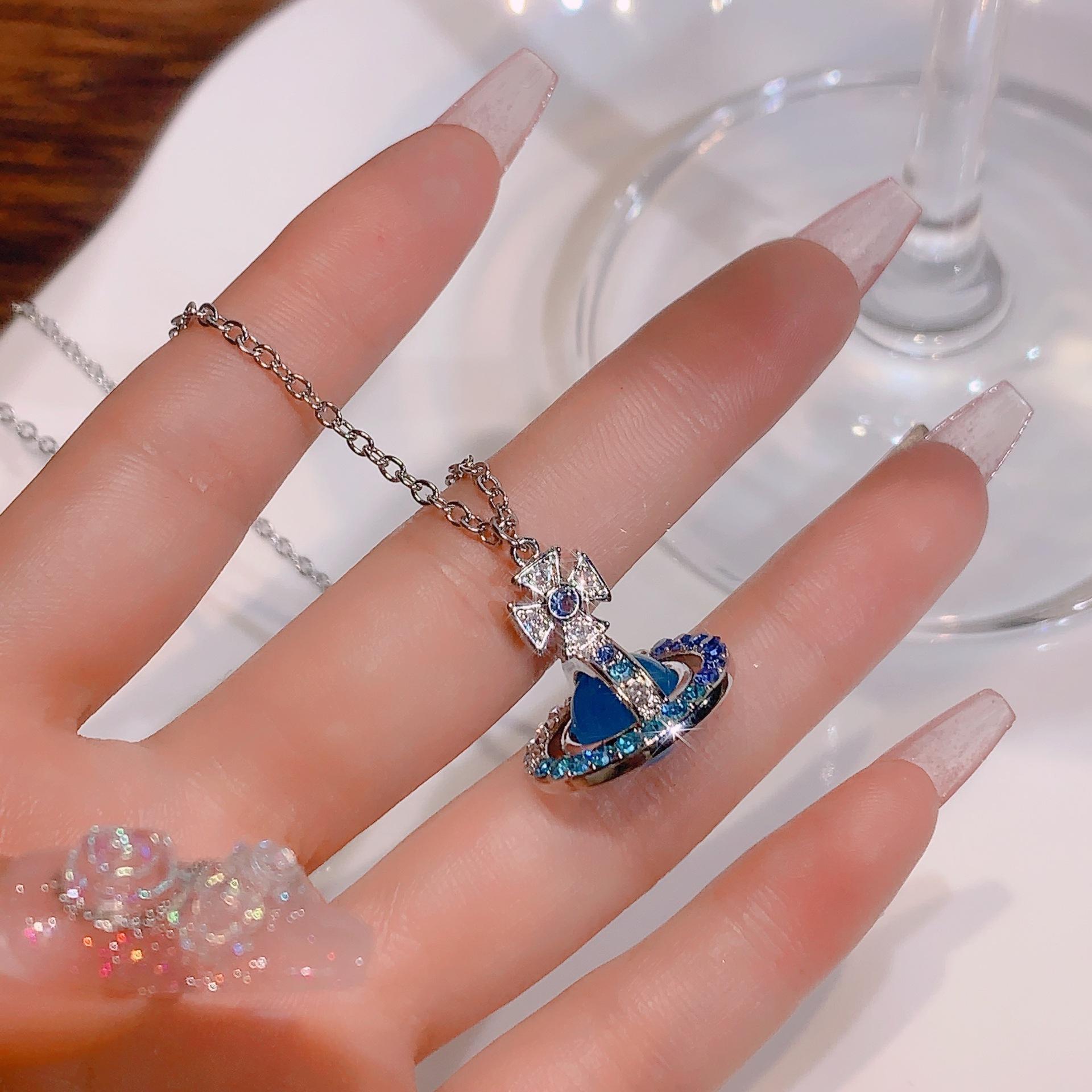 Collar Planeta Saturno Aretes para Mujer Cristal Colorido Diseño Nicho de Alta Gama Aretes Planeta Diamante Completo Cadena Clavícula