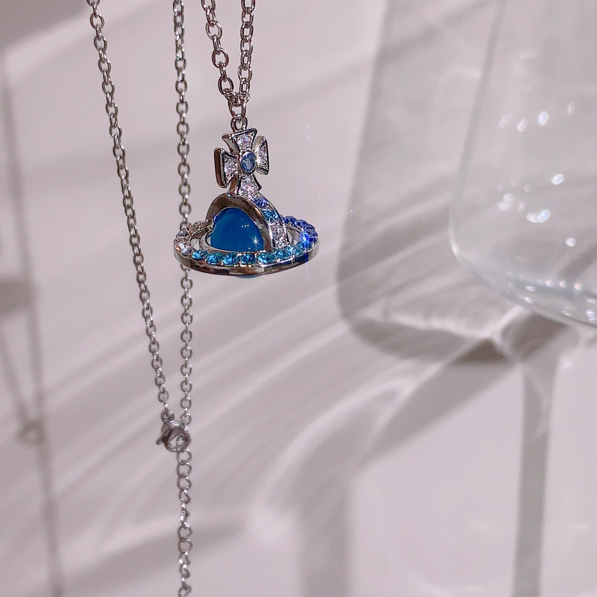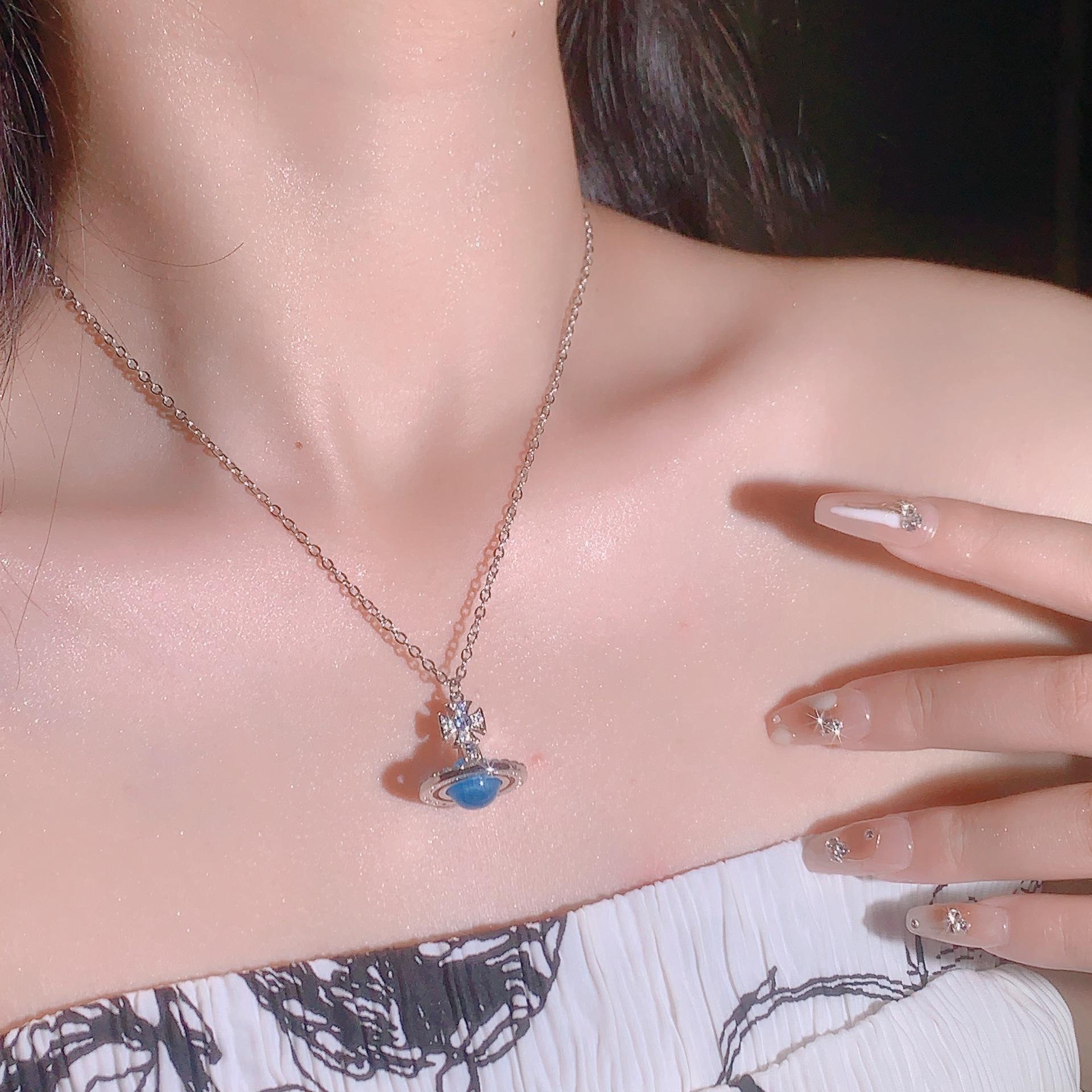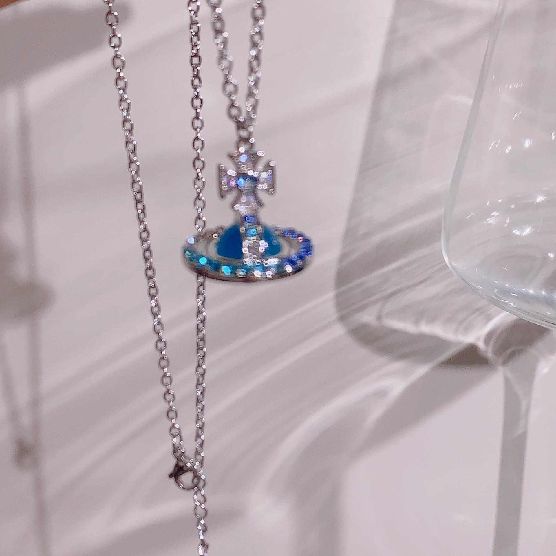 Collar Planeta Saturno Aretes para Mujer Cristal Colorido Diseño Nicho de Alta Gama Aretes Planeta Diamante Completo Cadena Clavícula