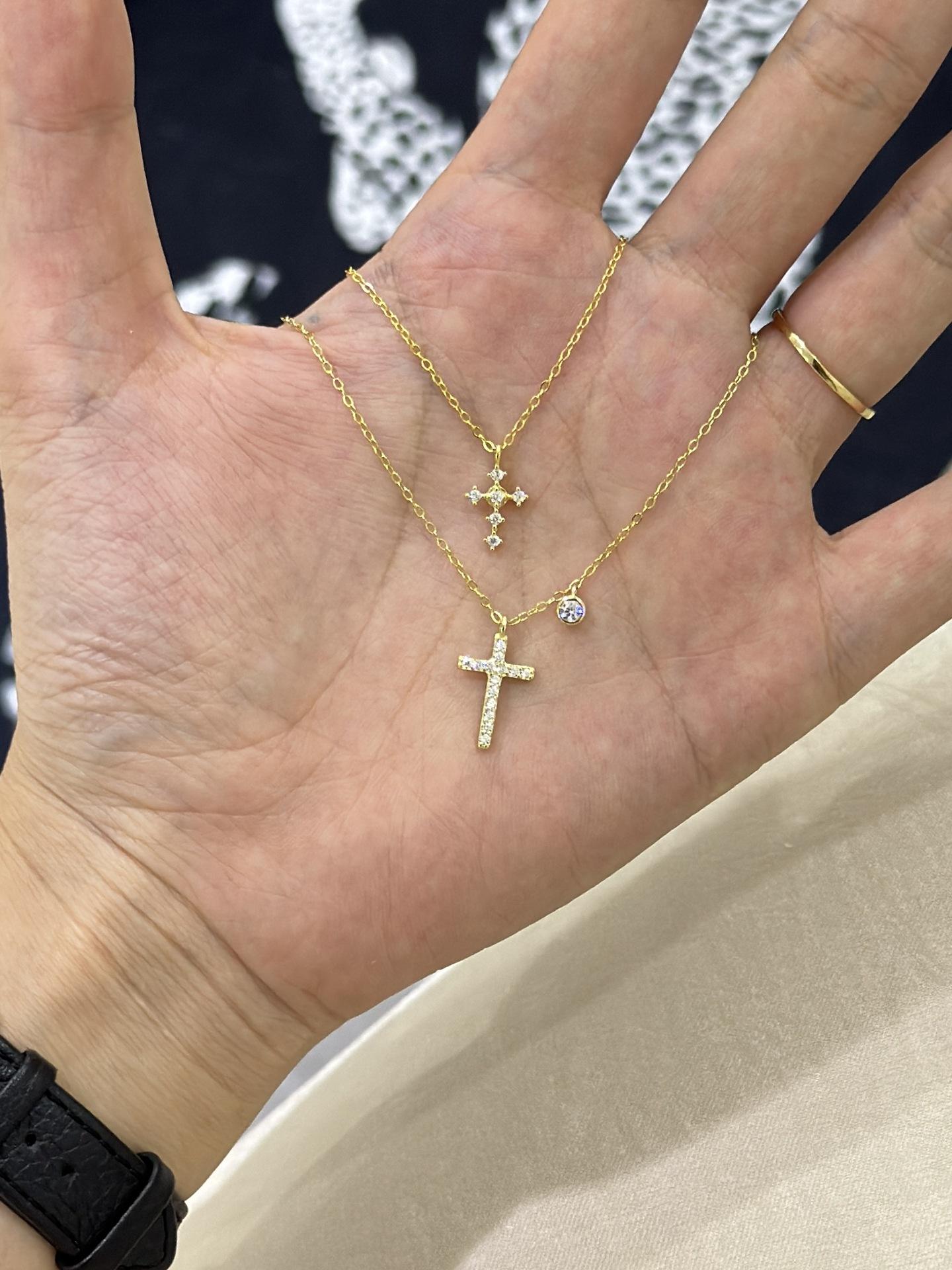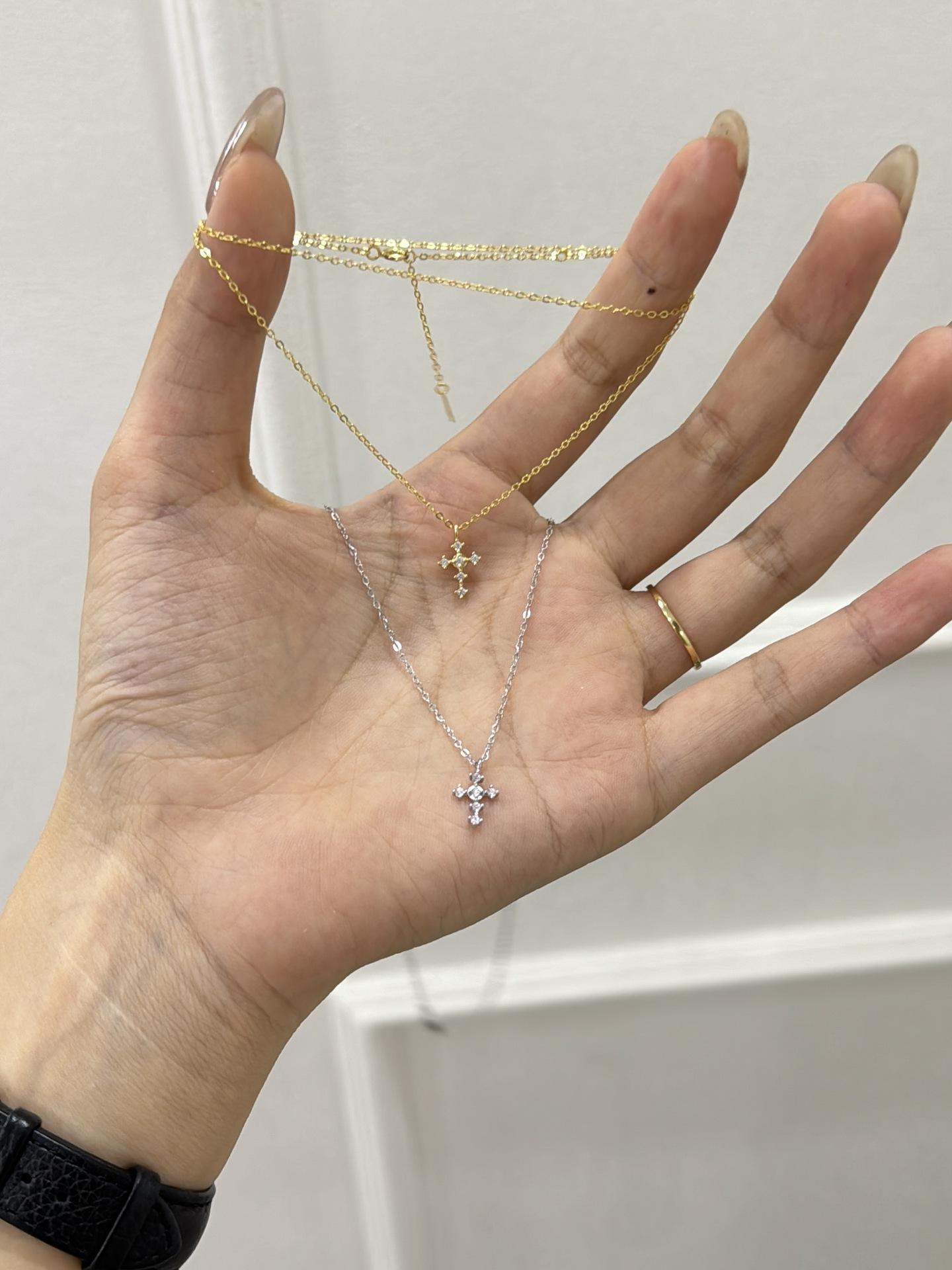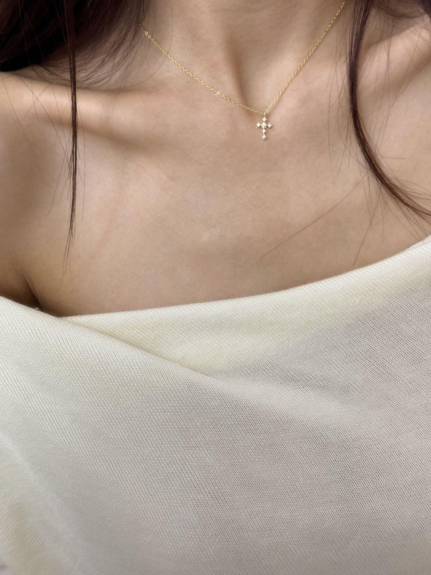 Collar elegante con mini cruz de circonitas apiladas y chapado en oro de 14 quilates en plata de ley S925 para mujer.