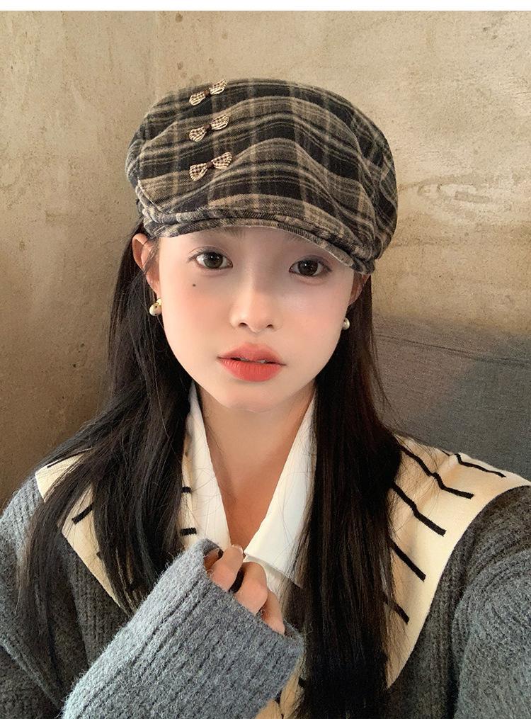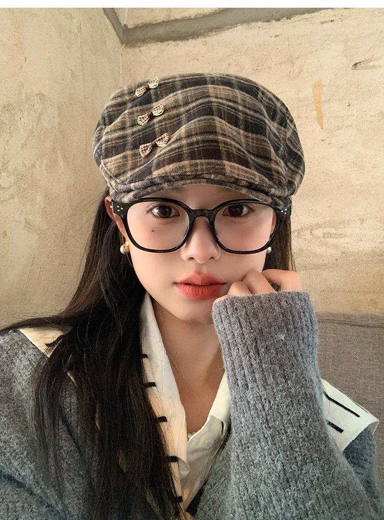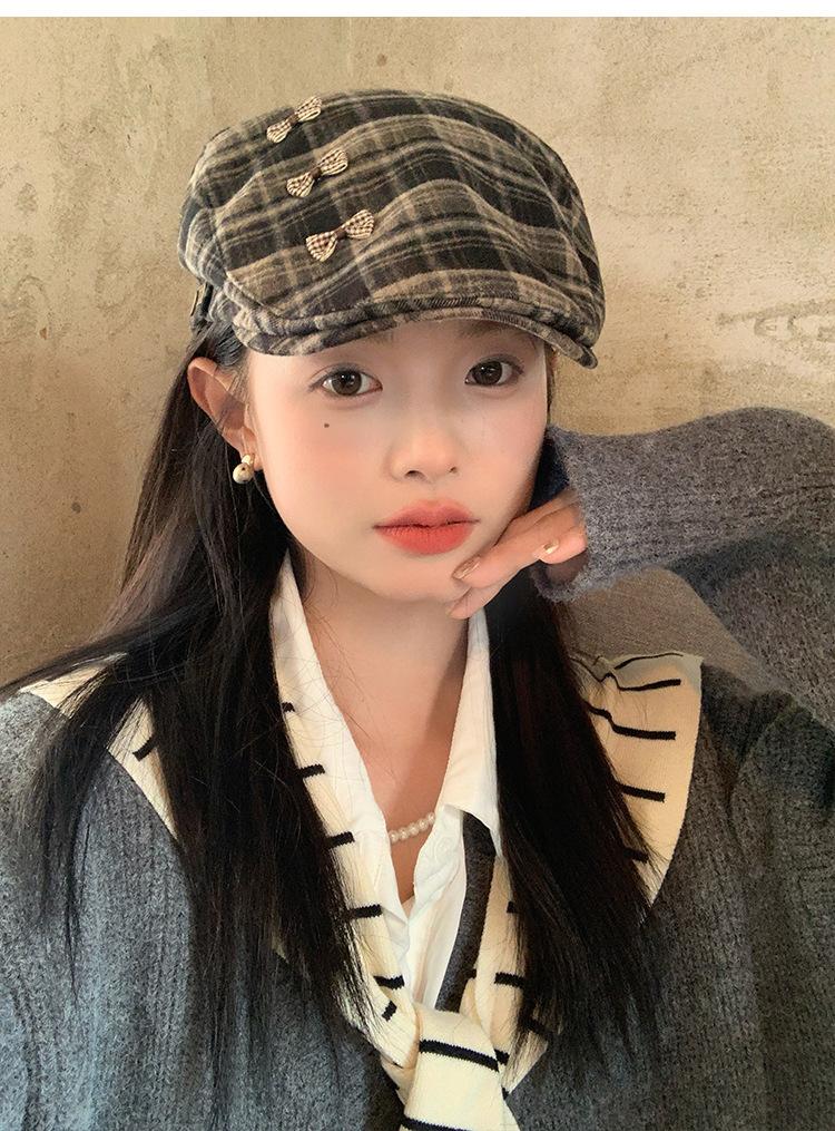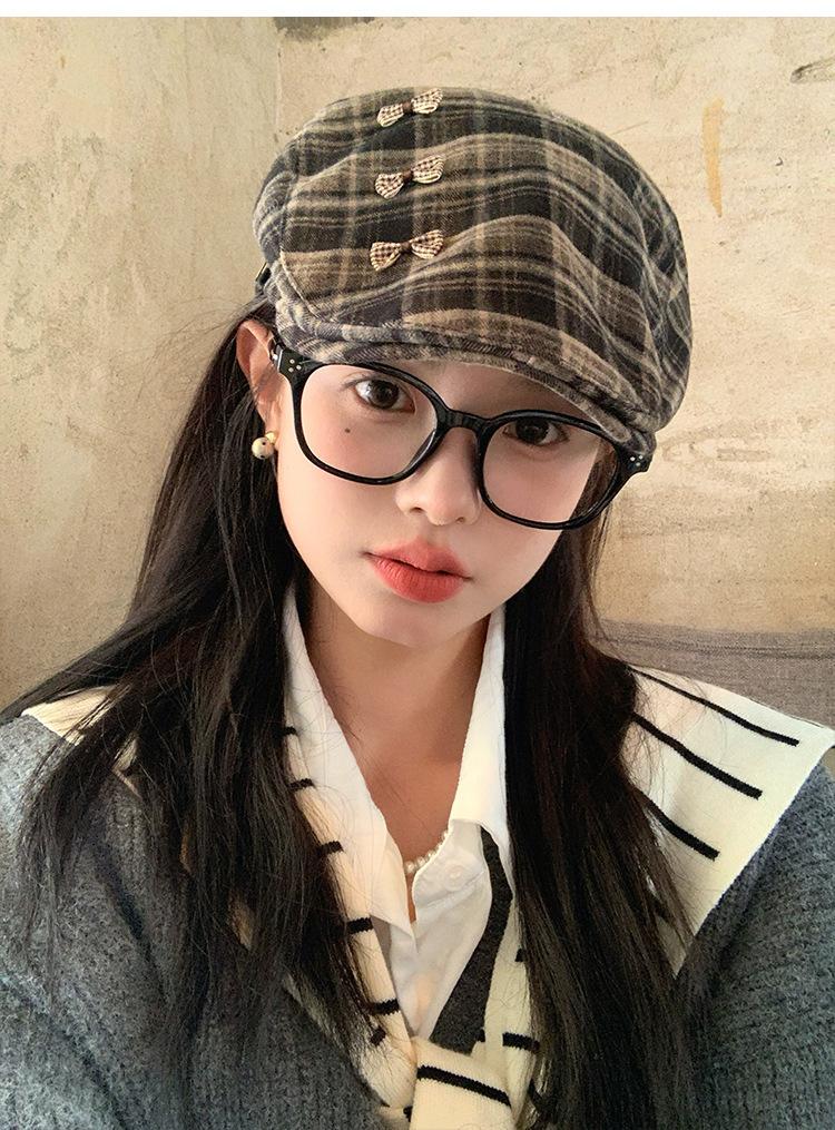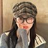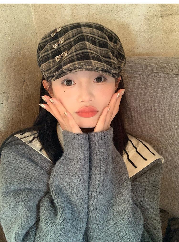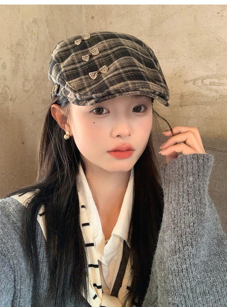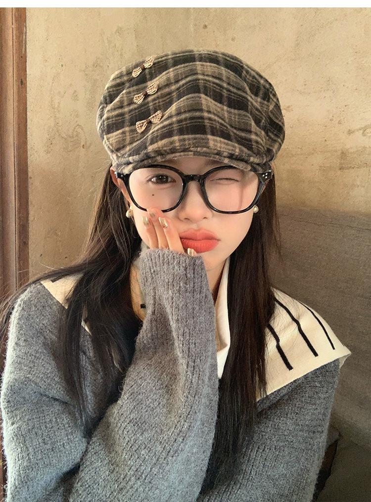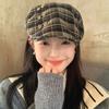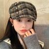 Otoño e Invierno DIY Lazo a Cuadros Gorra Plana para Mujer 2024 Nuevo Versátil Antirostro Boina Pequeña Nicho