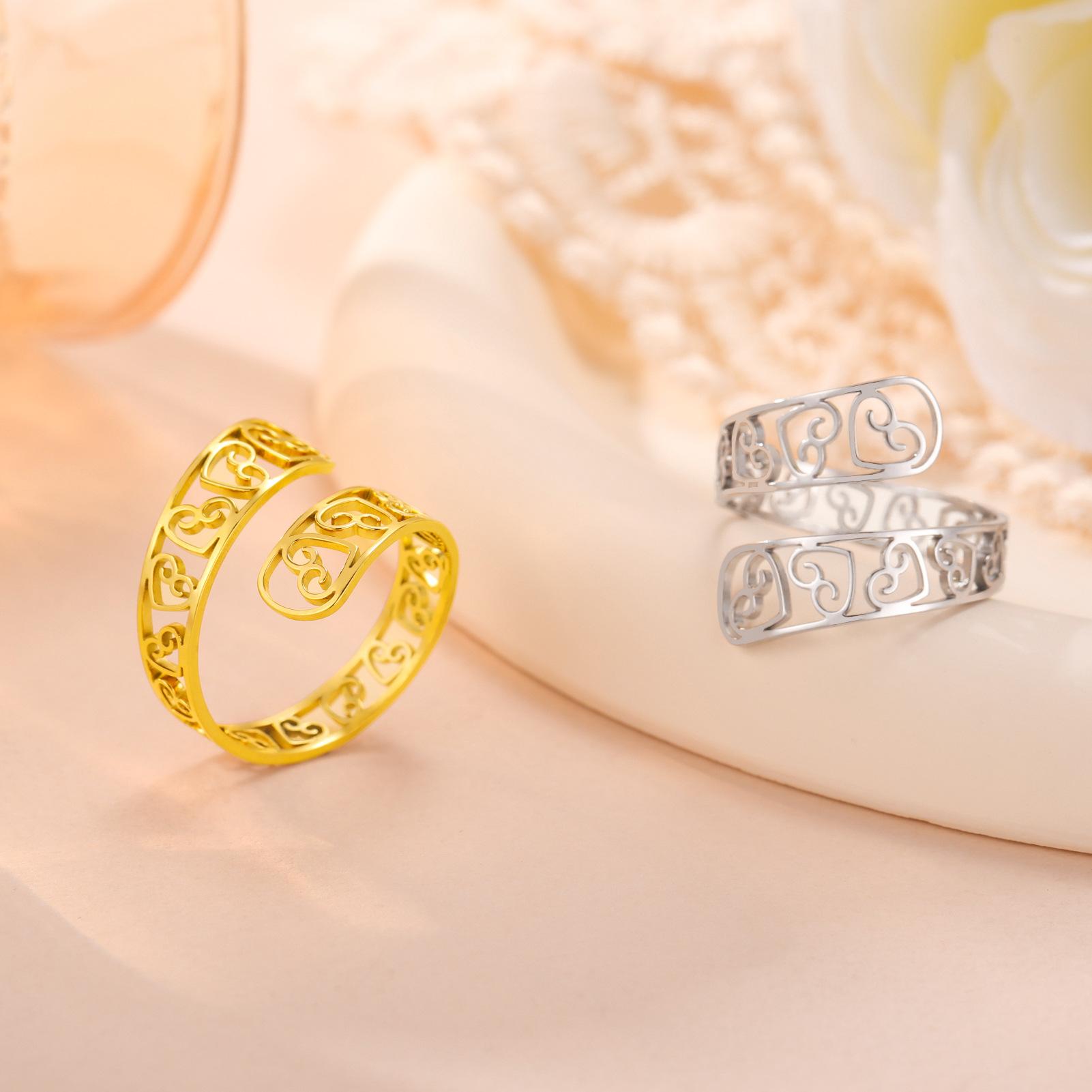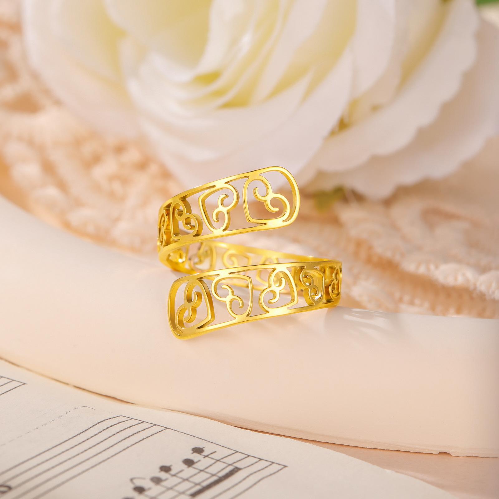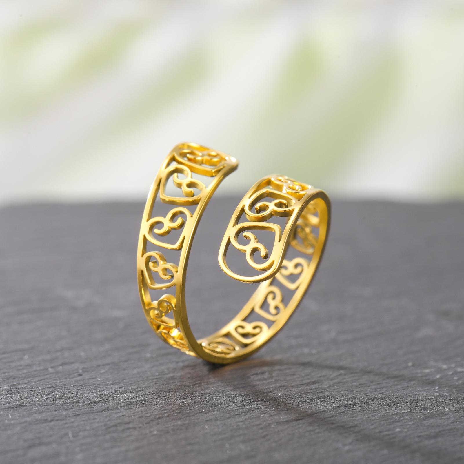Anillo de acero de titanio dorado con corte de moda simple transfronterizo, amor hueco arriba y abajo, apertura envolvente irregular, acero inoxidable