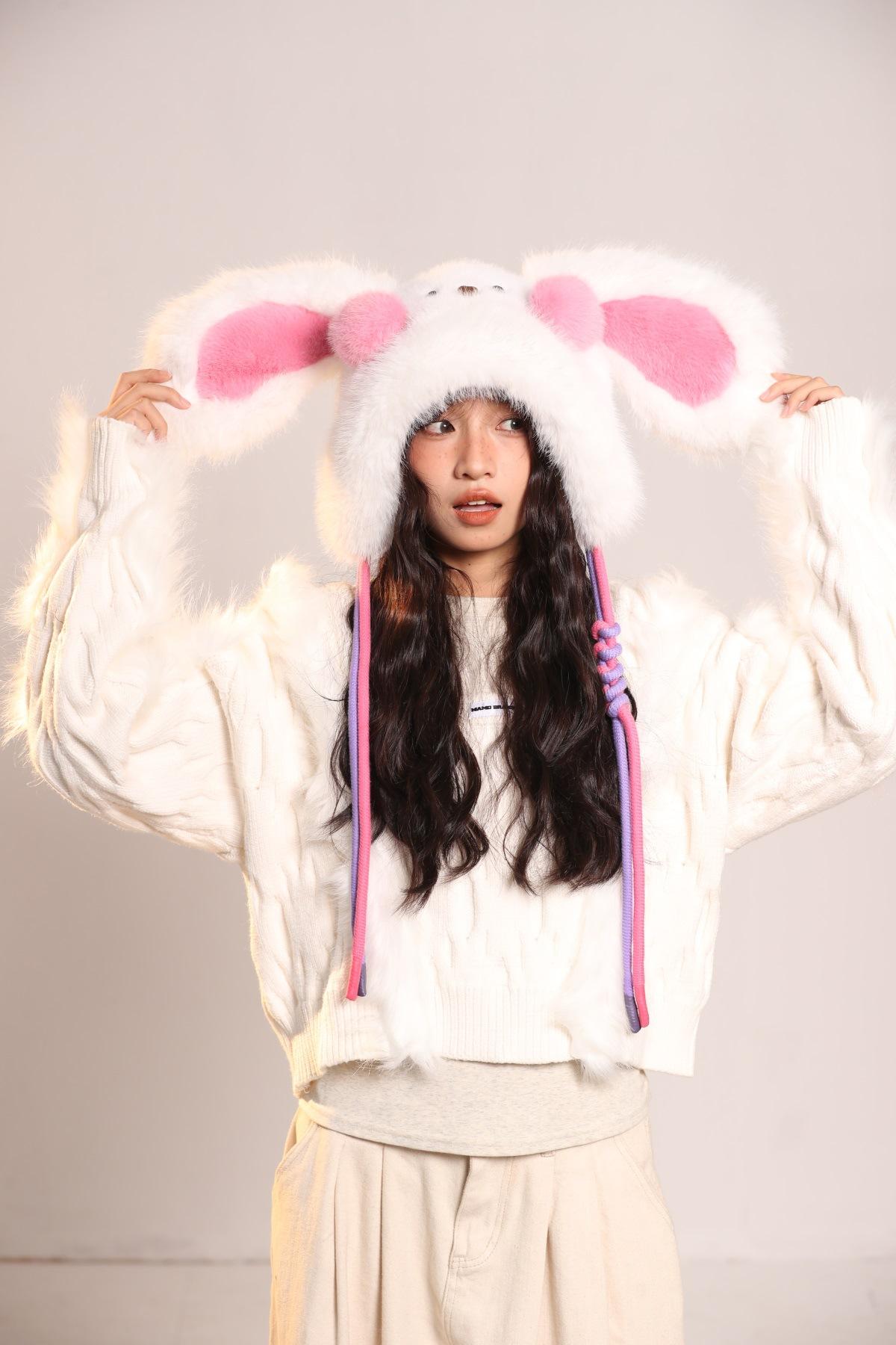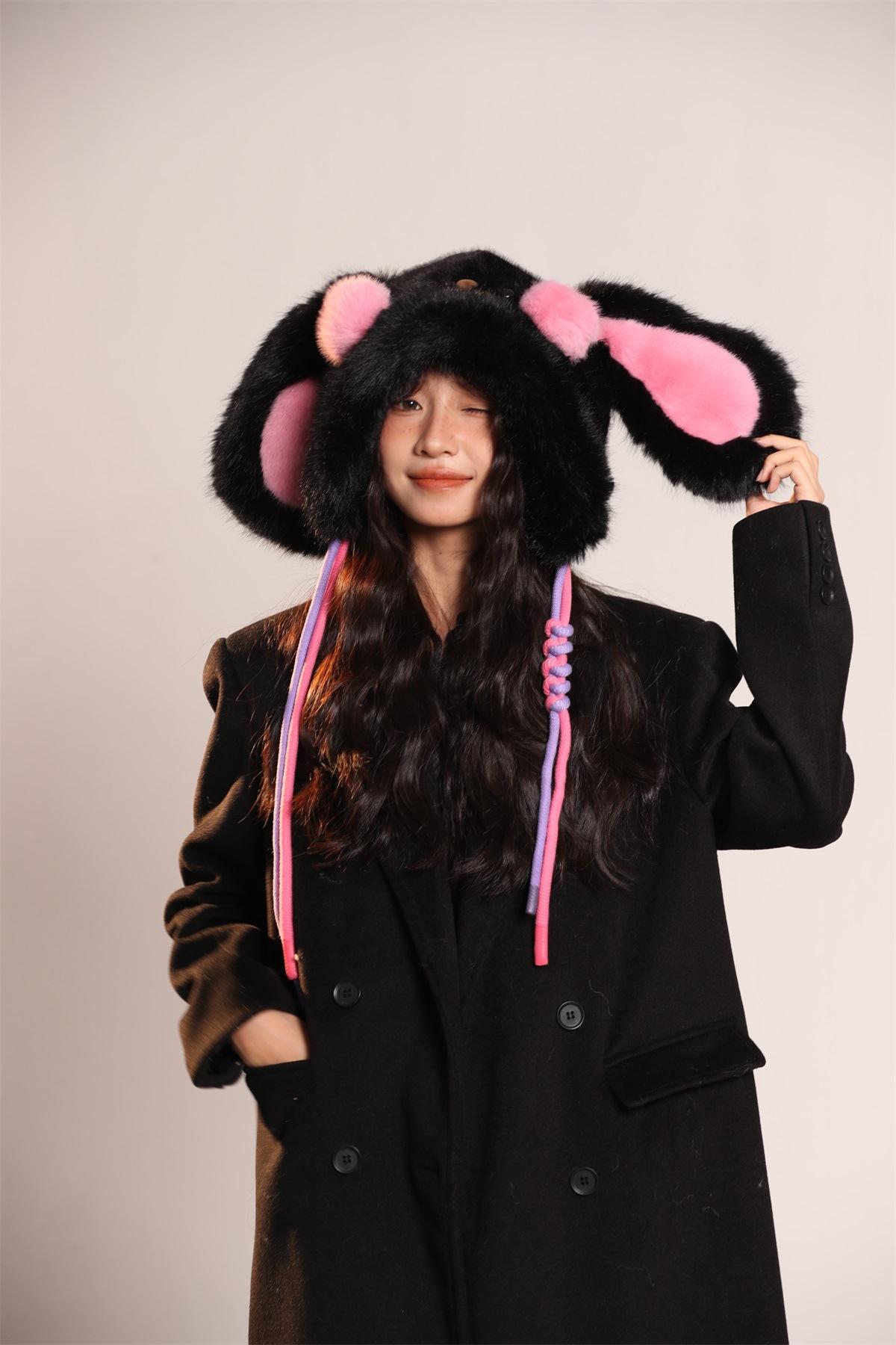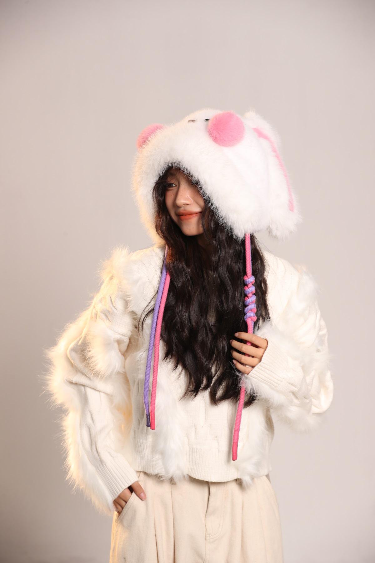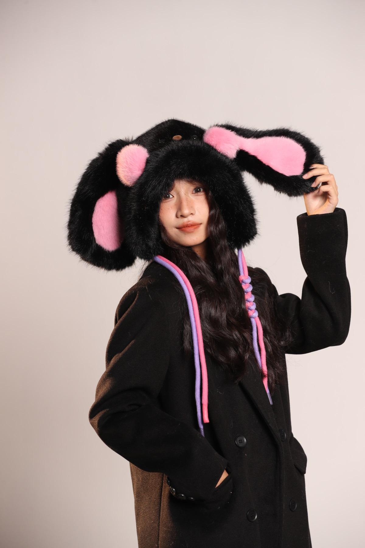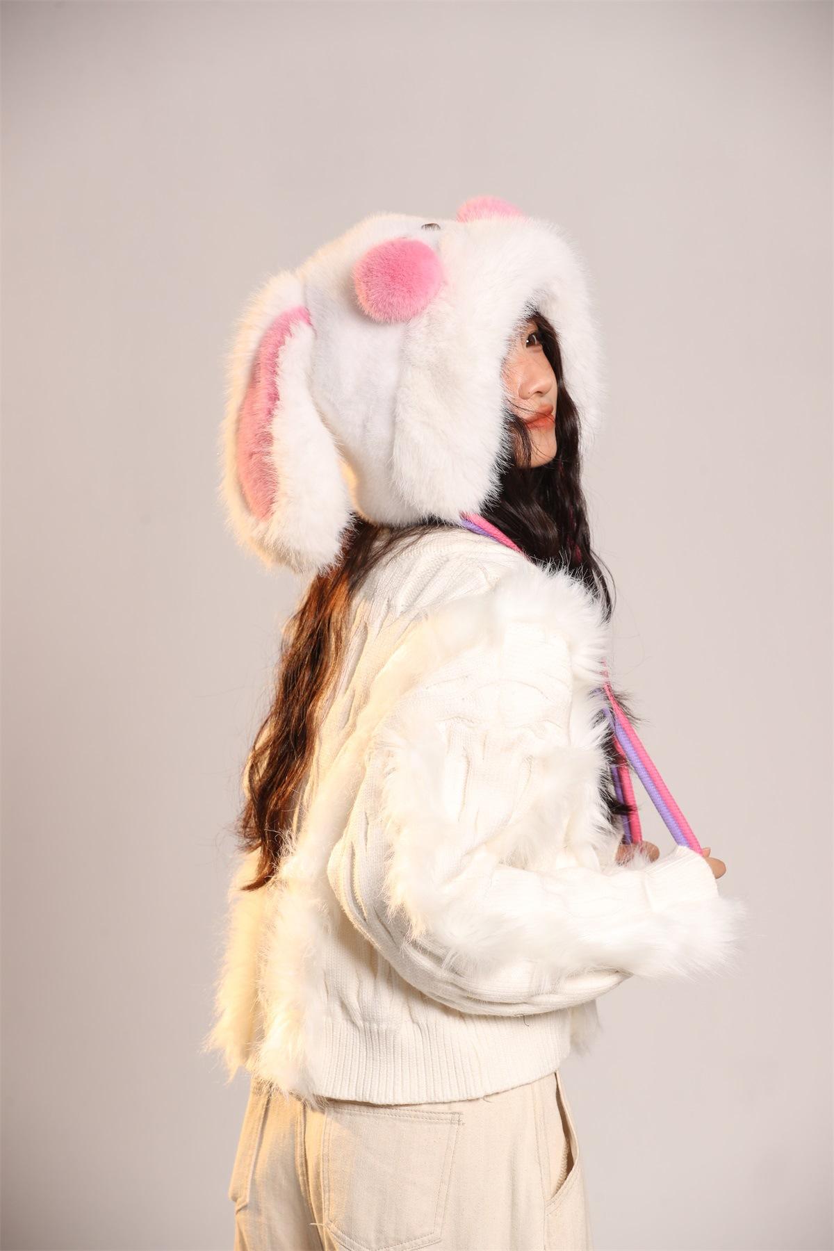 Gorro de felpa con orejas de conejo japonesas, bonito y dulce, para mujer, cálido, para otoño e invierno, con protección para las orejas, resistente al frío