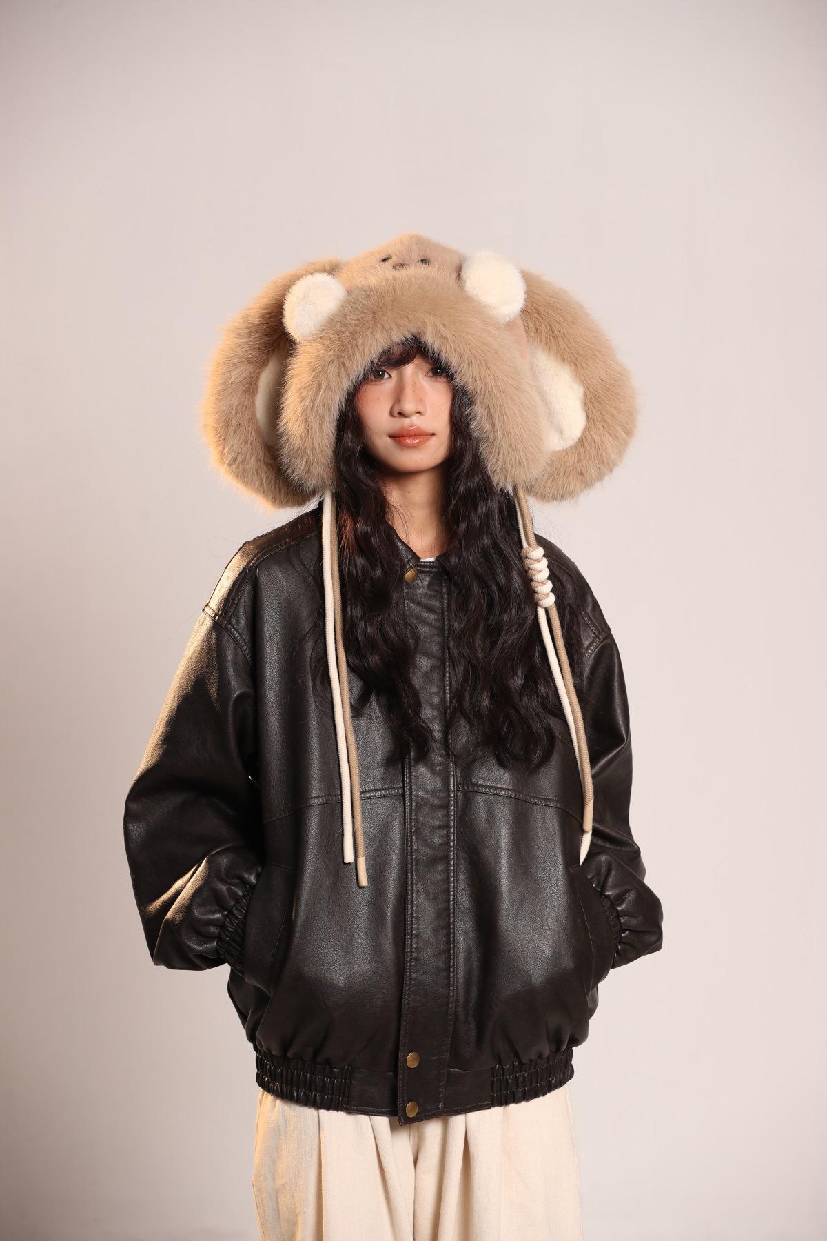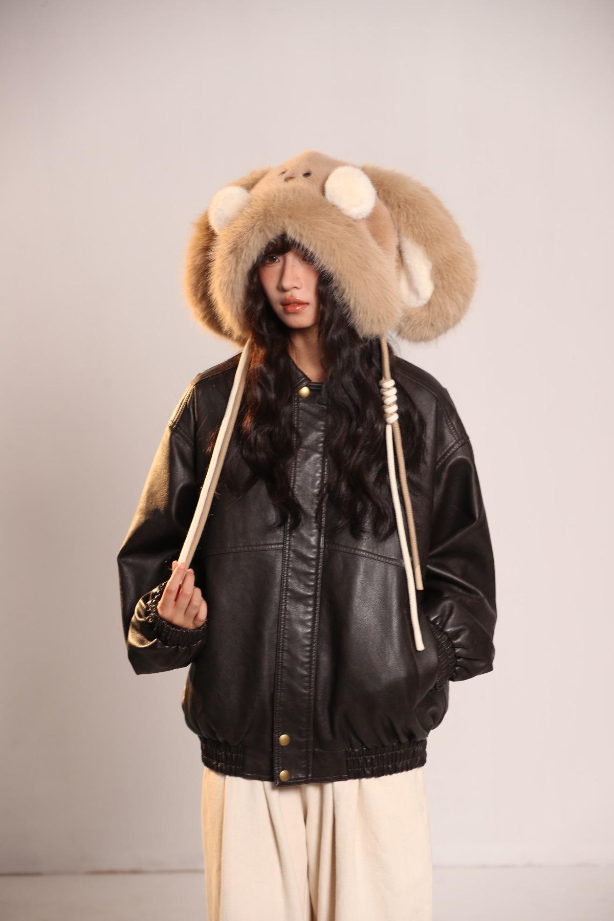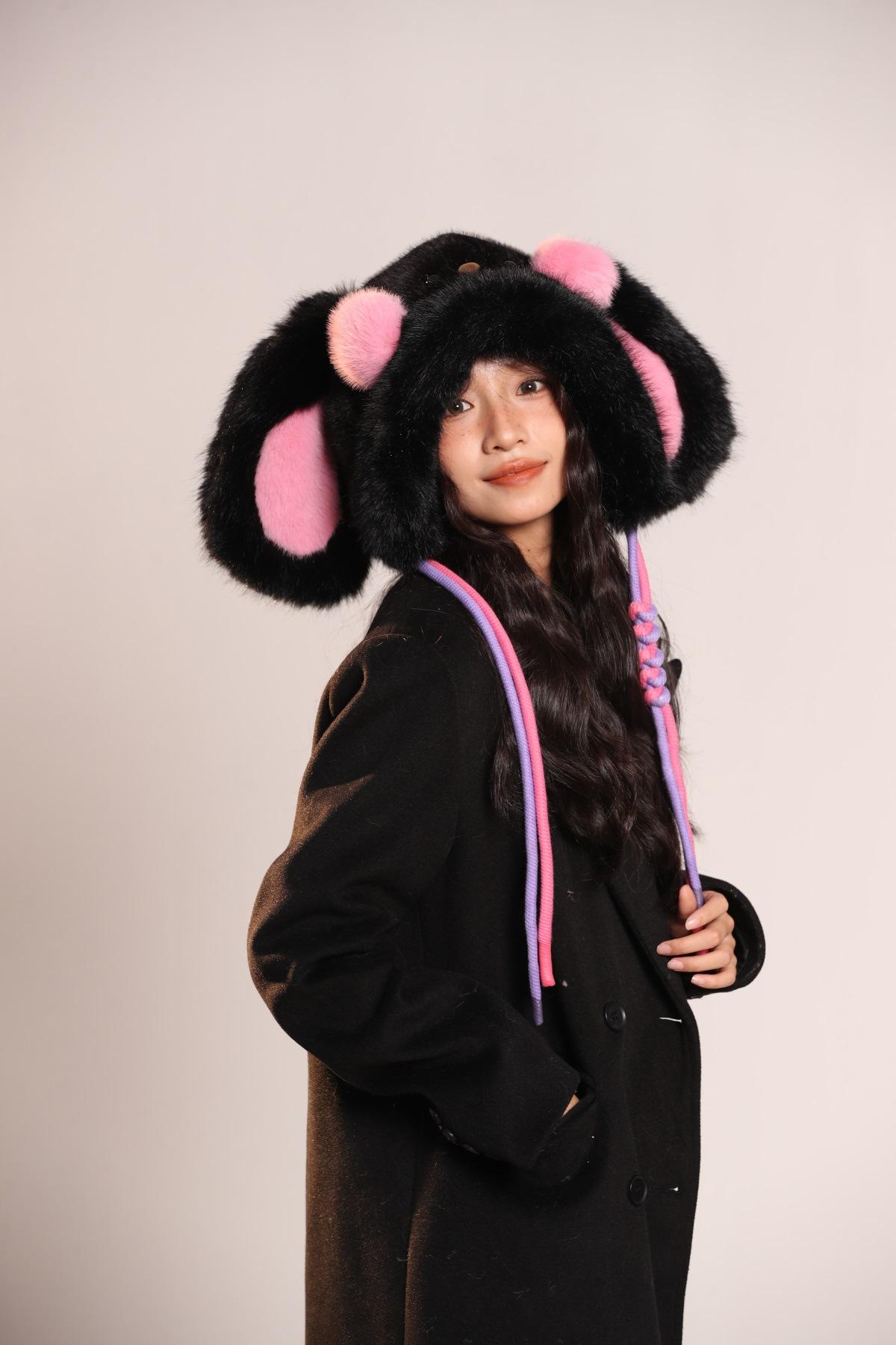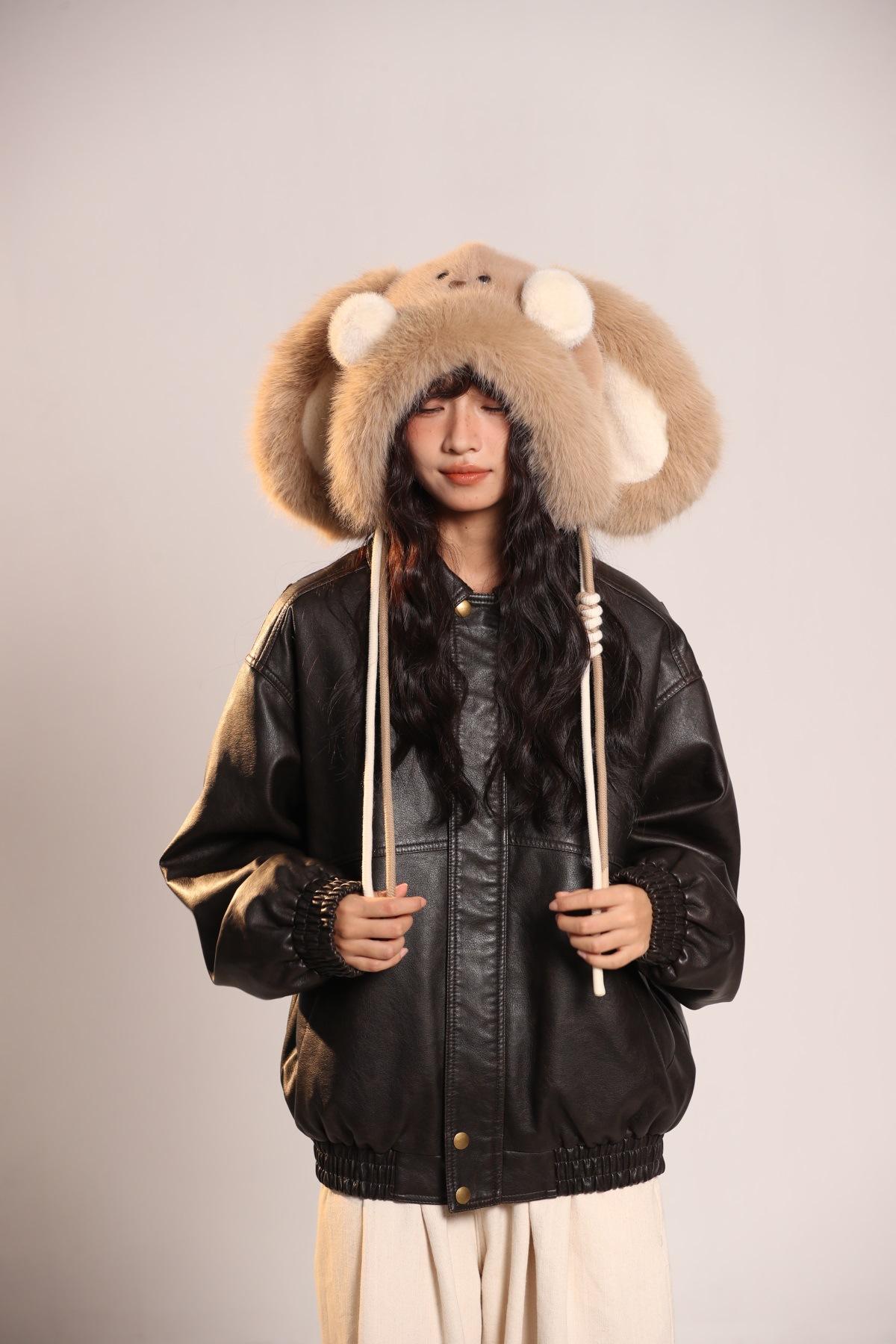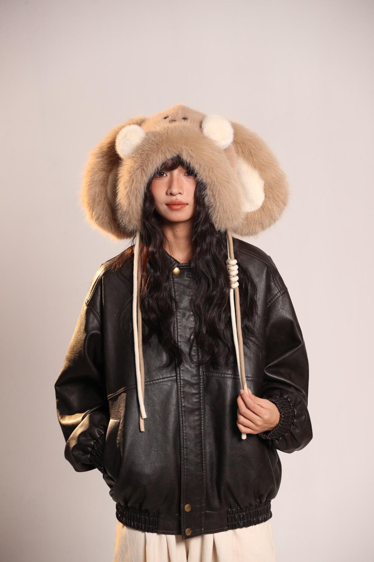 Gorro de felpa con orejas de conejo japonesas, bonito y dulce, para mujer, cálido, para otoño e invierno, con protección para las orejas, resistente al frío
