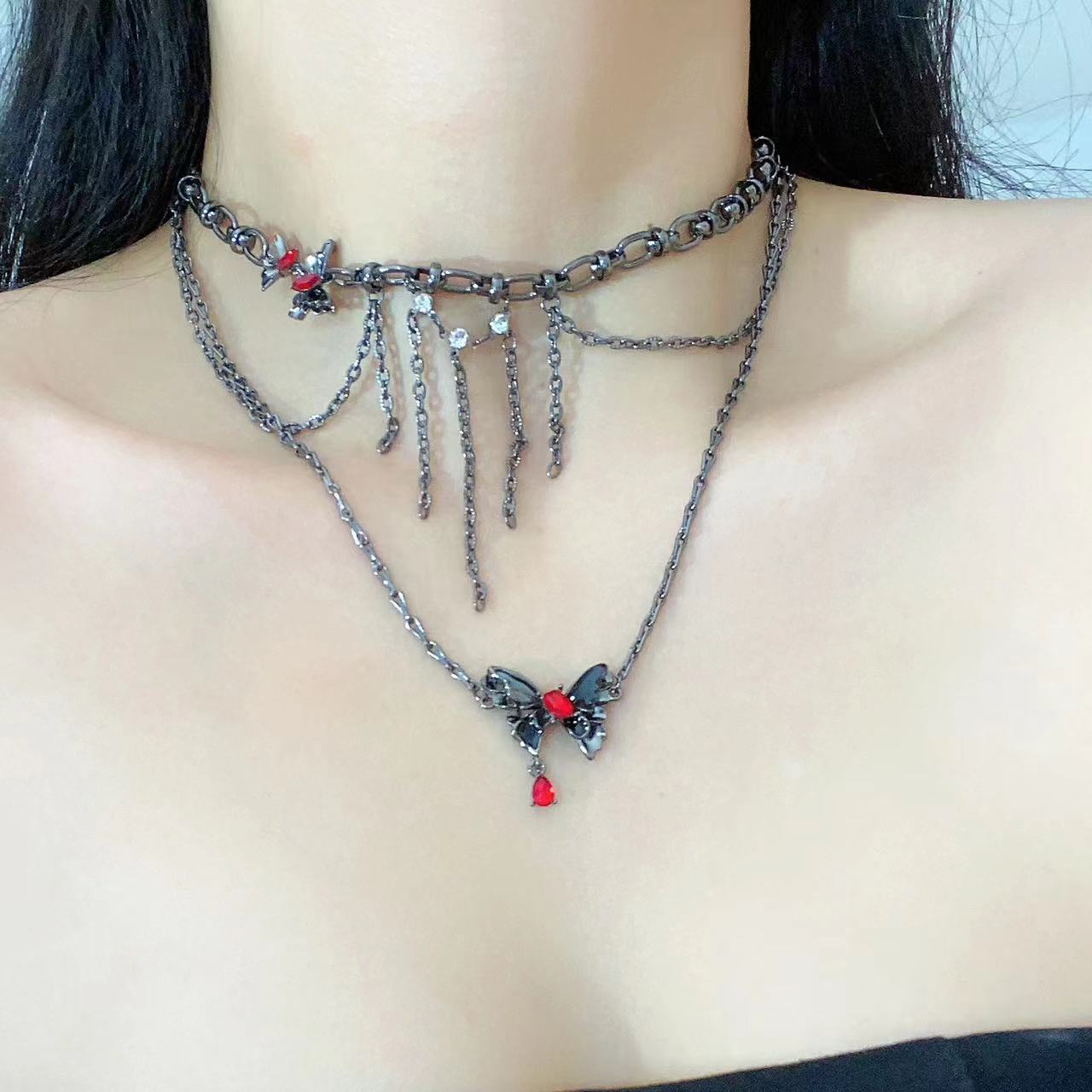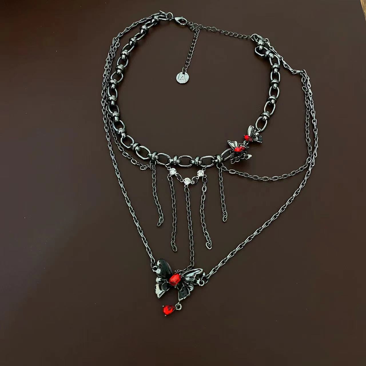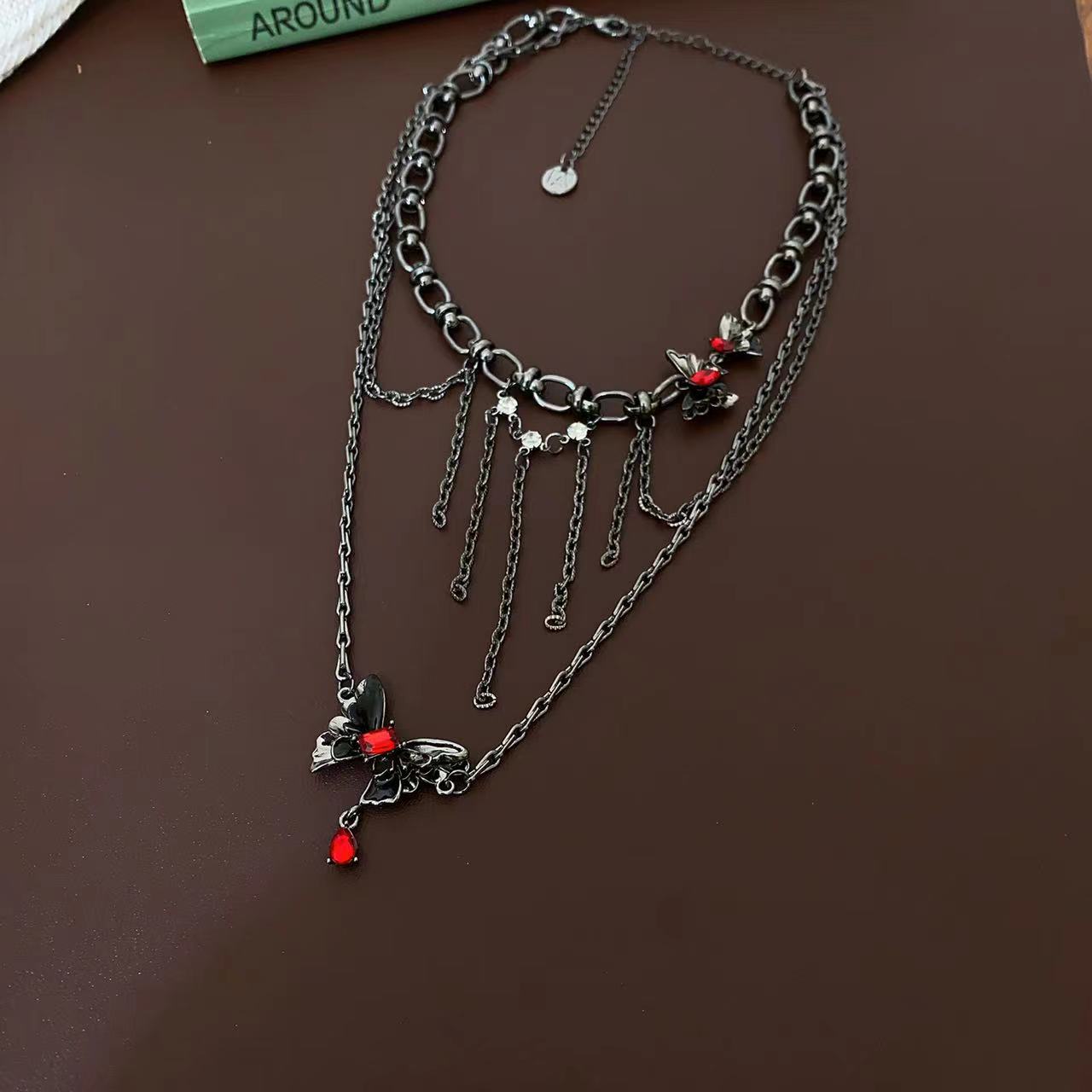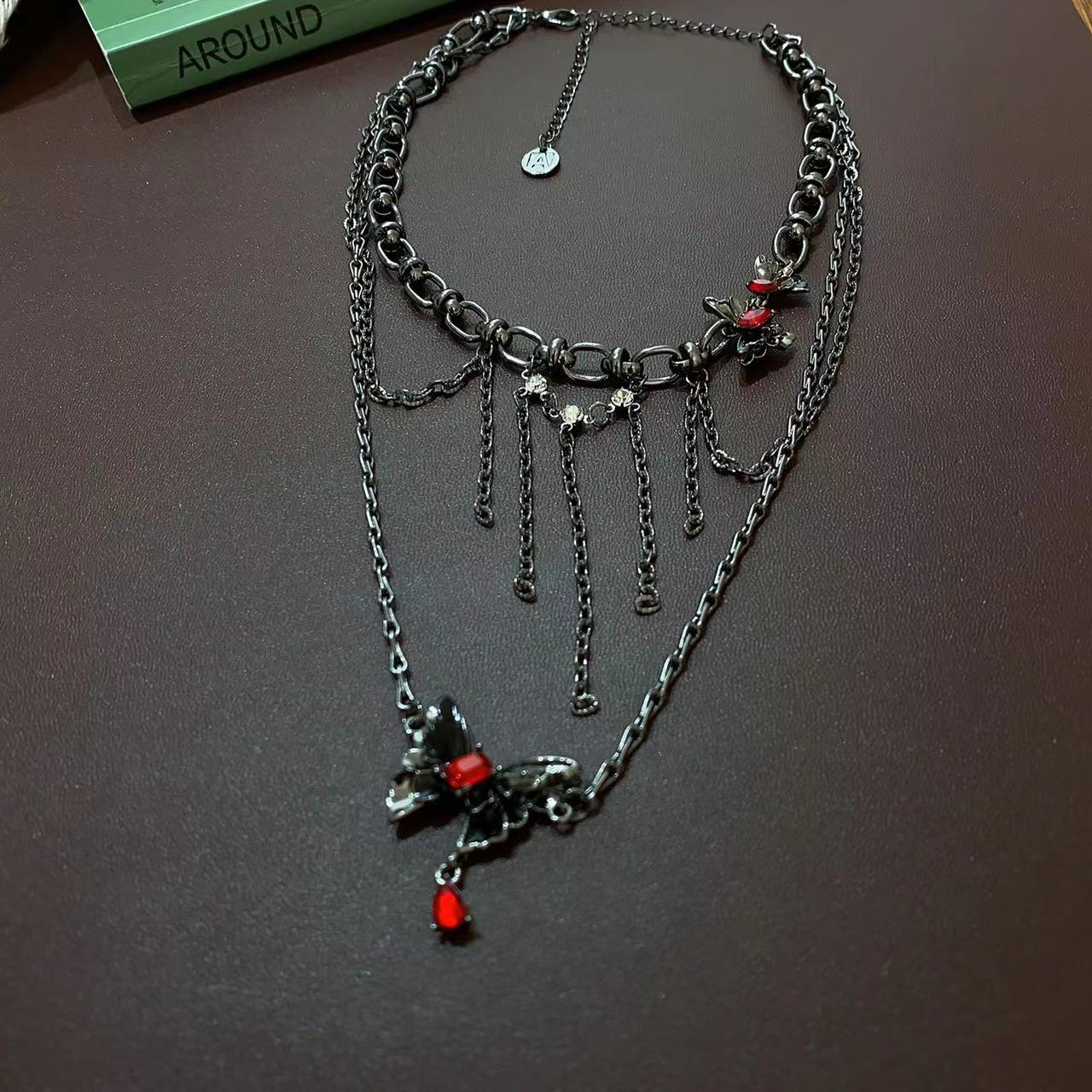 Collar Apilado de Doble Capa con Borla de Mariposa Tridimensional para Mujer, Lujo Ligero Nicho Estilo Oscuro Personalidad Elegante Cadena Clavicular Colgante