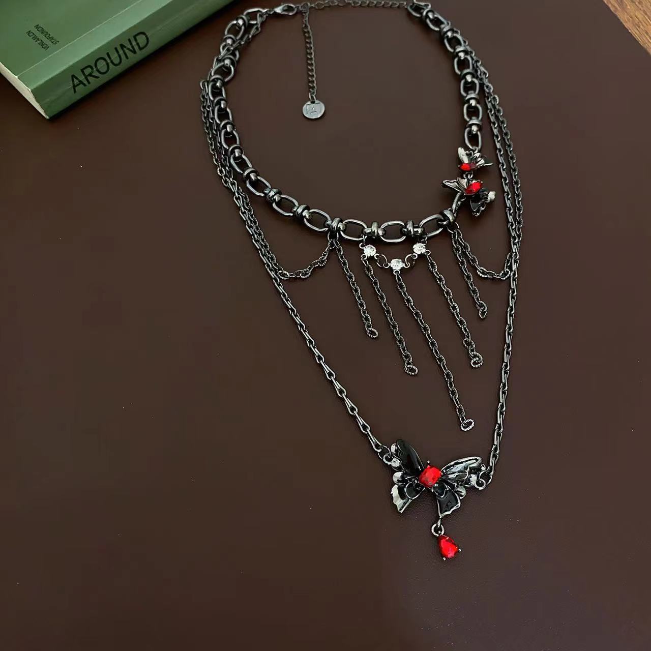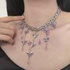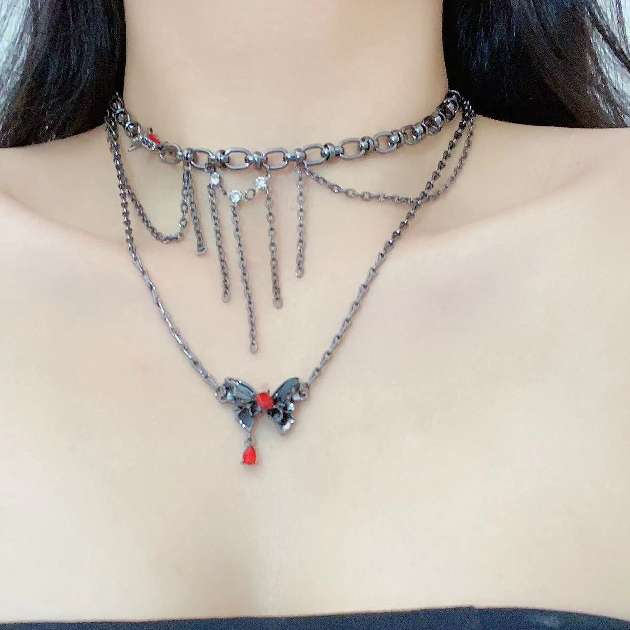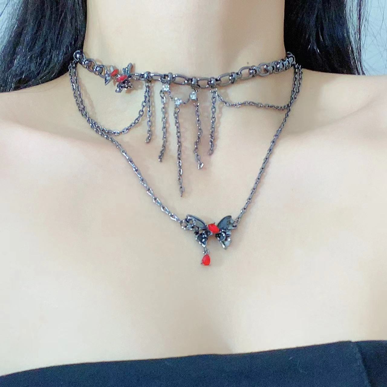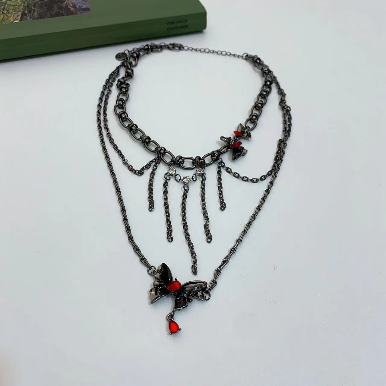 Collar Apilado de Doble Capa con Borla de Mariposa Tridimensional para Mujer, Lujo Ligero Nicho Estilo Oscuro Personalidad Elegante Cadena Clavicular Colgante