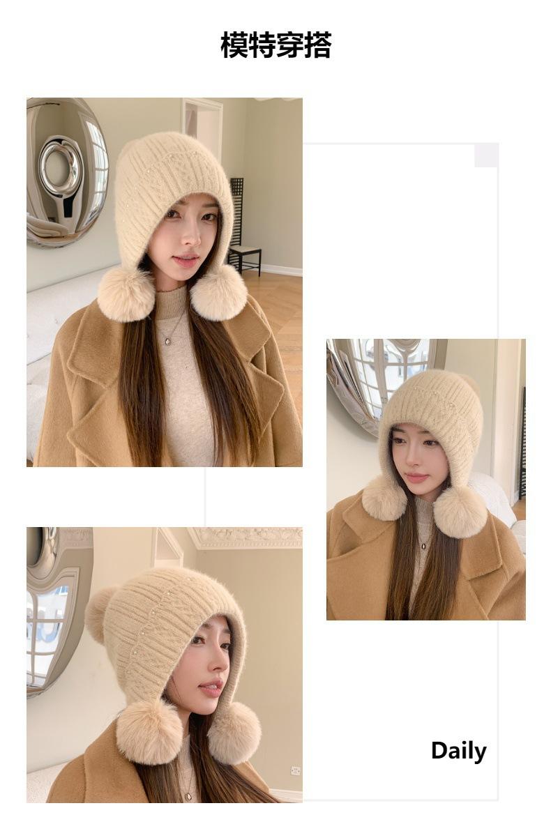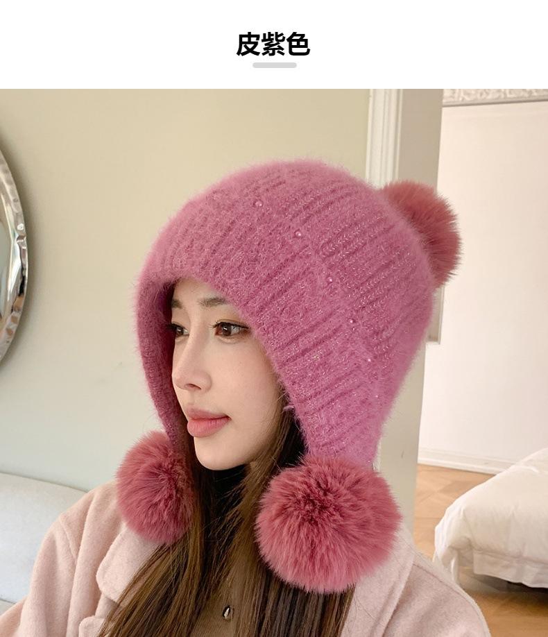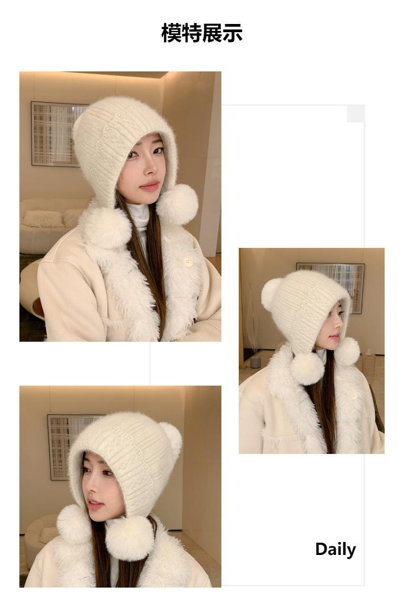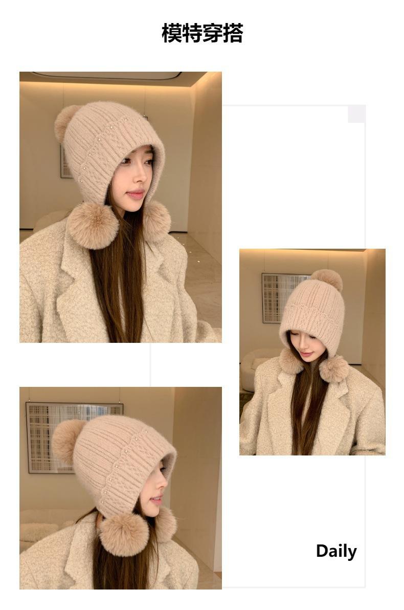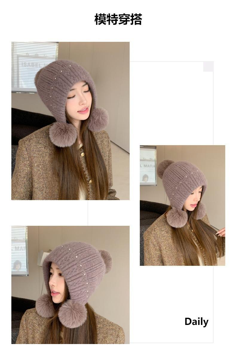 Gorro Baotou de punto a rayas para mujer, gorro de invierno a la moda, para otoño e invierno, con protección para las orejas, cálido gorro de lana con forro polar y tres bolas de pelo.
