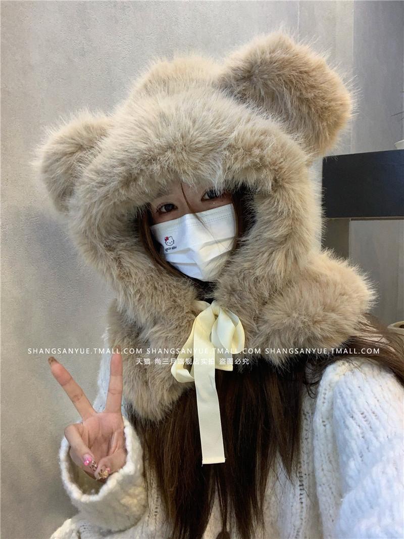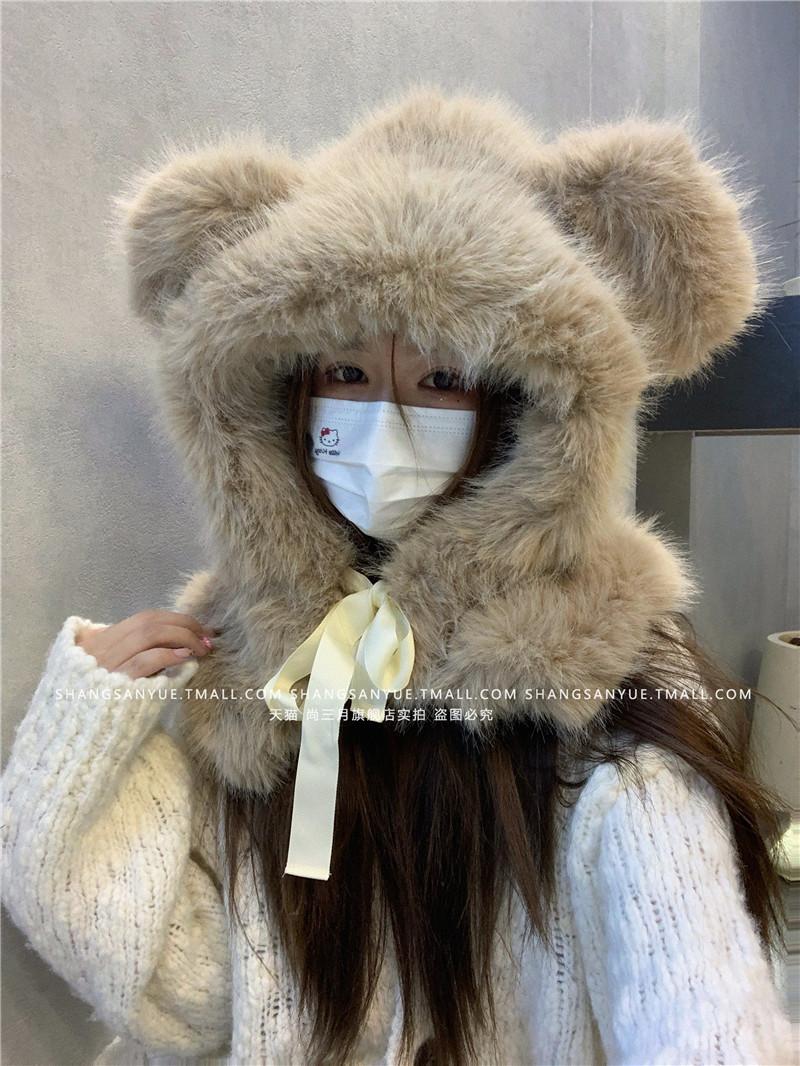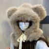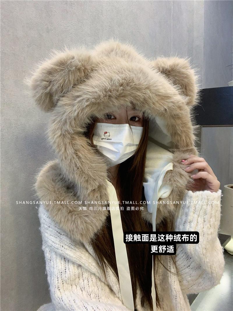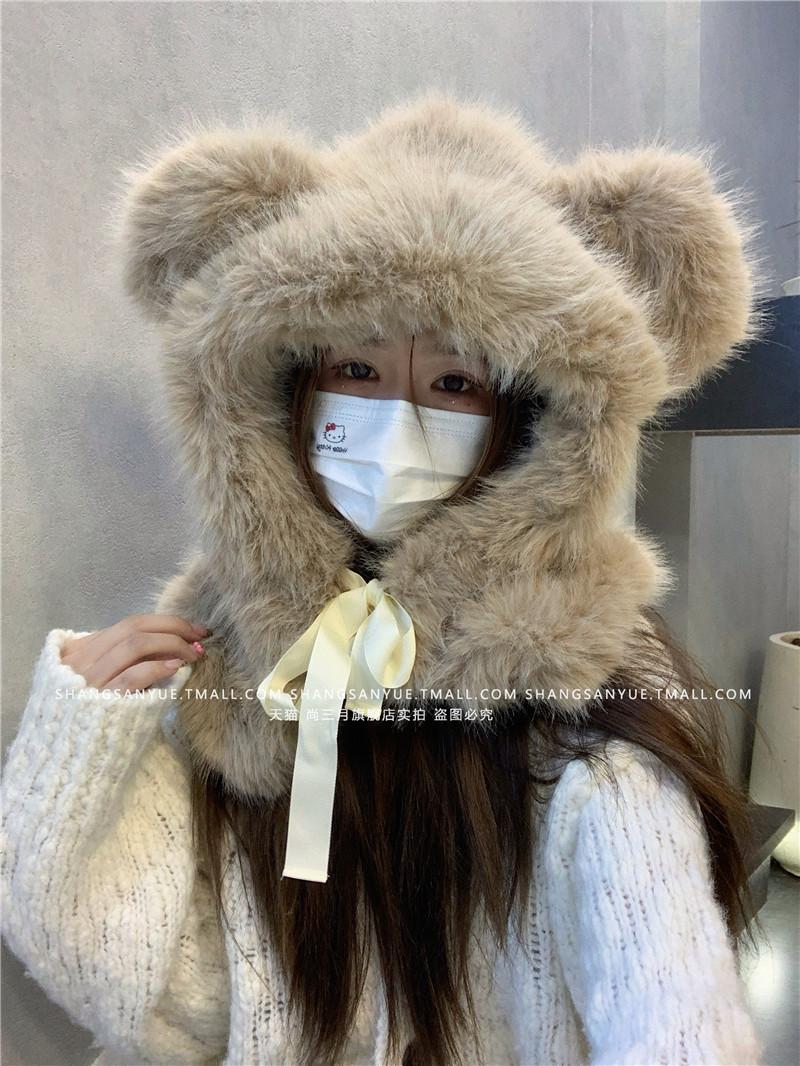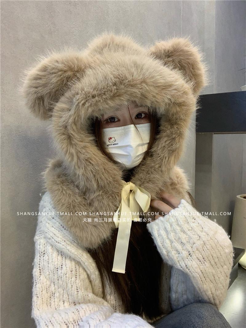 Gorro de peluche de oso para mujer en invierno, estilo K, grueso, cálido, con protección para los oídos, gorro Lei Feng para ciclismo, gorro y bufanda integrados.