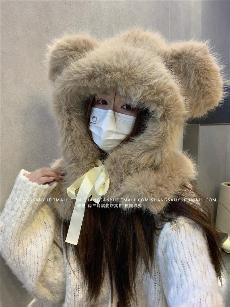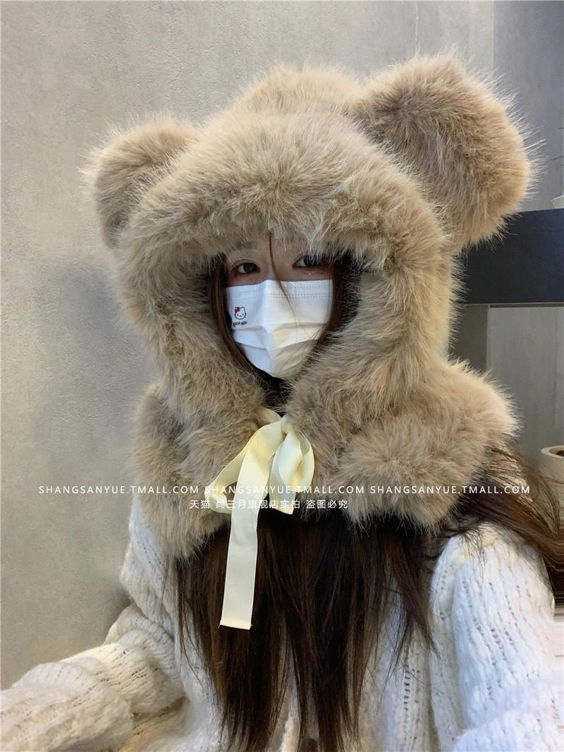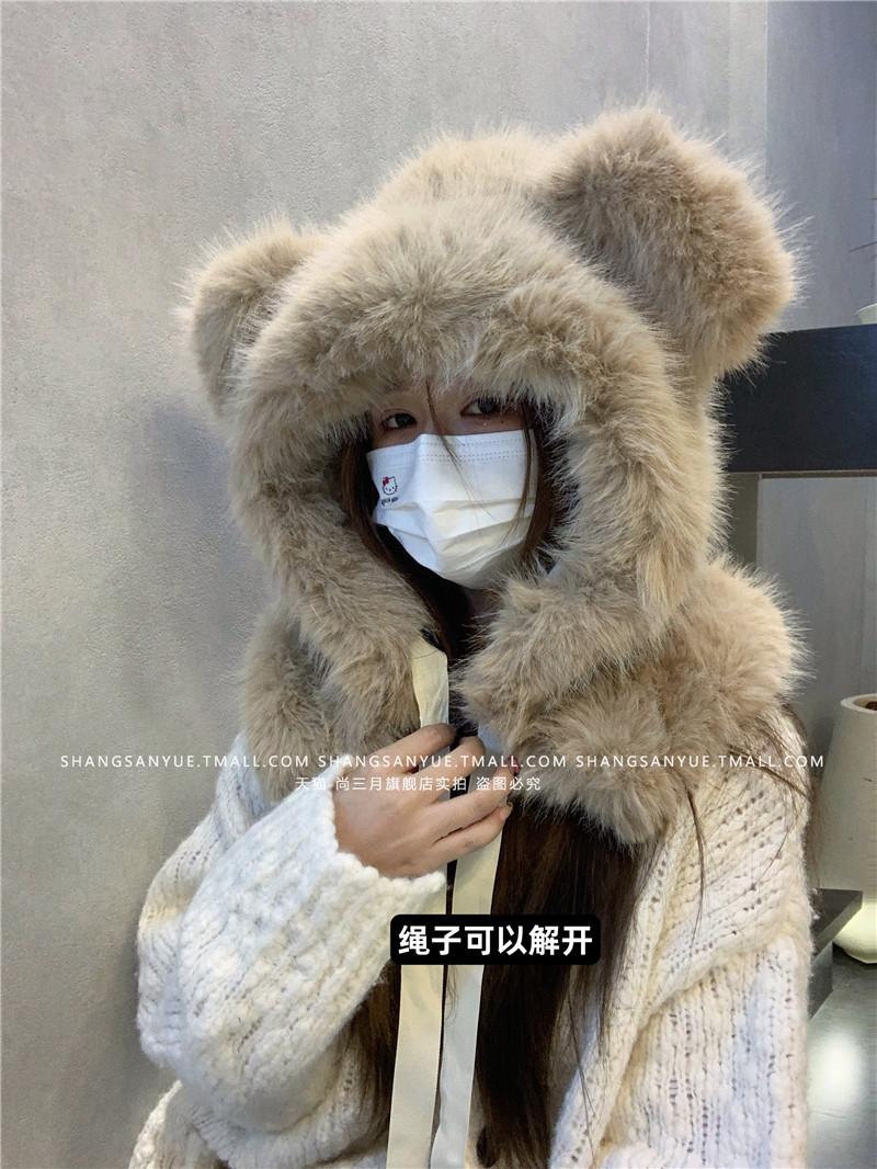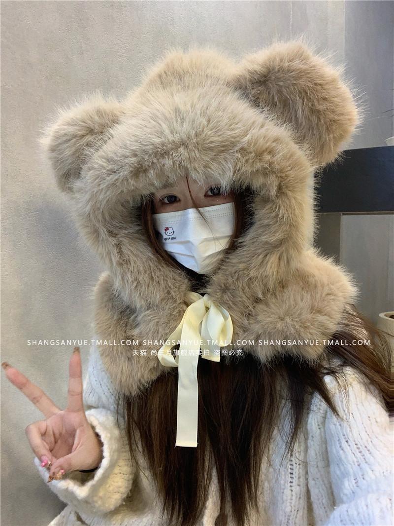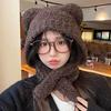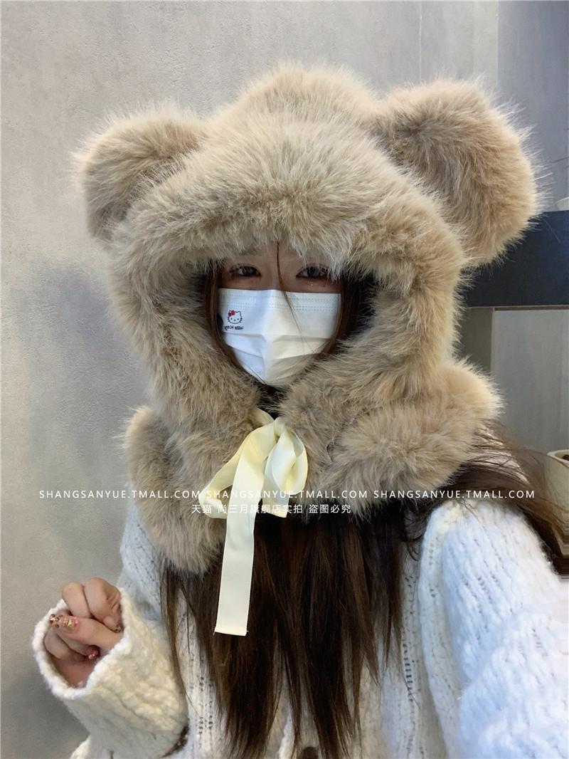 Gorro de peluche de oso para mujer en invierno, estilo K, grueso, cálido, con protección para los oídos, gorro Lei Feng para ciclismo, gorro y bufanda integrados.
