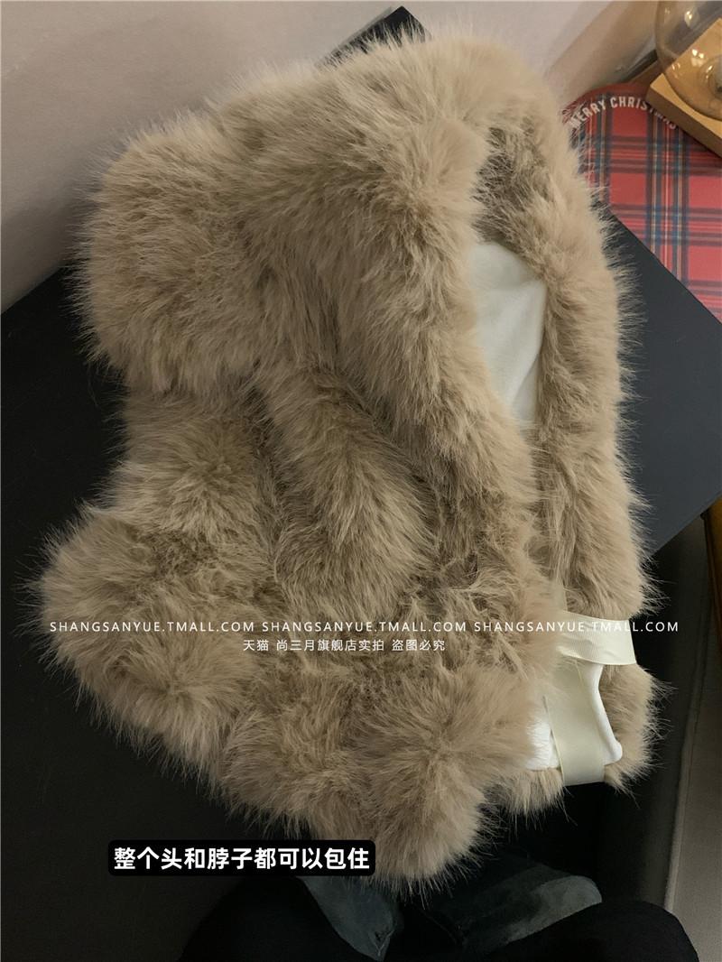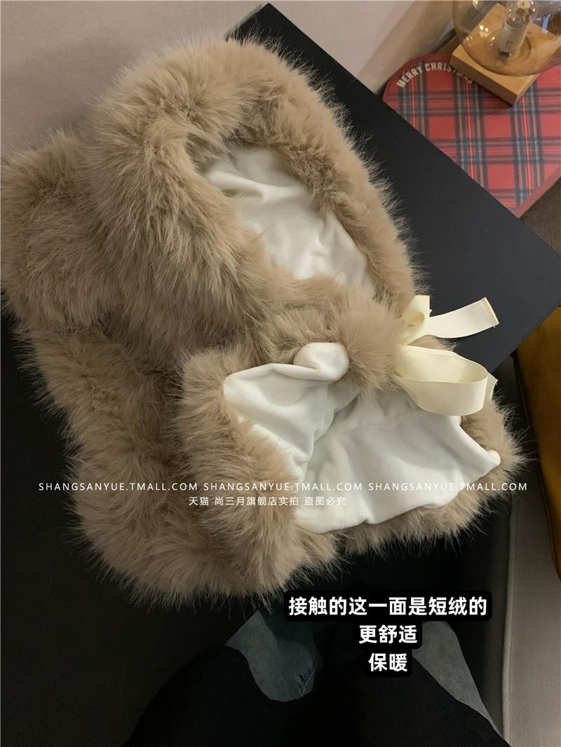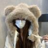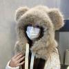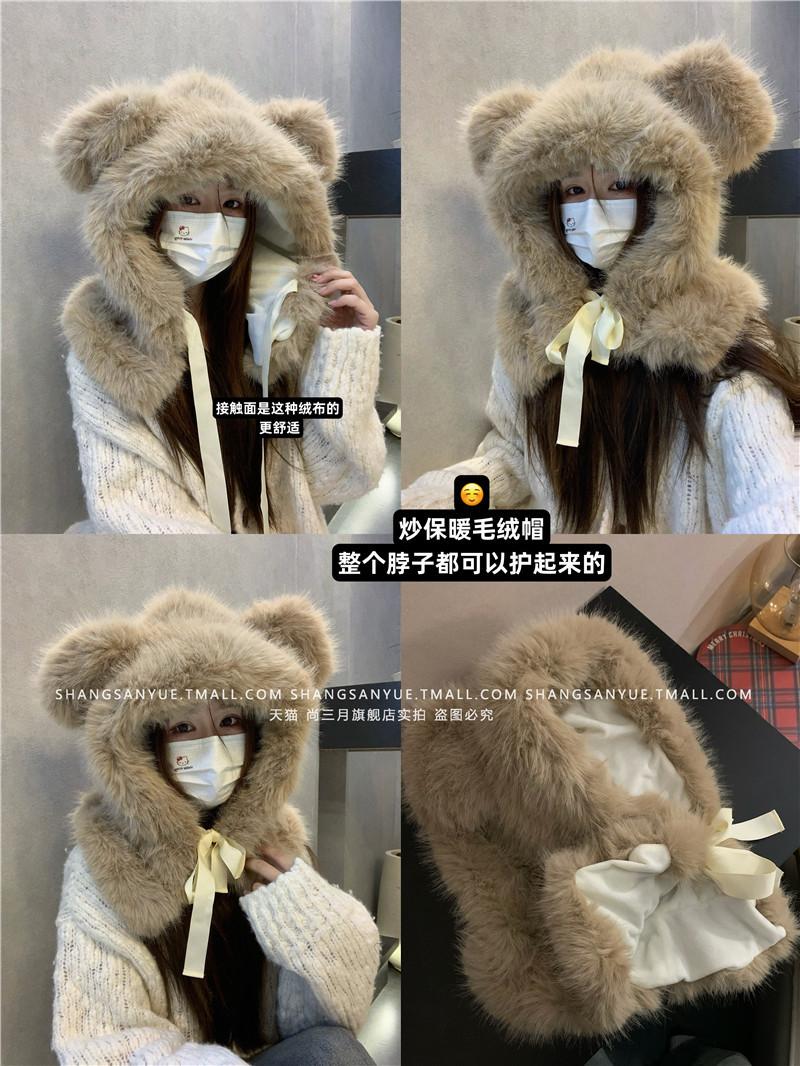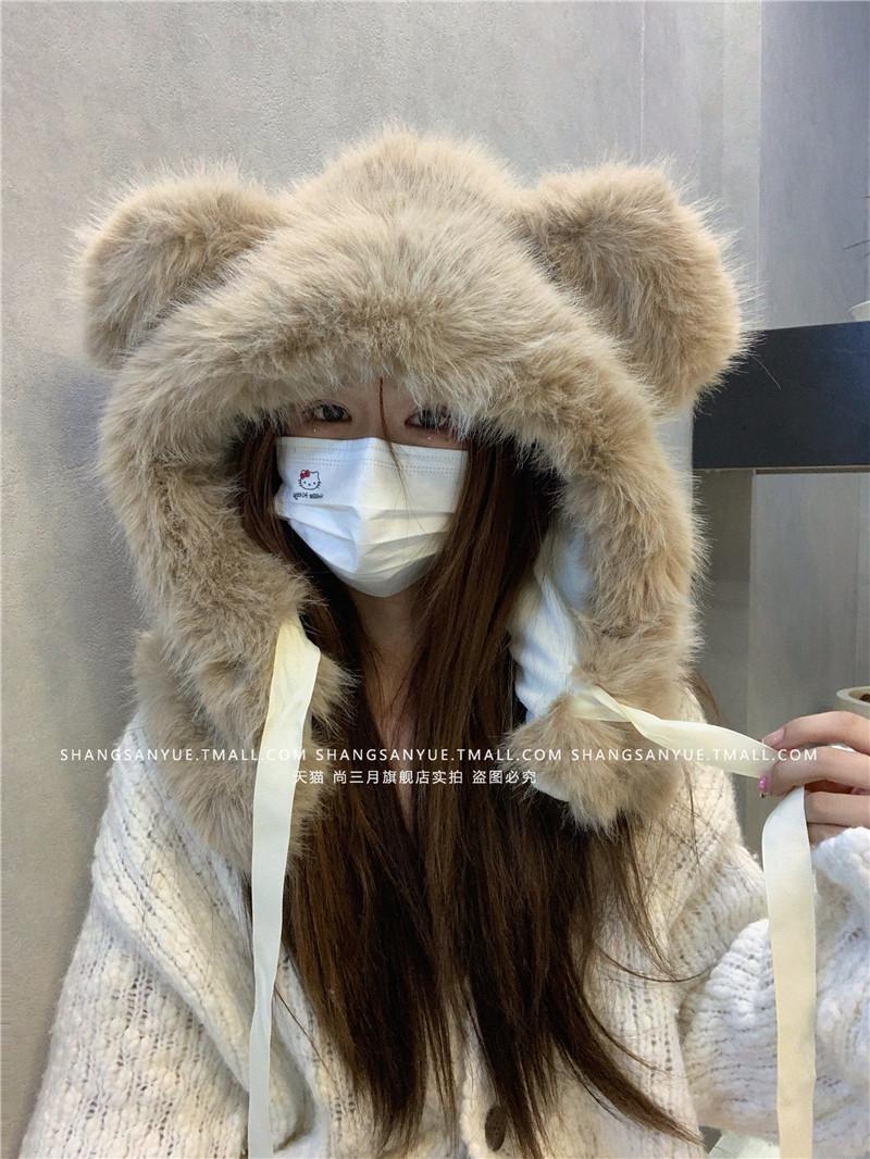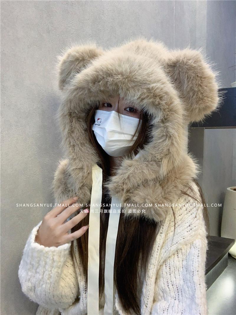 Gorro de peluche de oso para mujer en invierno, estilo K, grueso, cálido, con protección para los oídos, gorro Lei Feng para ciclismo, gorro y bufanda integrados.