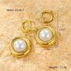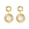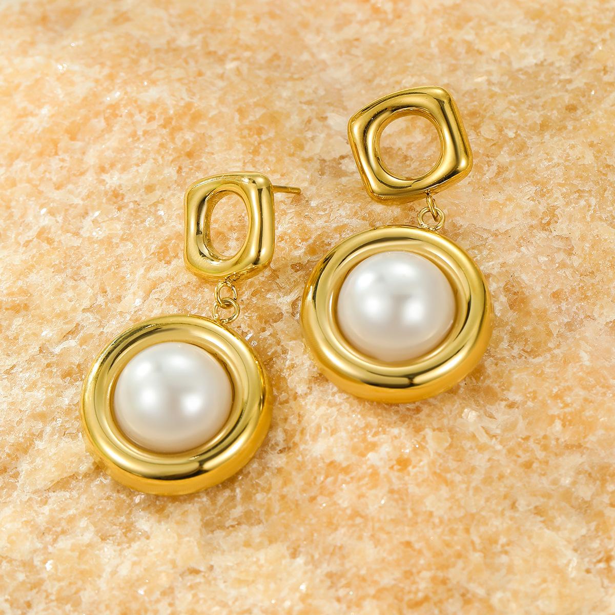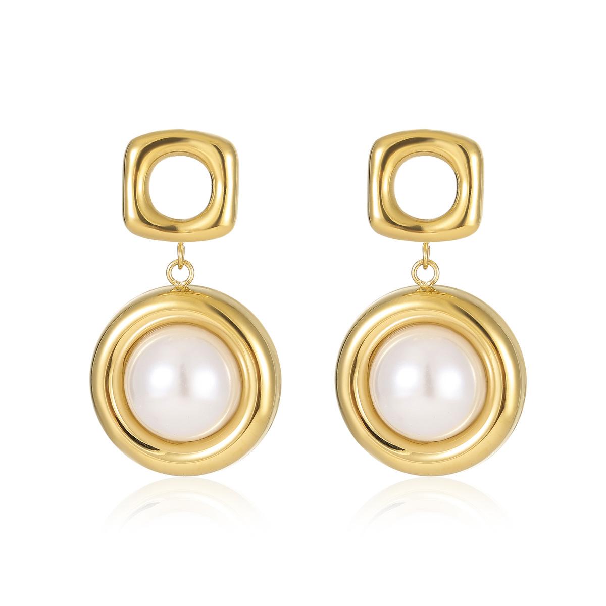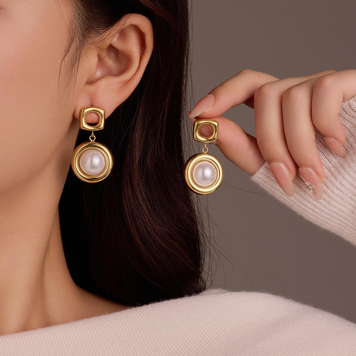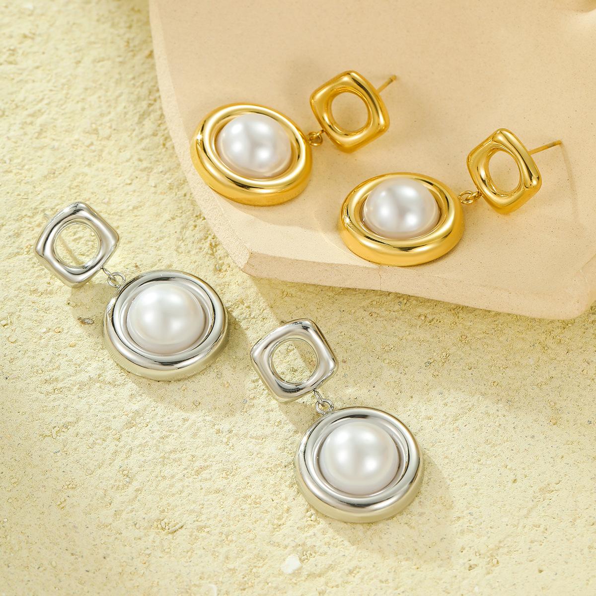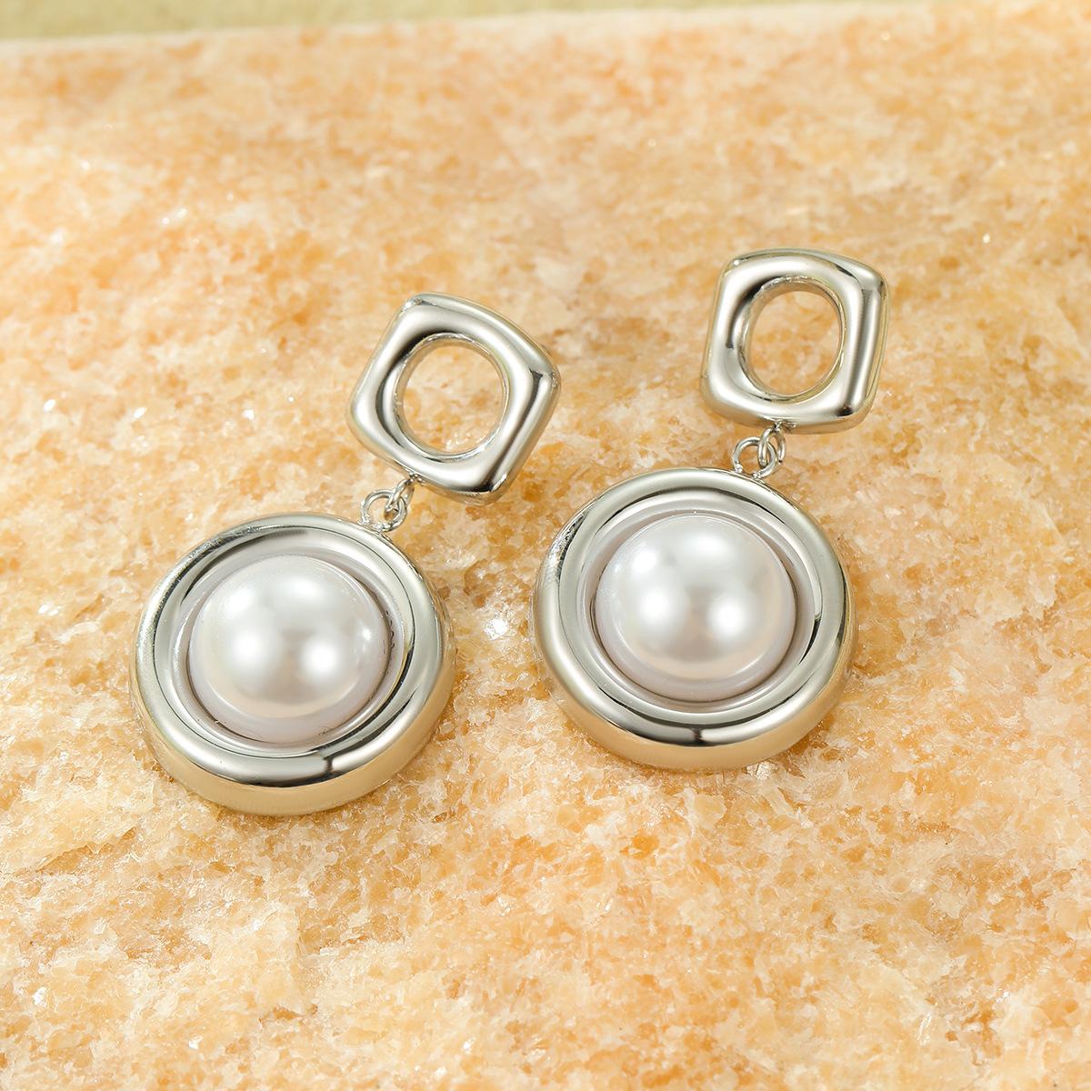 Pendientes de acero inoxidable con colgante cuadrado hueco redondo explosivo transfronterizo de estilo europeo y americano con perla, pendientes de alta gama