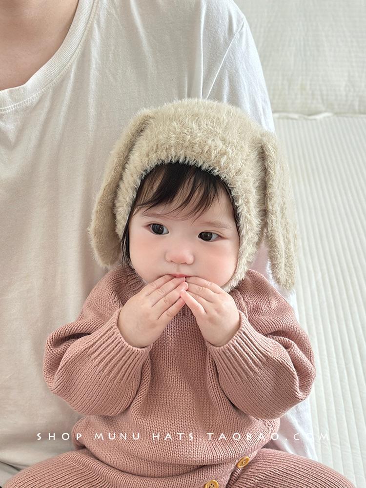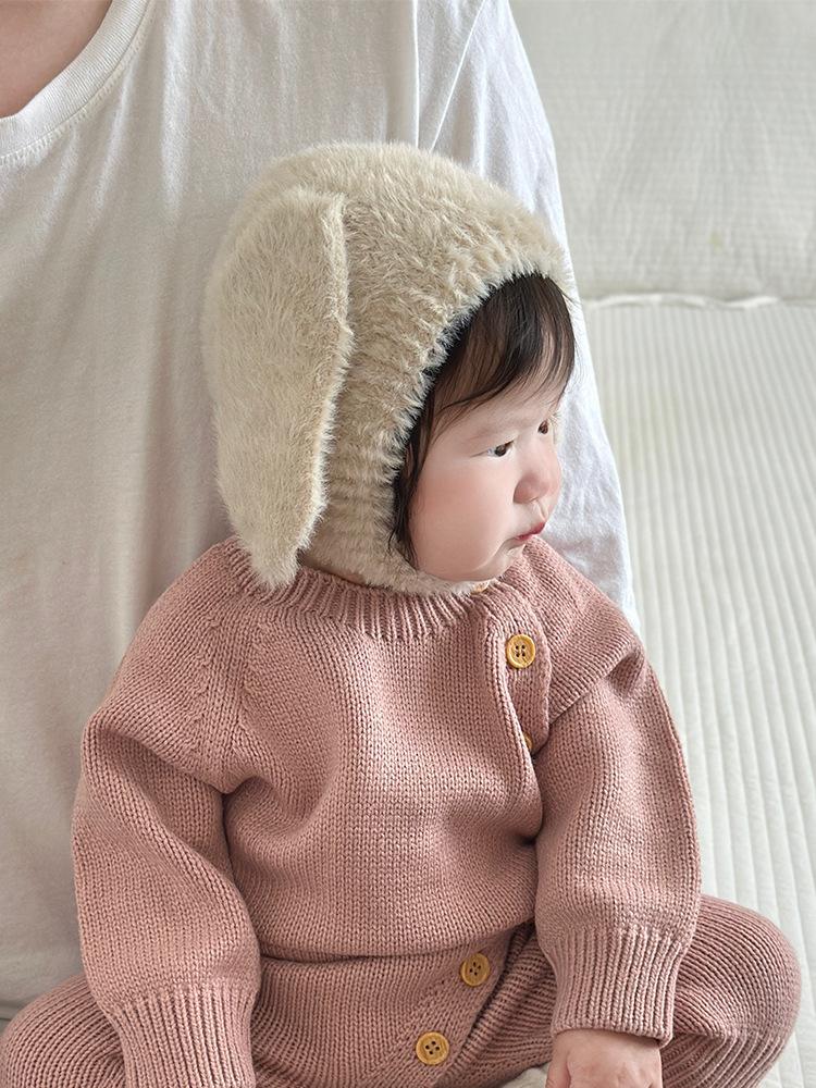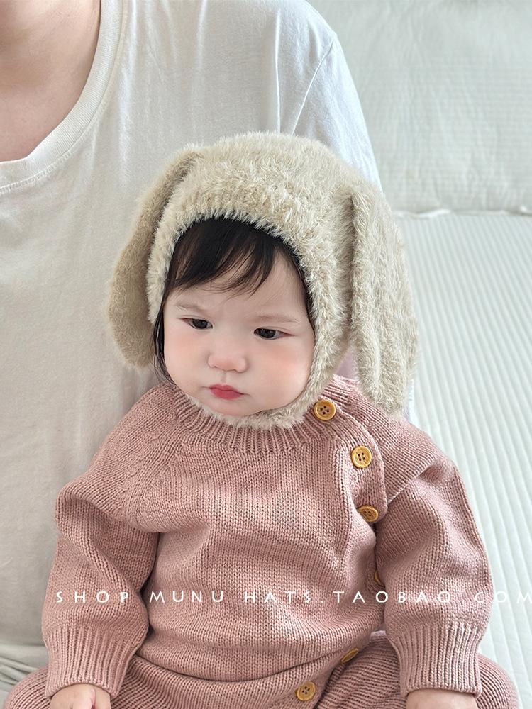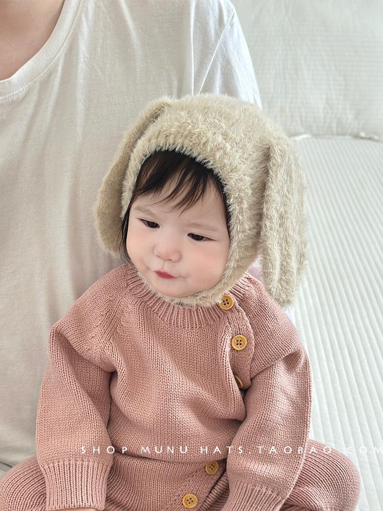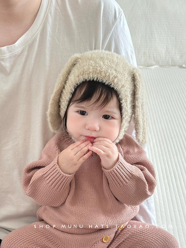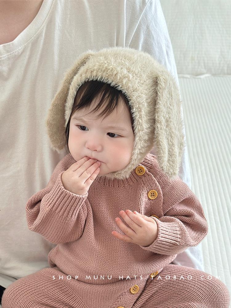 Gorro de lana para bebé, de otoño e invierno, con orejas de conejo de estilo coreano, de felpa, protector para los oídos, de punto grueso y cálido.