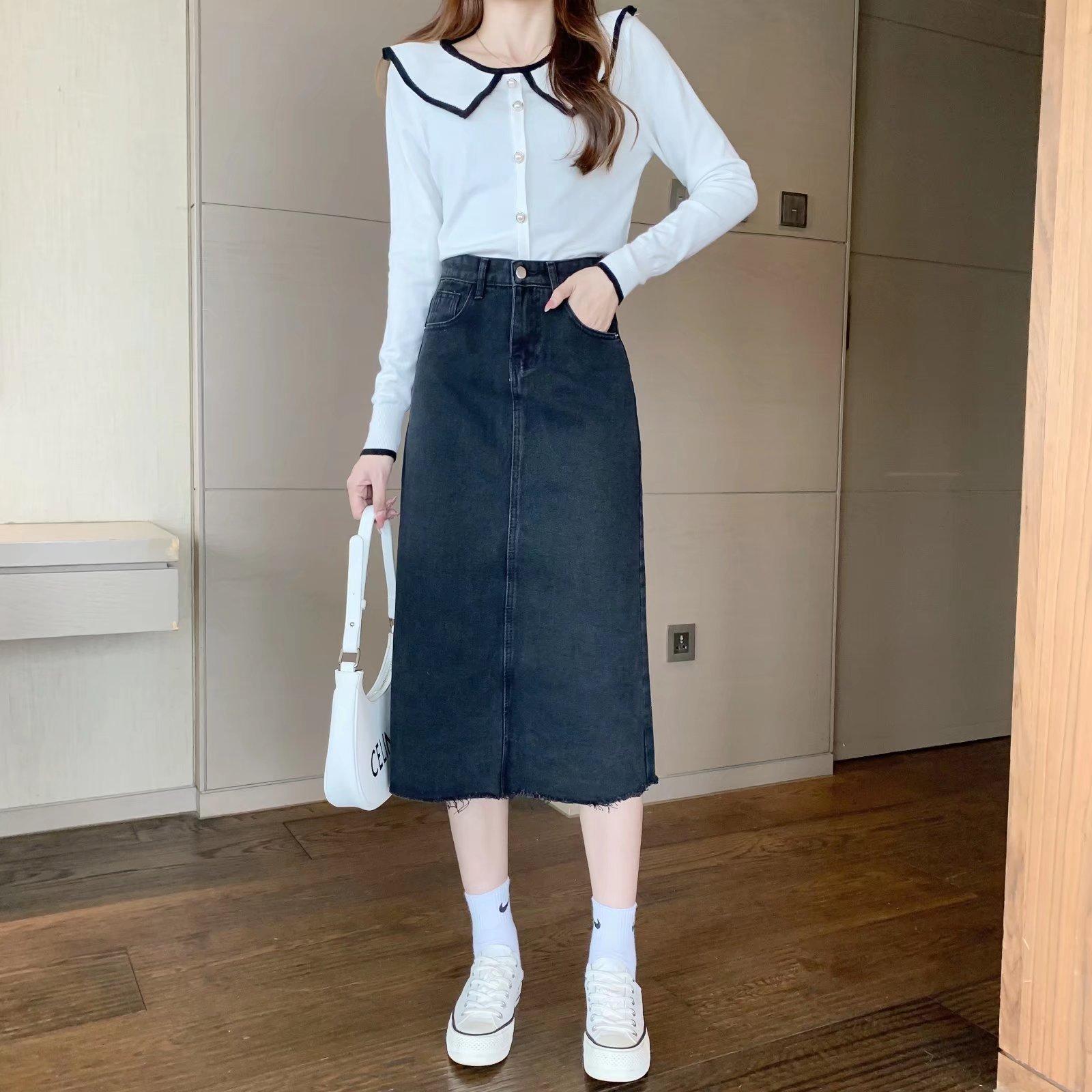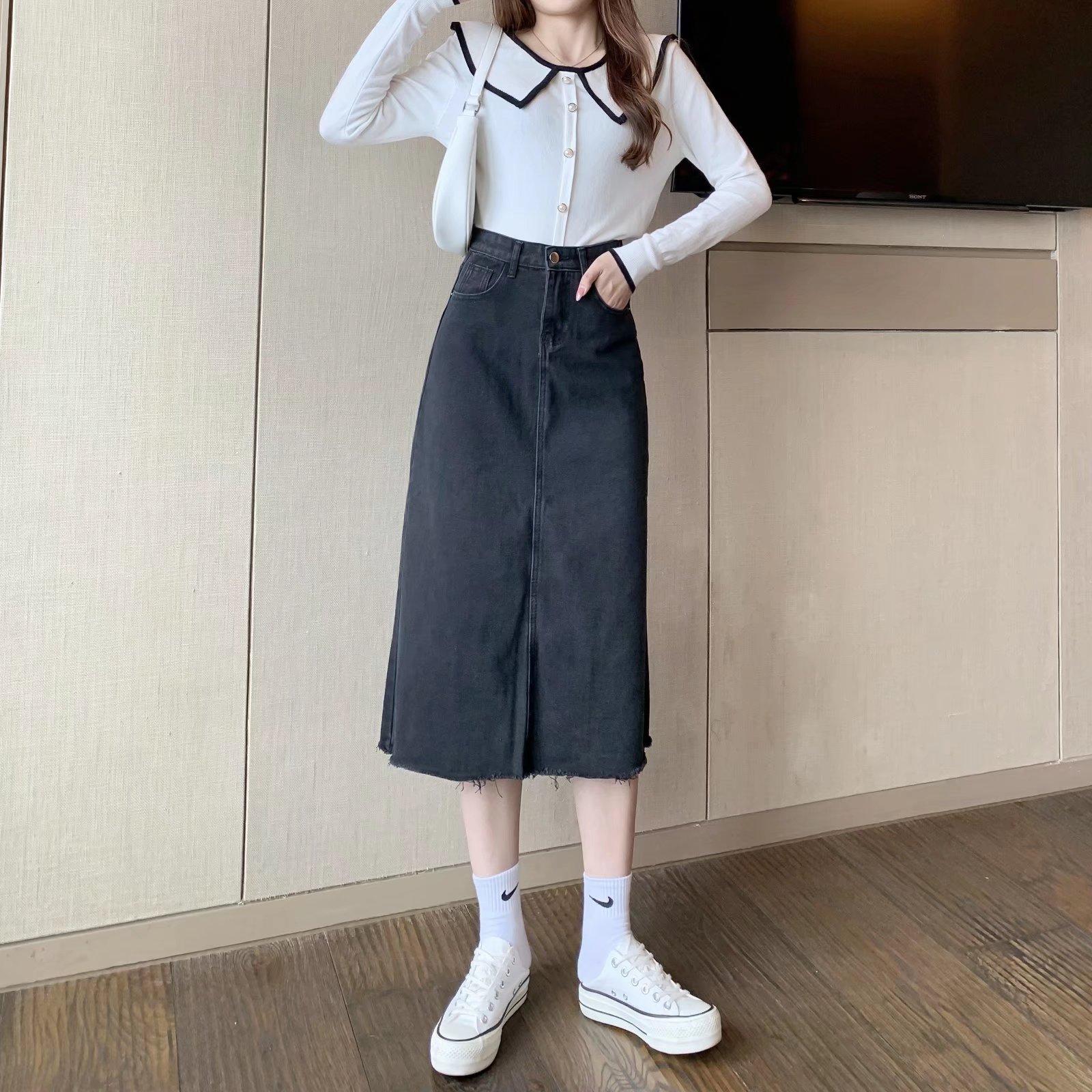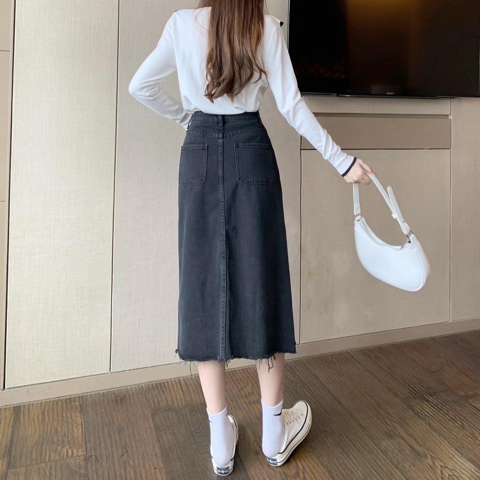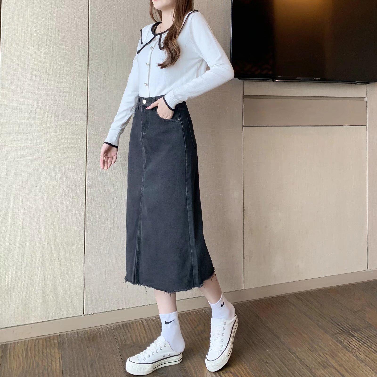 Falda vaquera retro de primavera para mujer, diseño de primavera, nicho, talla pequeña, borde sin rematar, línea A, falda de longitud media, falda larga