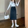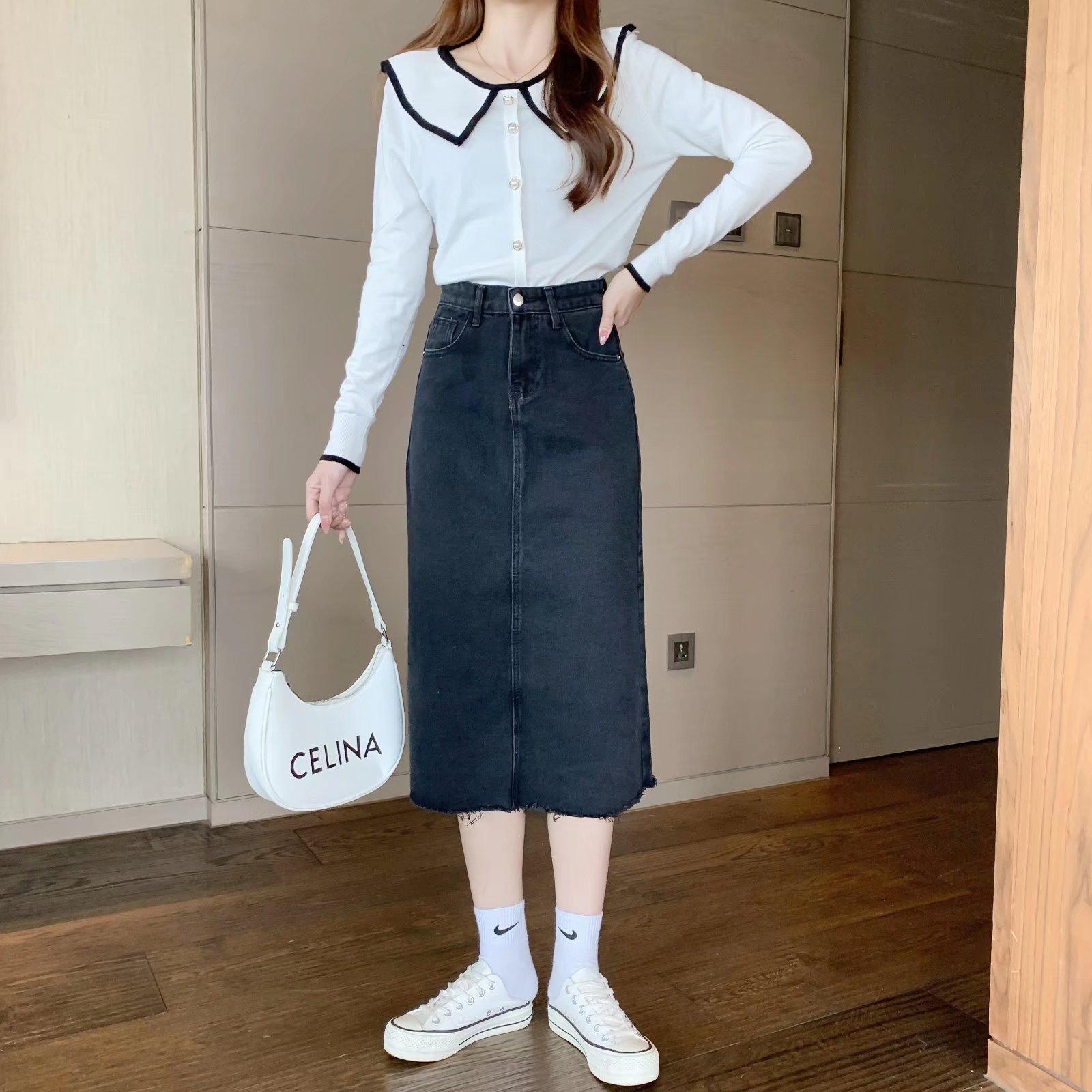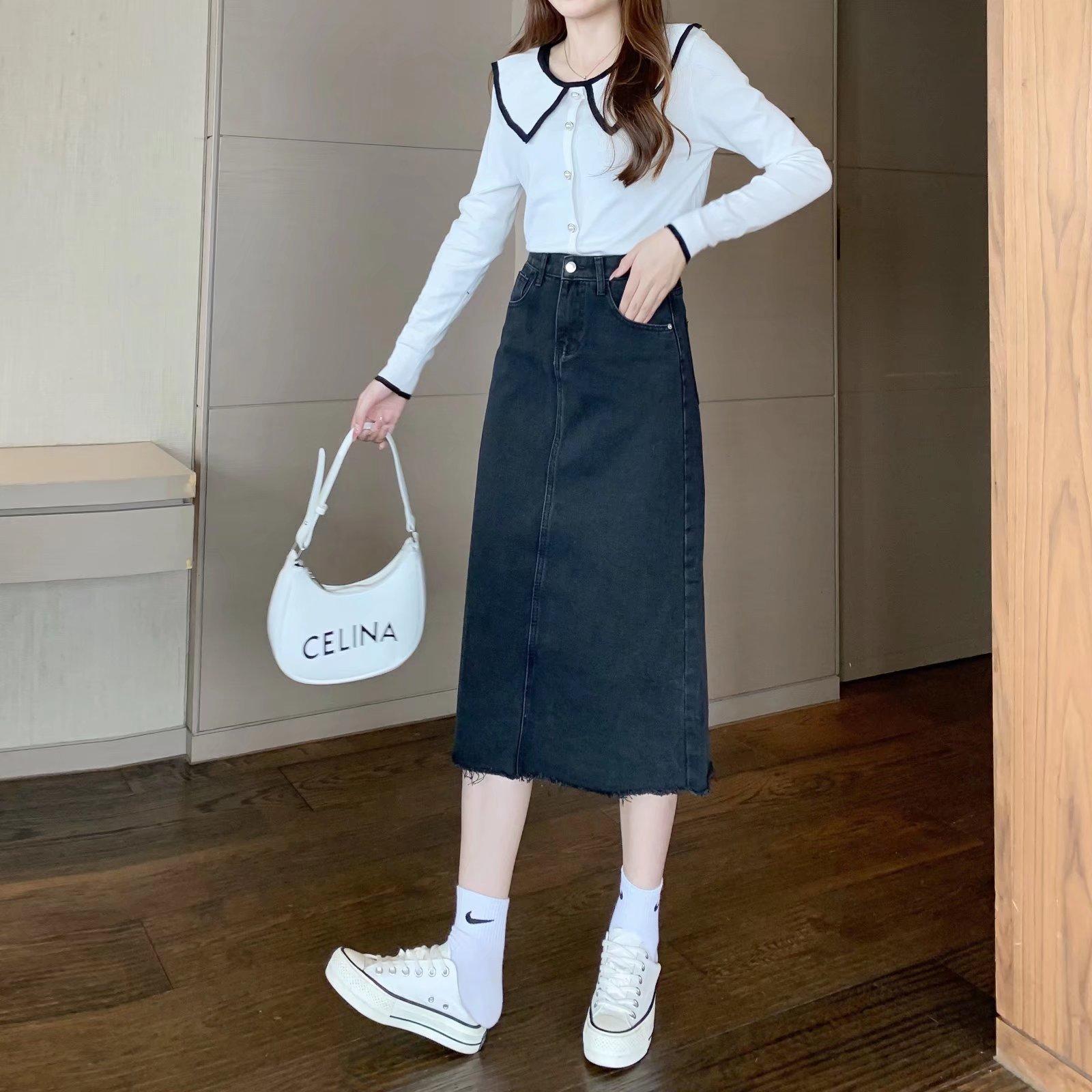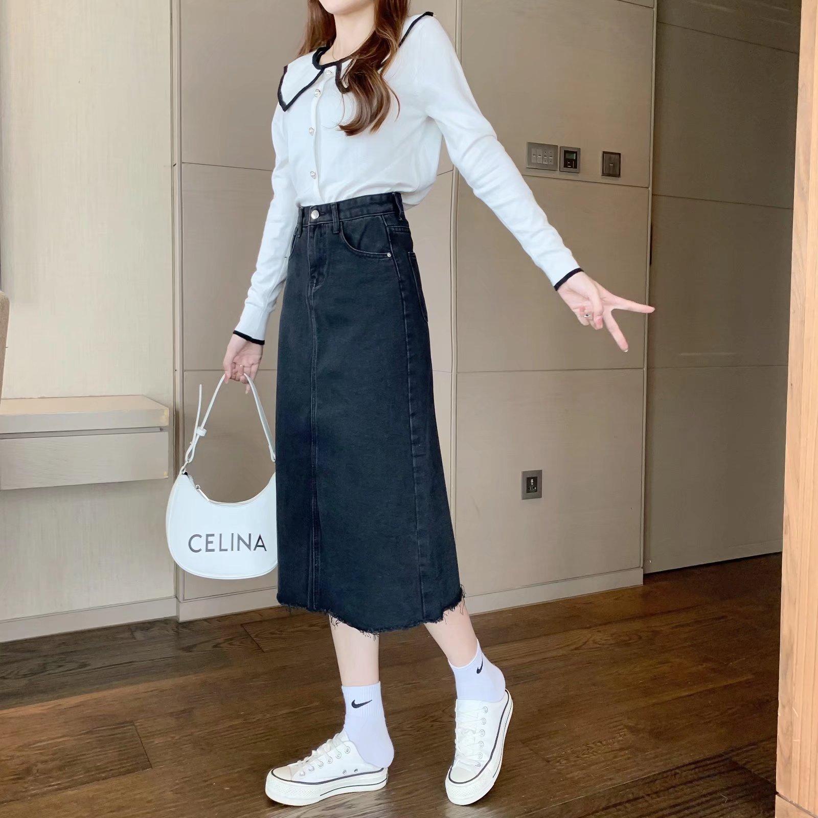 Falda vaquera retro de primavera para mujer, diseño de primavera, nicho, talla pequeña, borde sin rematar, línea A, falda de longitud media, falda larga