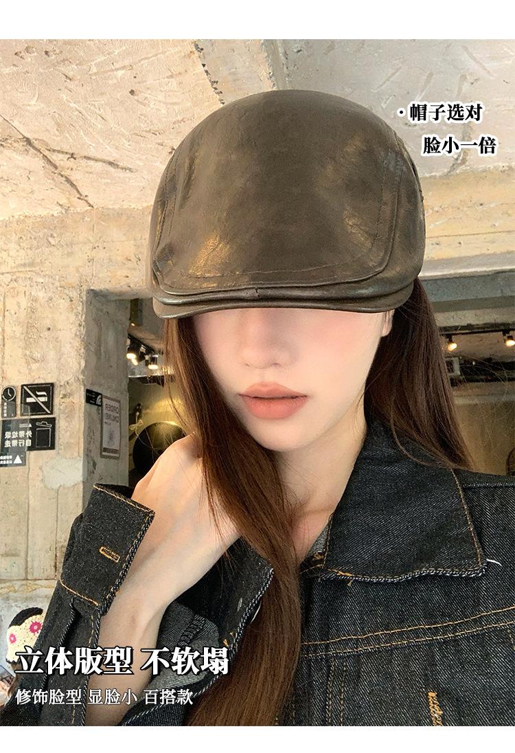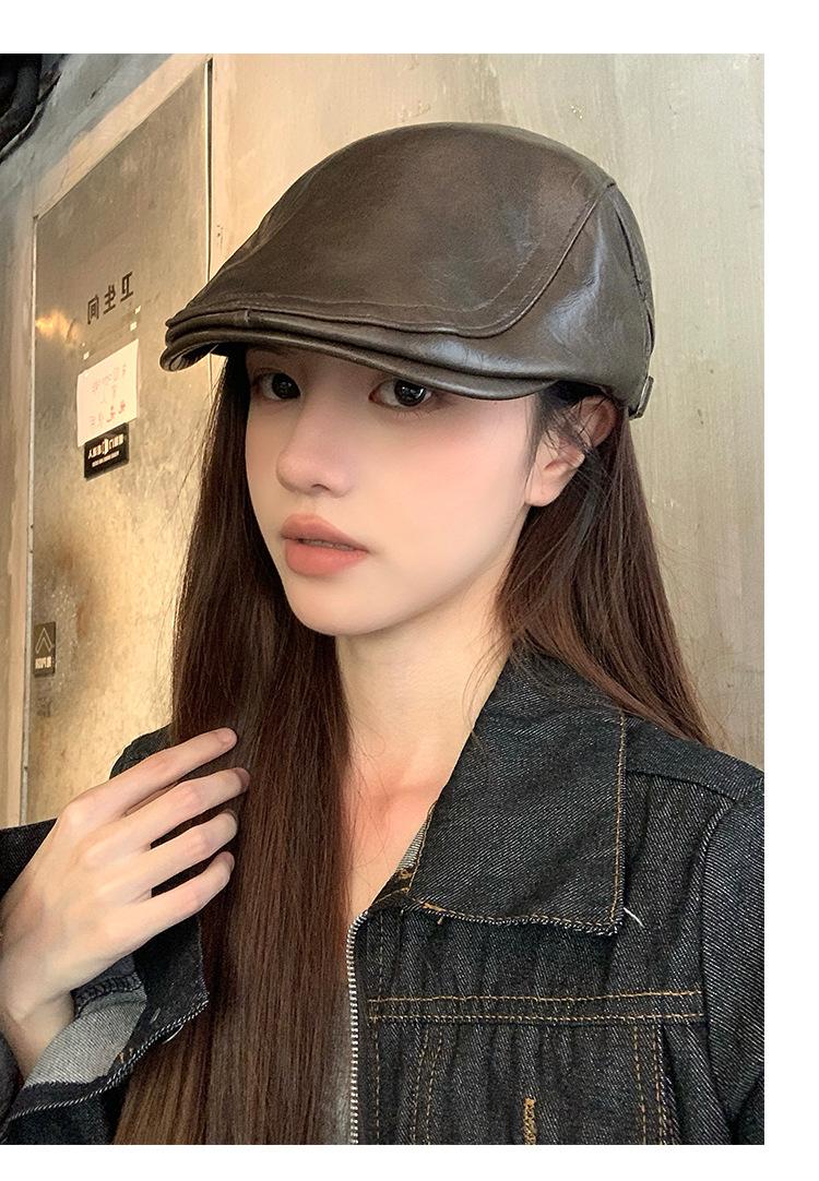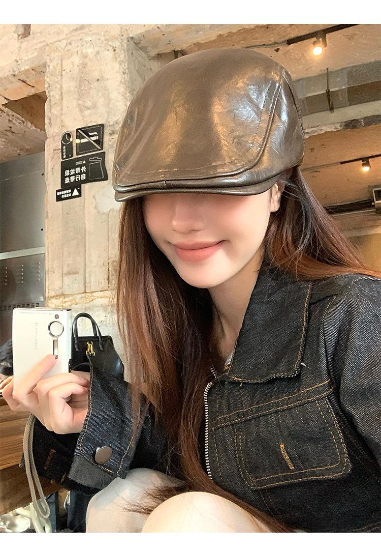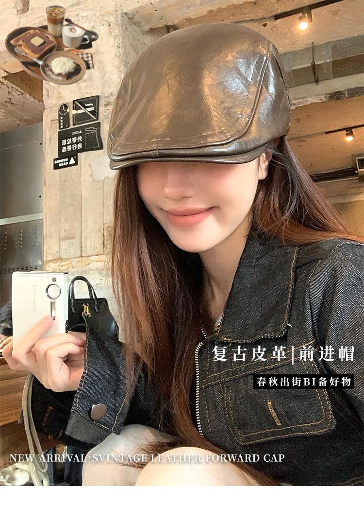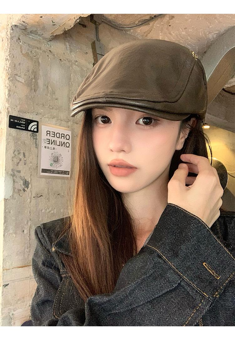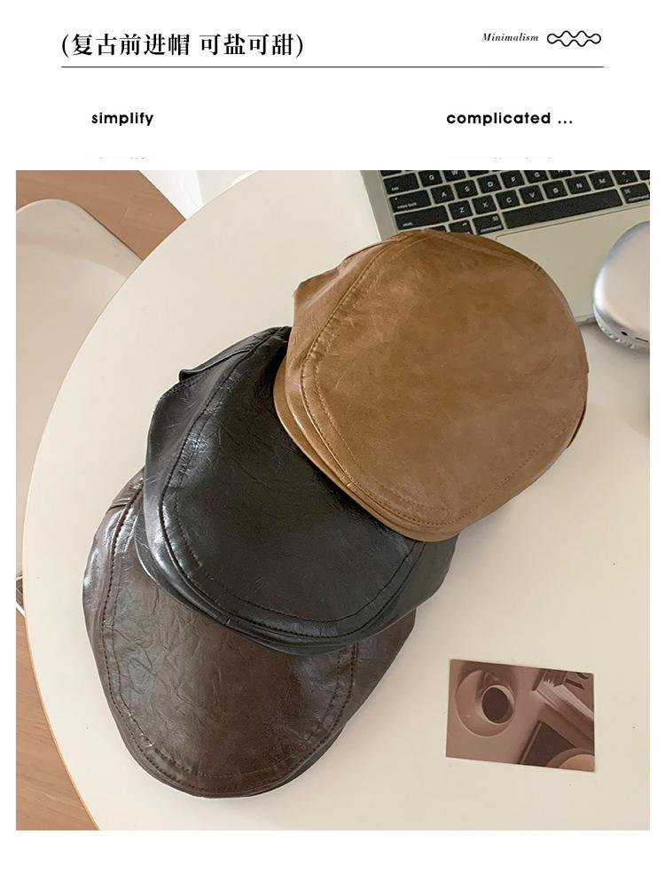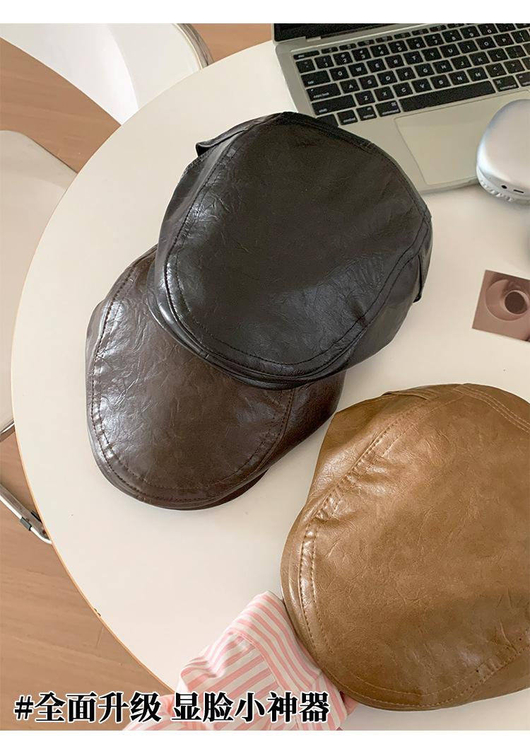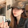 Boina Retro de Cuero PU Estilo Americano para Mujer Otoño e Invierno Combinable Personalidad Chica Hot Cara Pequeña Pequeña Adelante Sombrero de Lengua de Pato