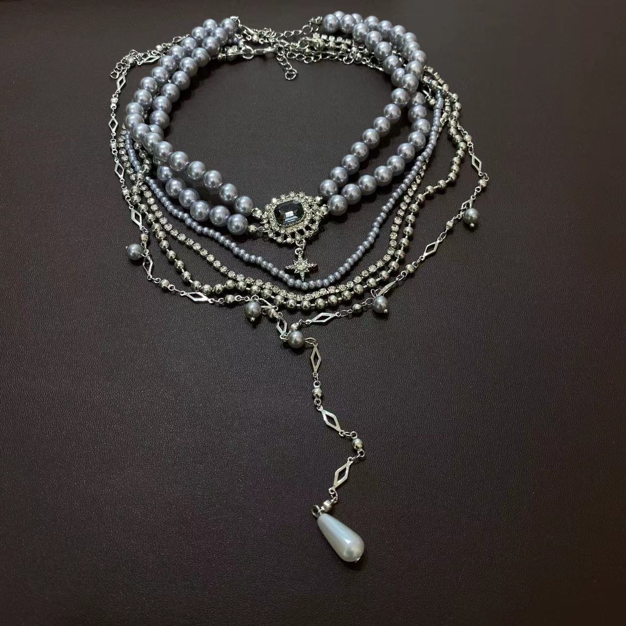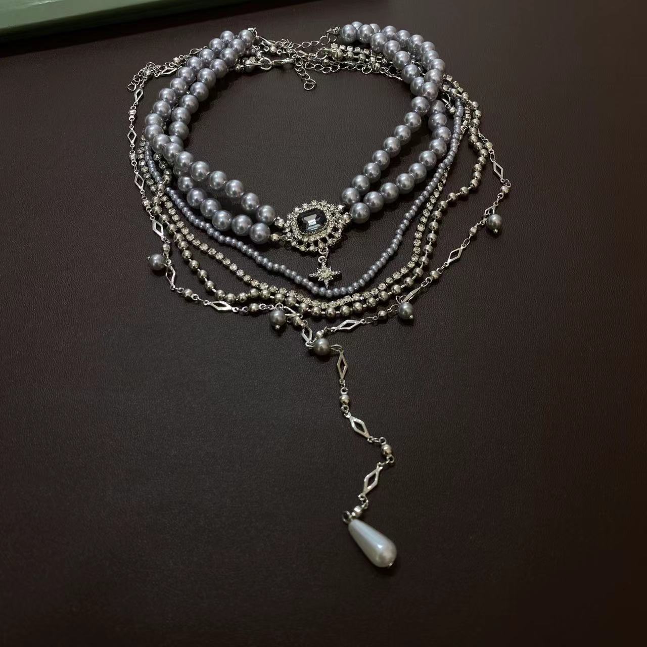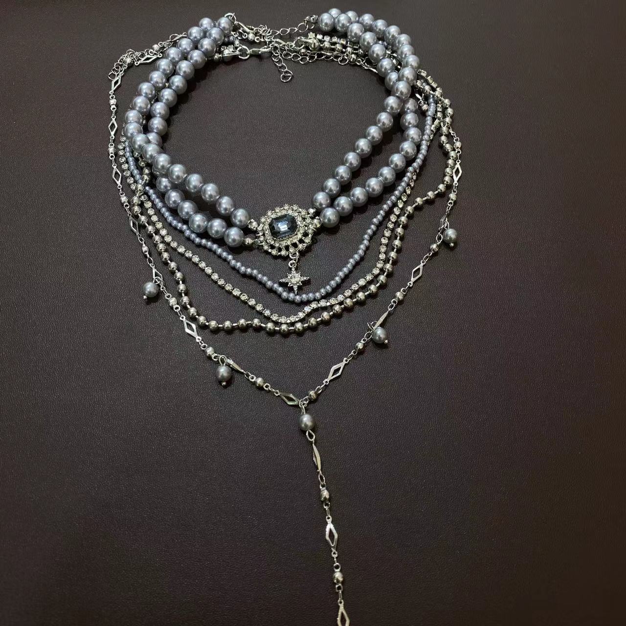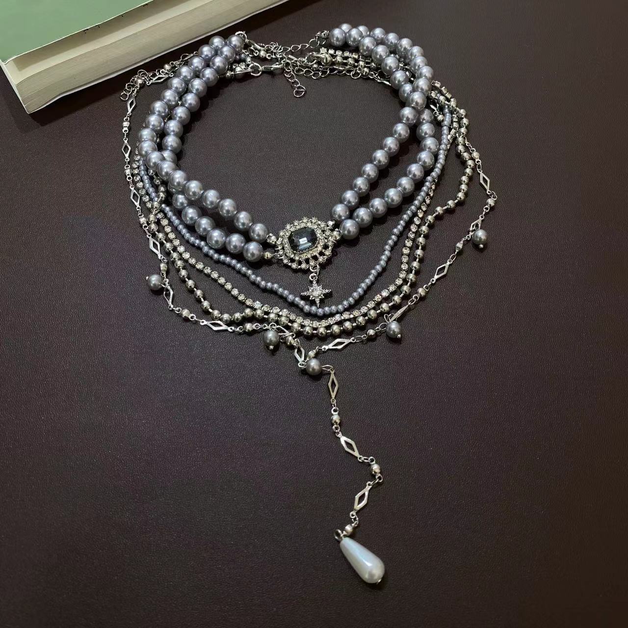 Collar multicapa con cuentas de perla gris plateada y circón cuadrado, diseño de nicho femenino, temperamento personalizado, cadena de clavícula hecha a mano.