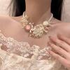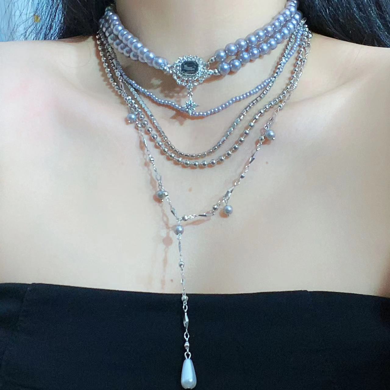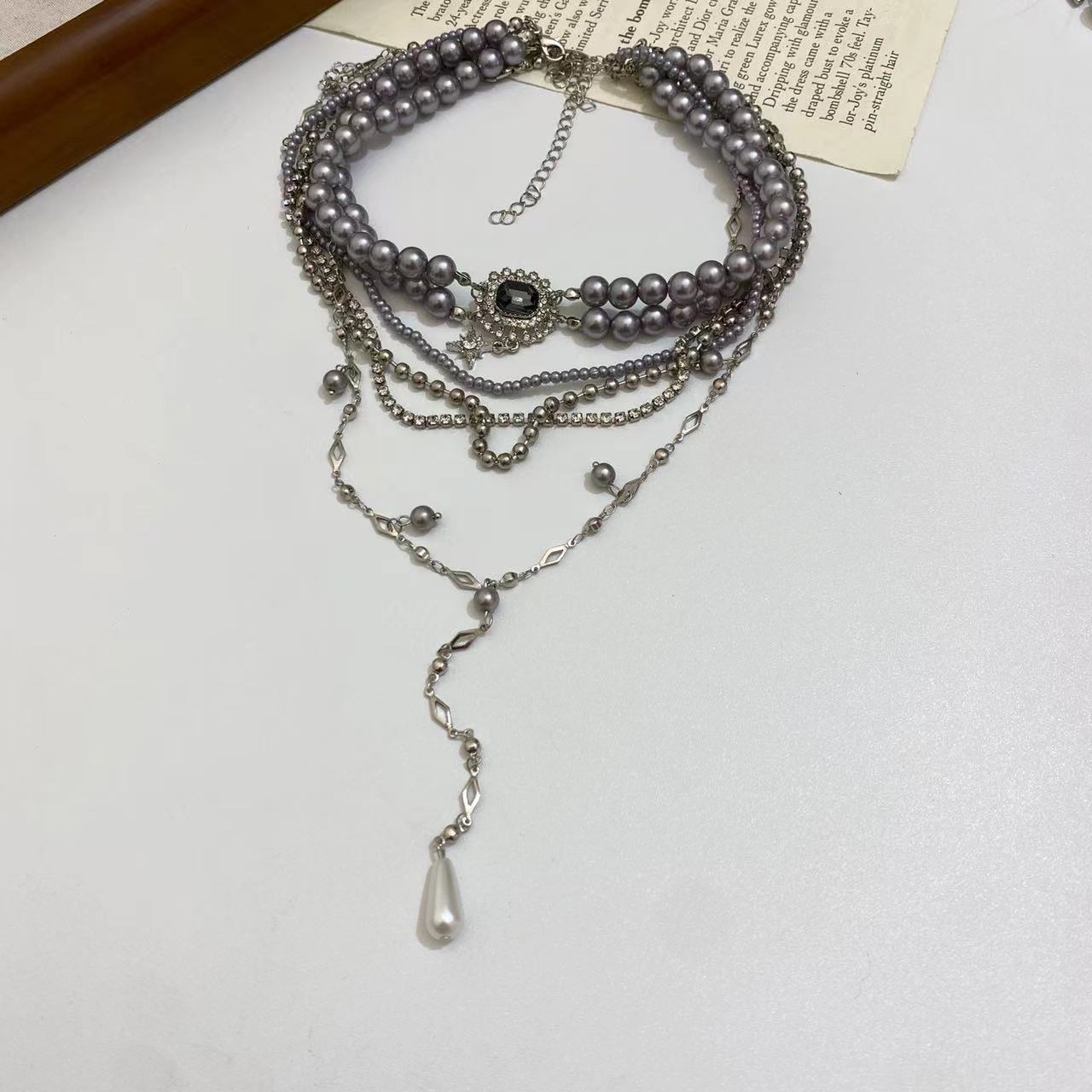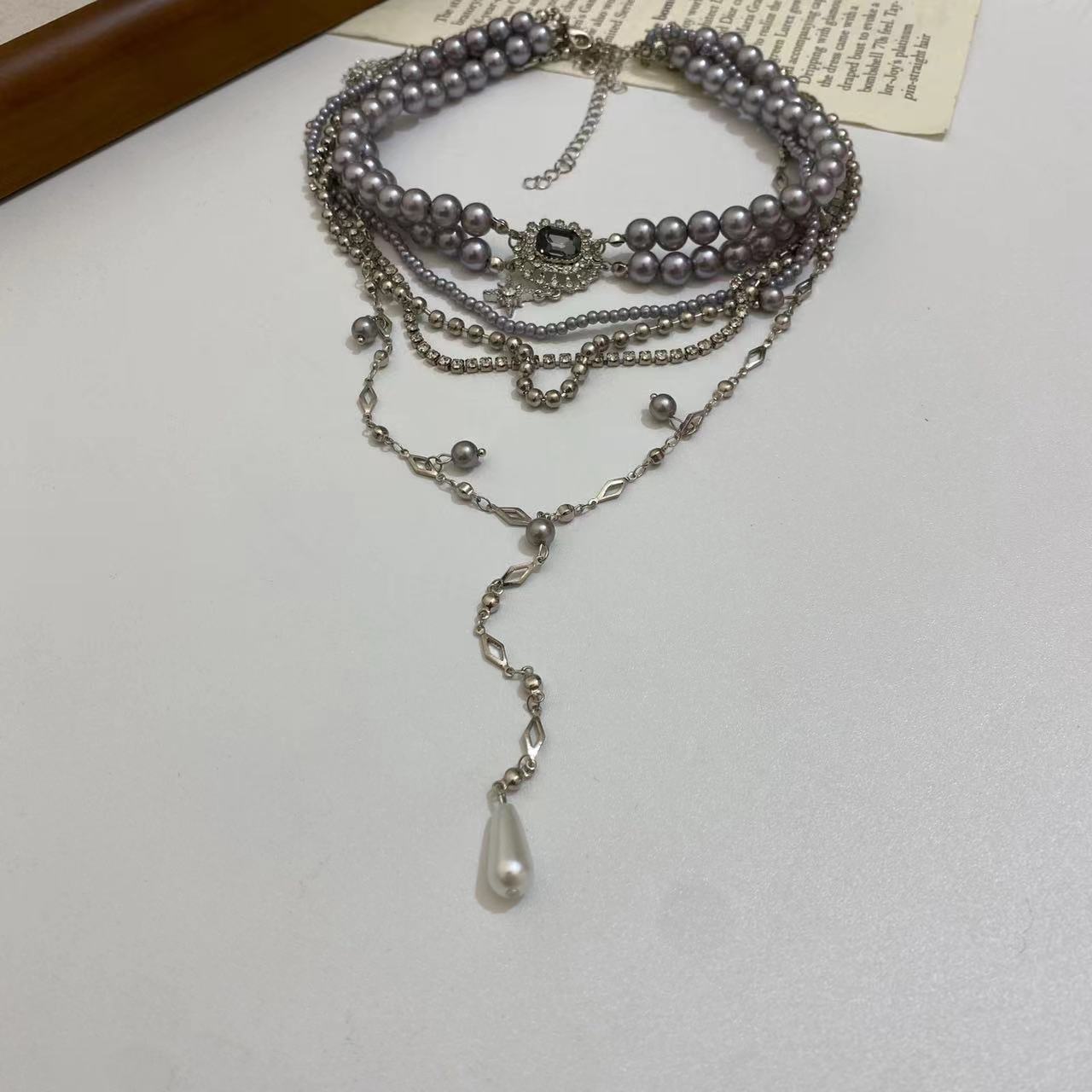 Collar multicapa con cuentas de perla gris plateada y circón cuadrado, diseño de nicho femenino, temperamento personalizado, cadena de clavícula hecha a mano.
