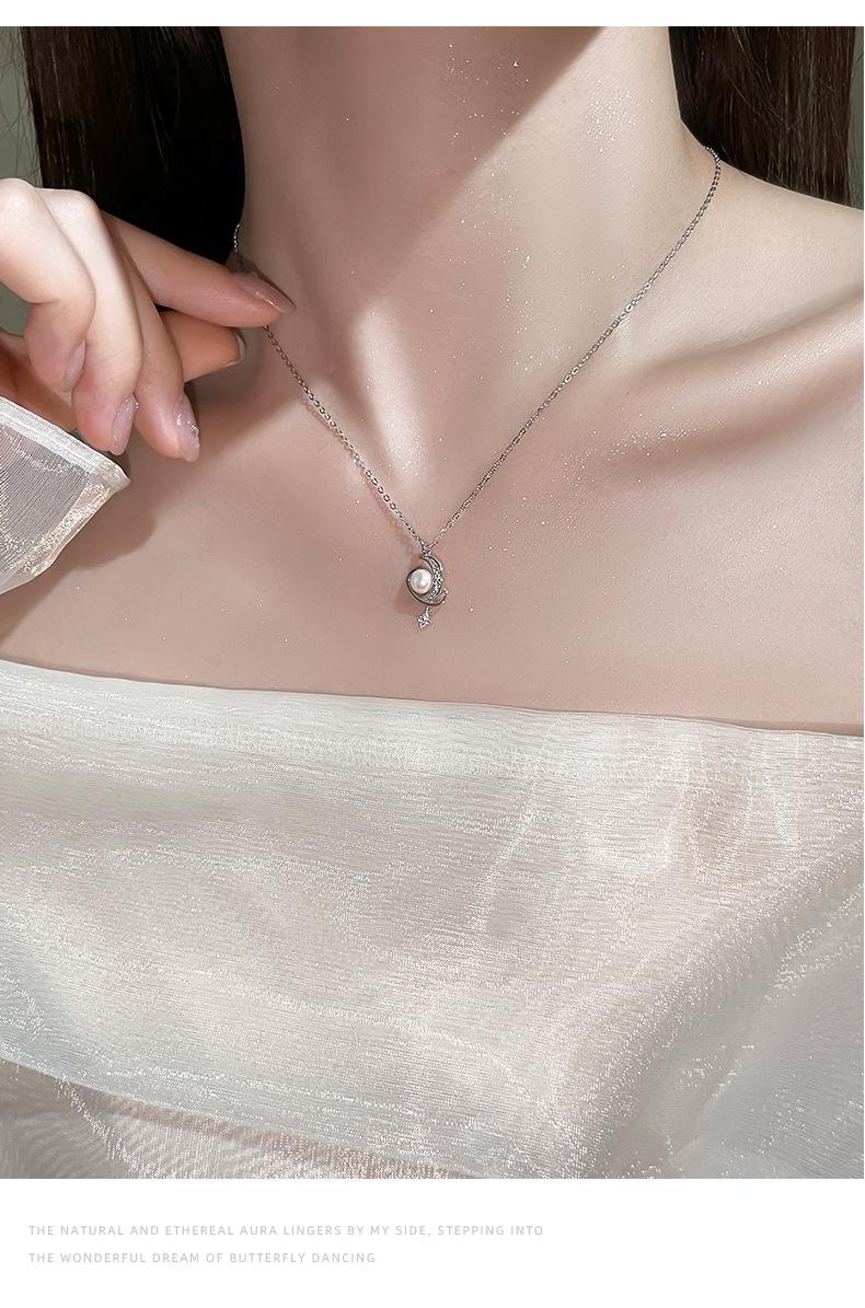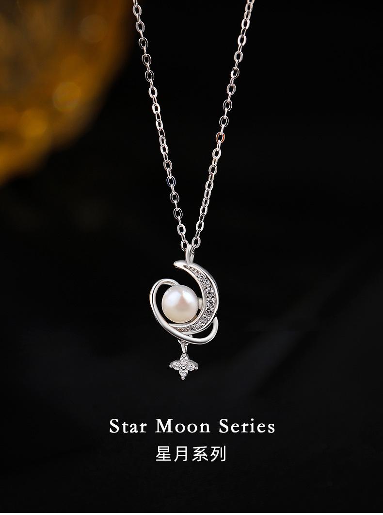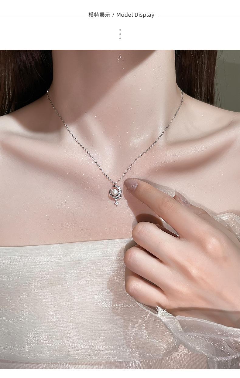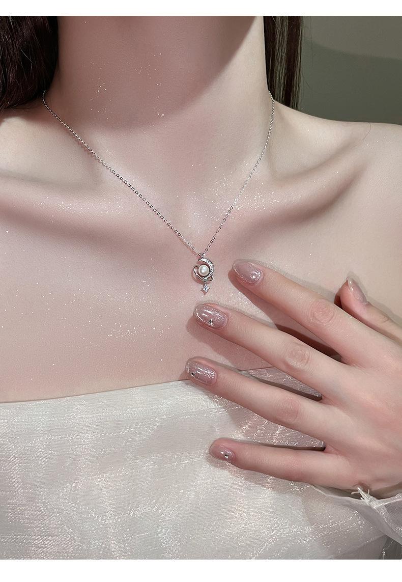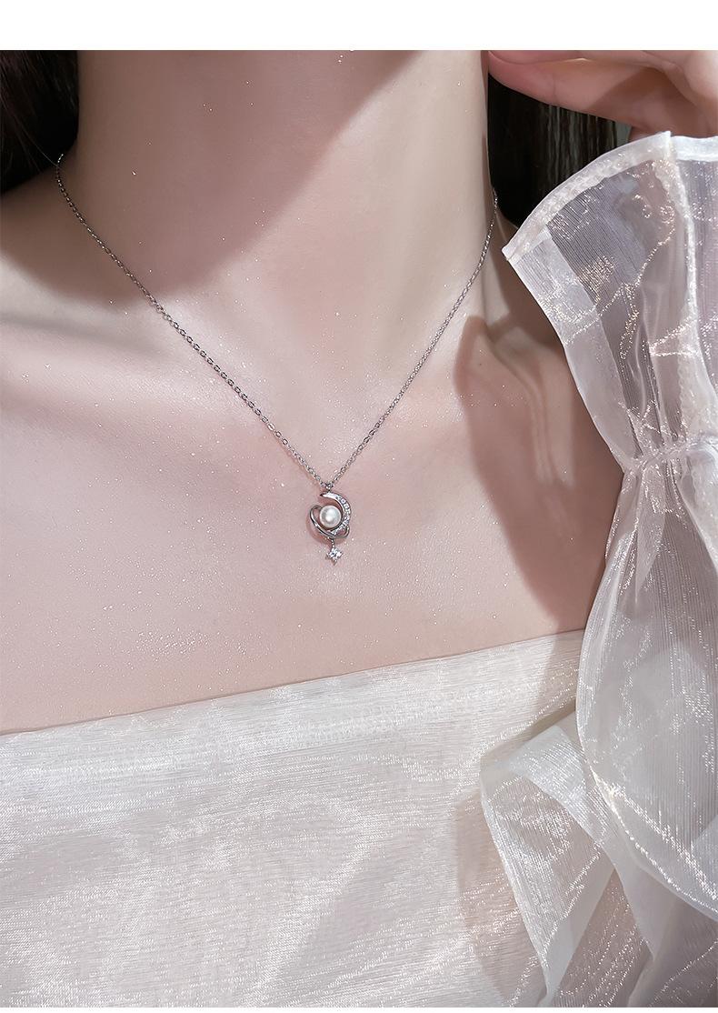 Nuevo collar de plata de ley S925 con perla de luna y estrella envolvente, ligero, de lujo, personalizado, con nicho, combinable con todo, elegante cadena de clavícula.