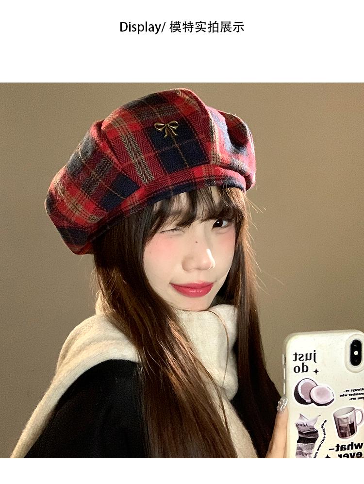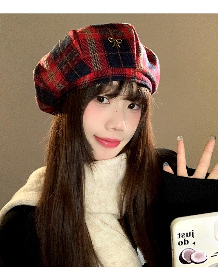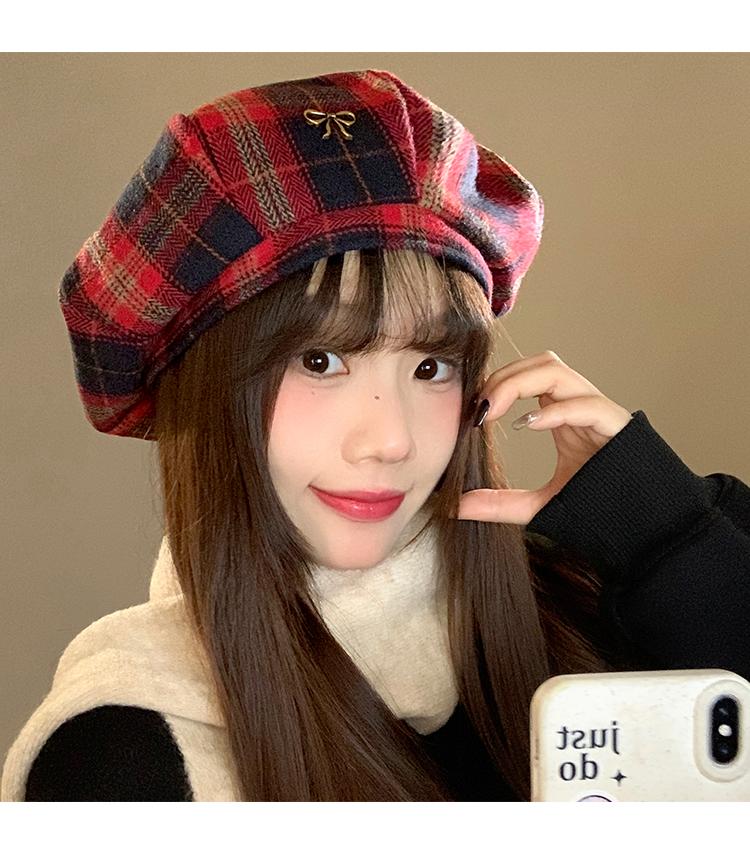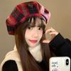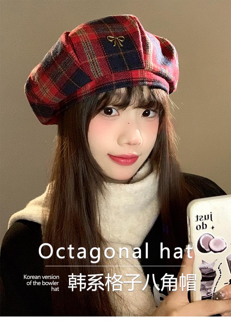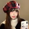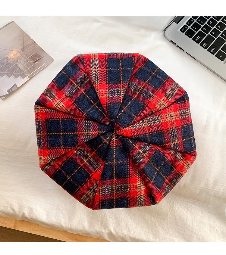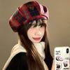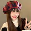 Boina Vintage de Cuadros Rojos Estilo Coreano Estilo Ins Lazo Nueva Gorra Octogonal Combinable Rostro Mostrado Pequeña Gorra de Pintor
