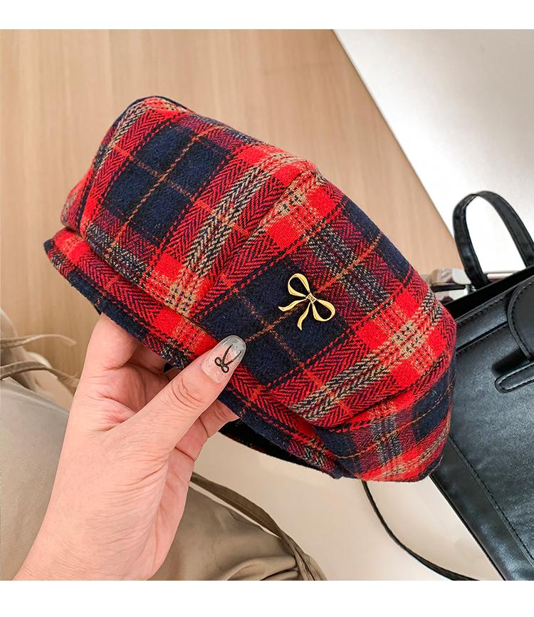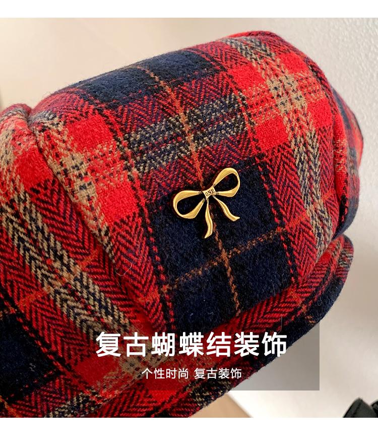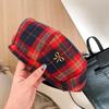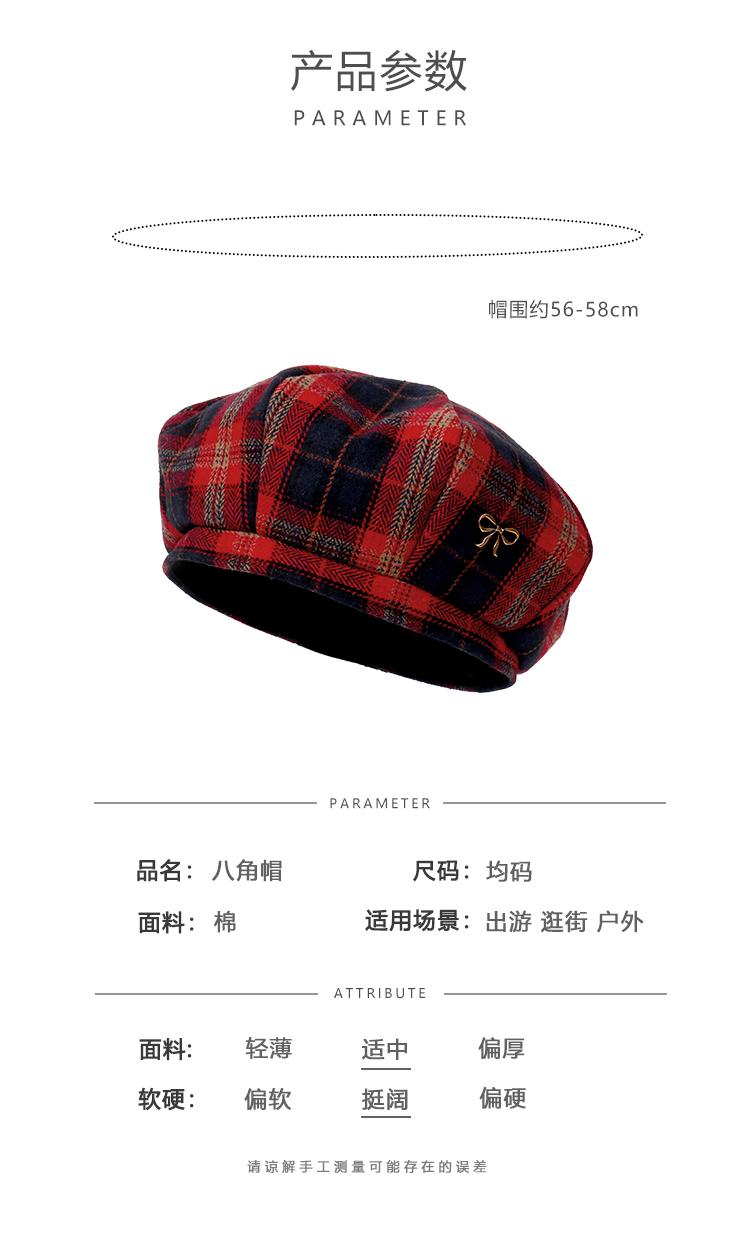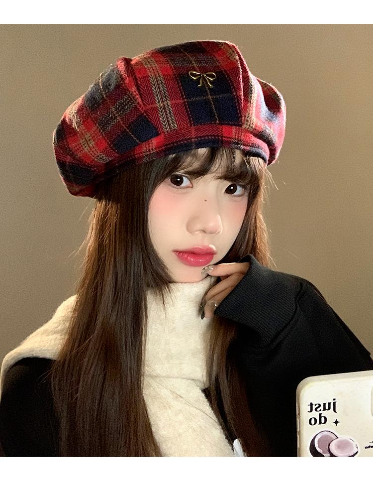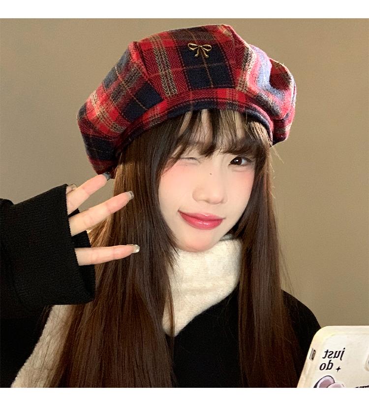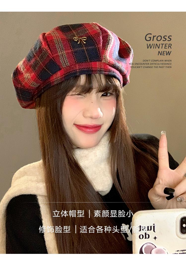 Boina Vintage de Cuadros Rojos Estilo Coreano Estilo Ins Lazo Nueva Gorra Octogonal Combinable Rostro Mostrado Pequeña Gorra de Pintor