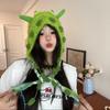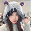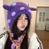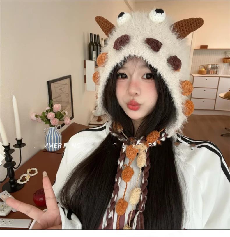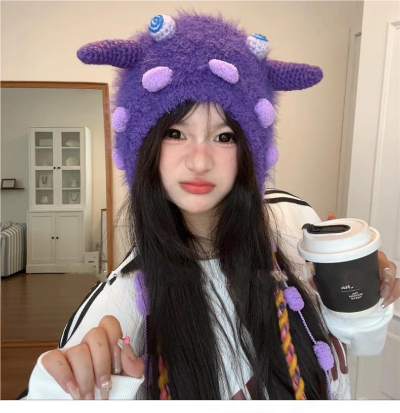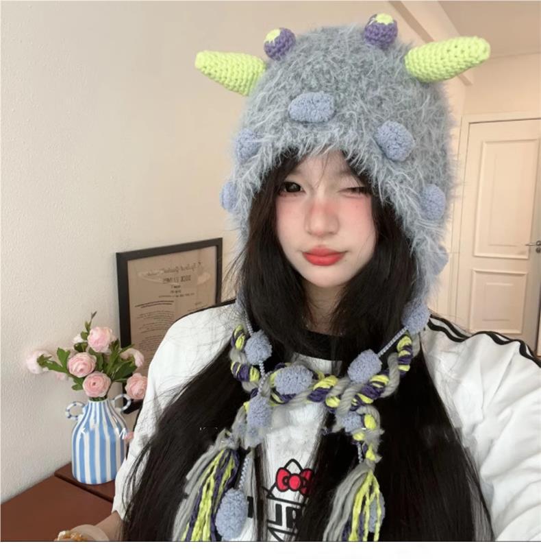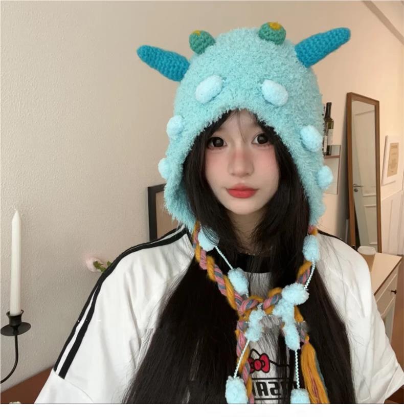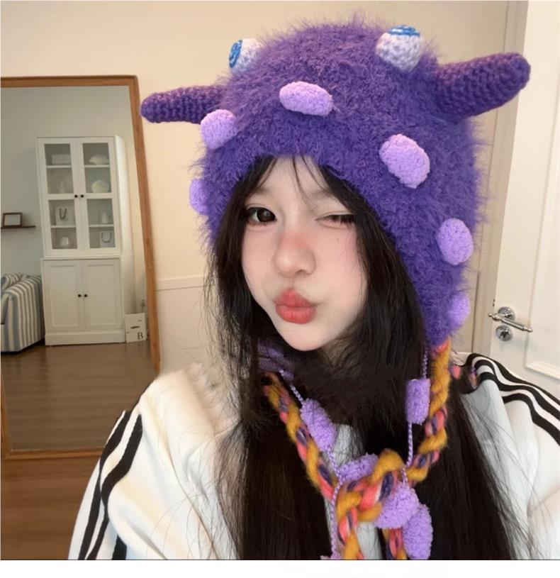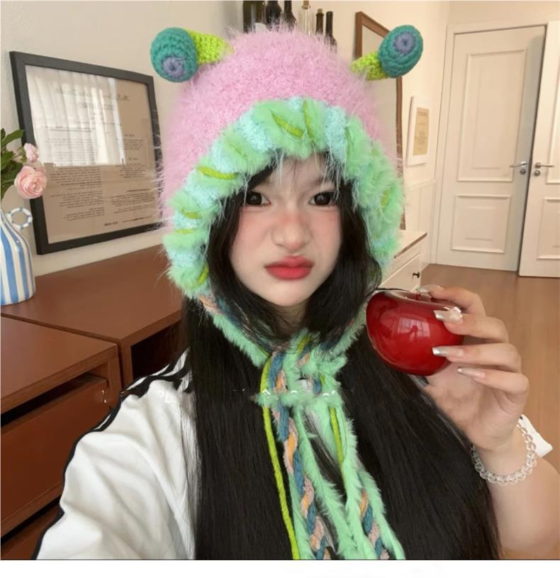 Gorro de punto hecho a mano con diseño de monstruo de caramelo para otoño e invierno, para mujer, de lana, cálido y con protección para las orejas.