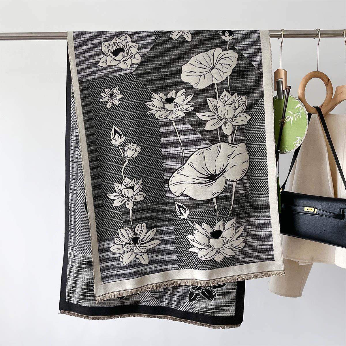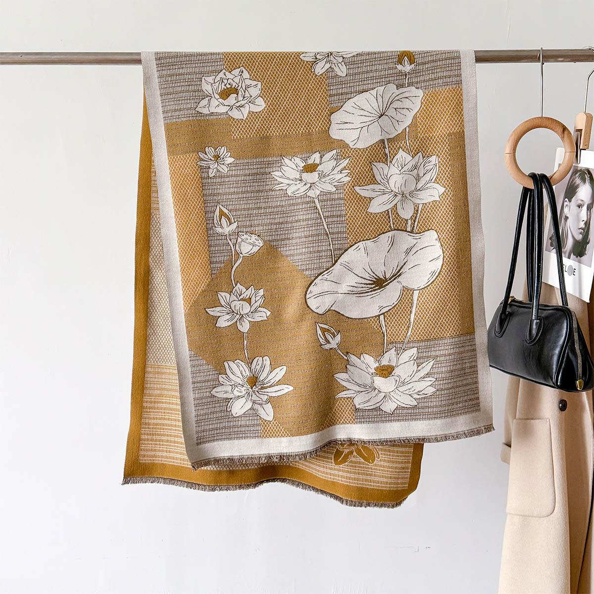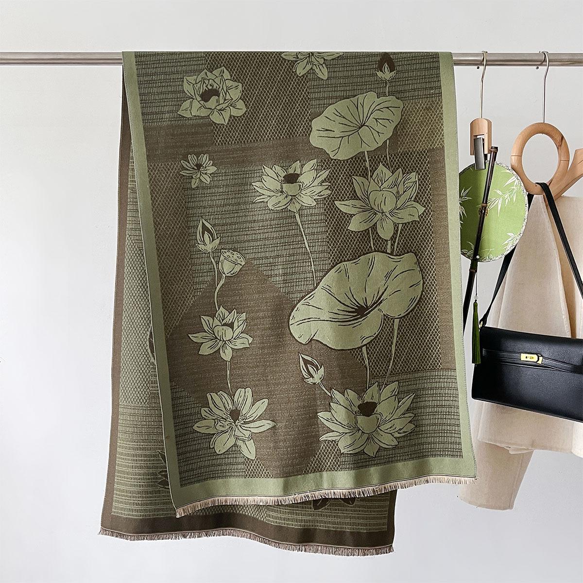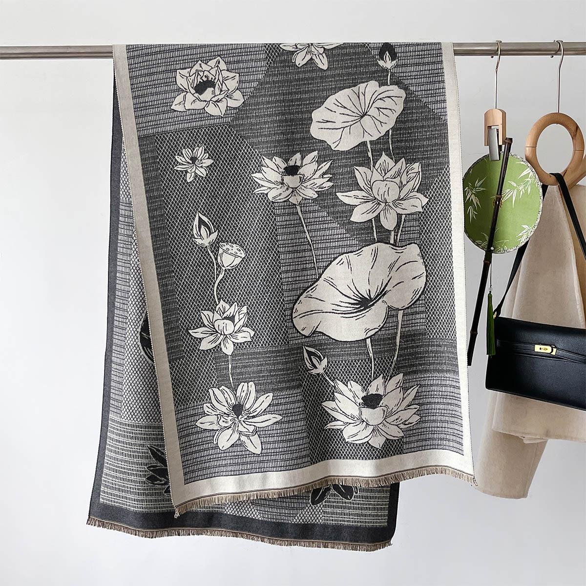 Bufanda Vintage Estilo Nacional Imitación Cachemira Estampado de Loto Elegante Moda Otoño e Invierno Bufanda Cálida Chal Espesado de Doble Uso