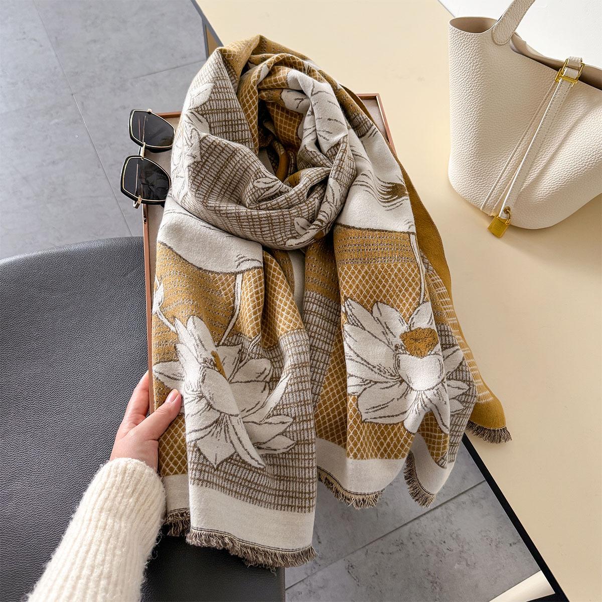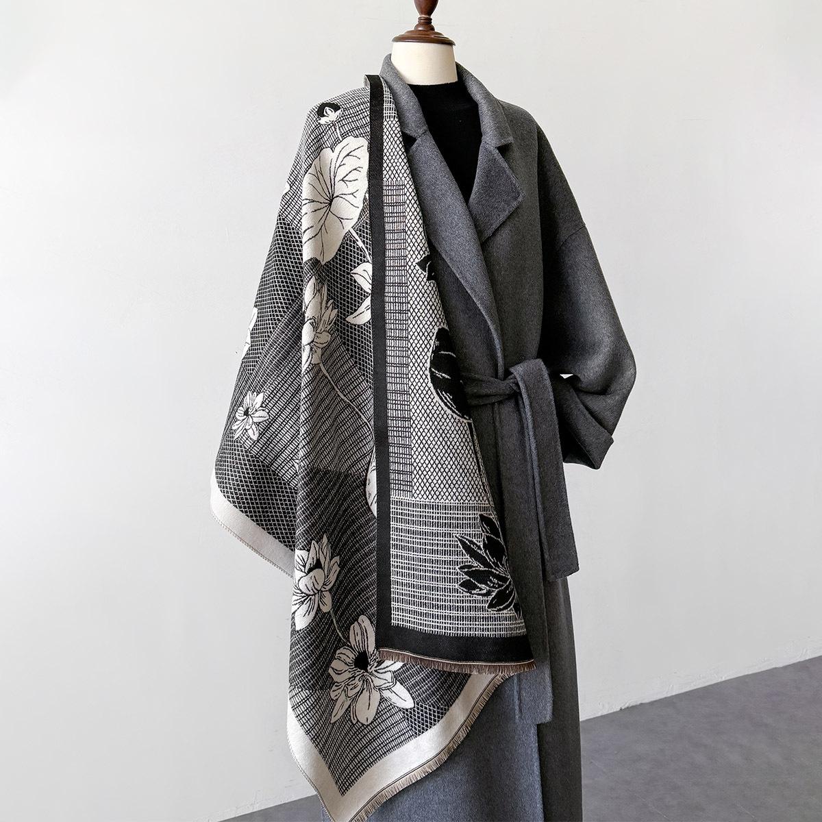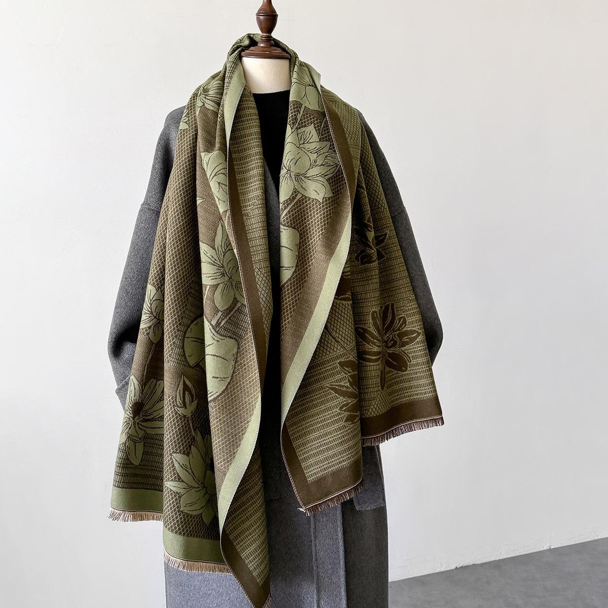 Bufanda Vintage Estilo Nacional Imitación Cachemira Estampado de Loto Elegante Moda Otoño e Invierno Bufanda Cálida Chal Espesado de Doble Uso
