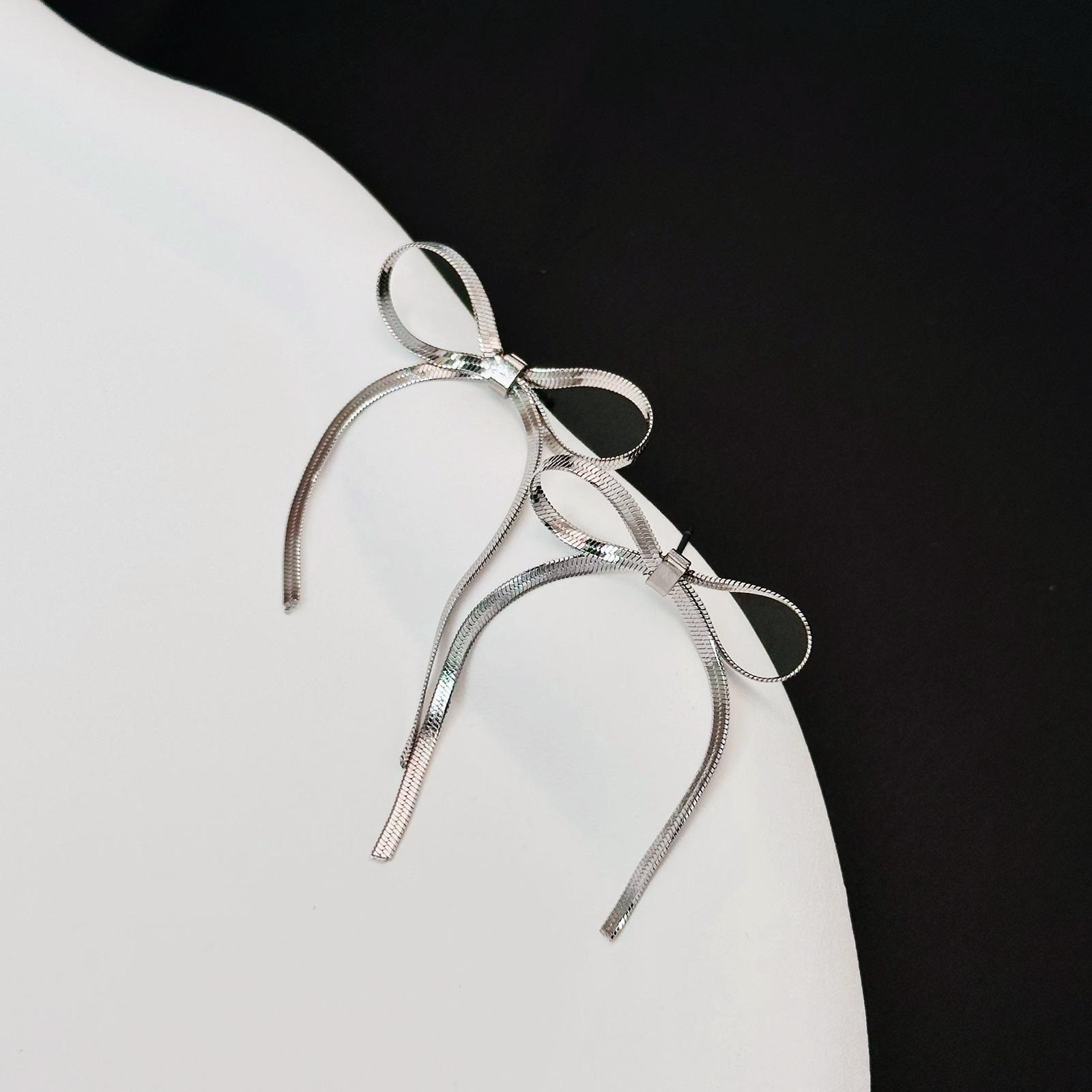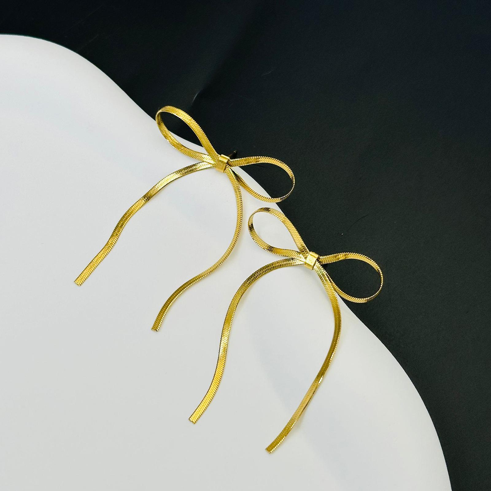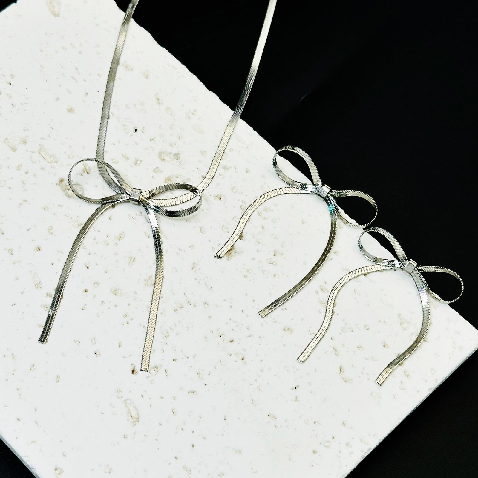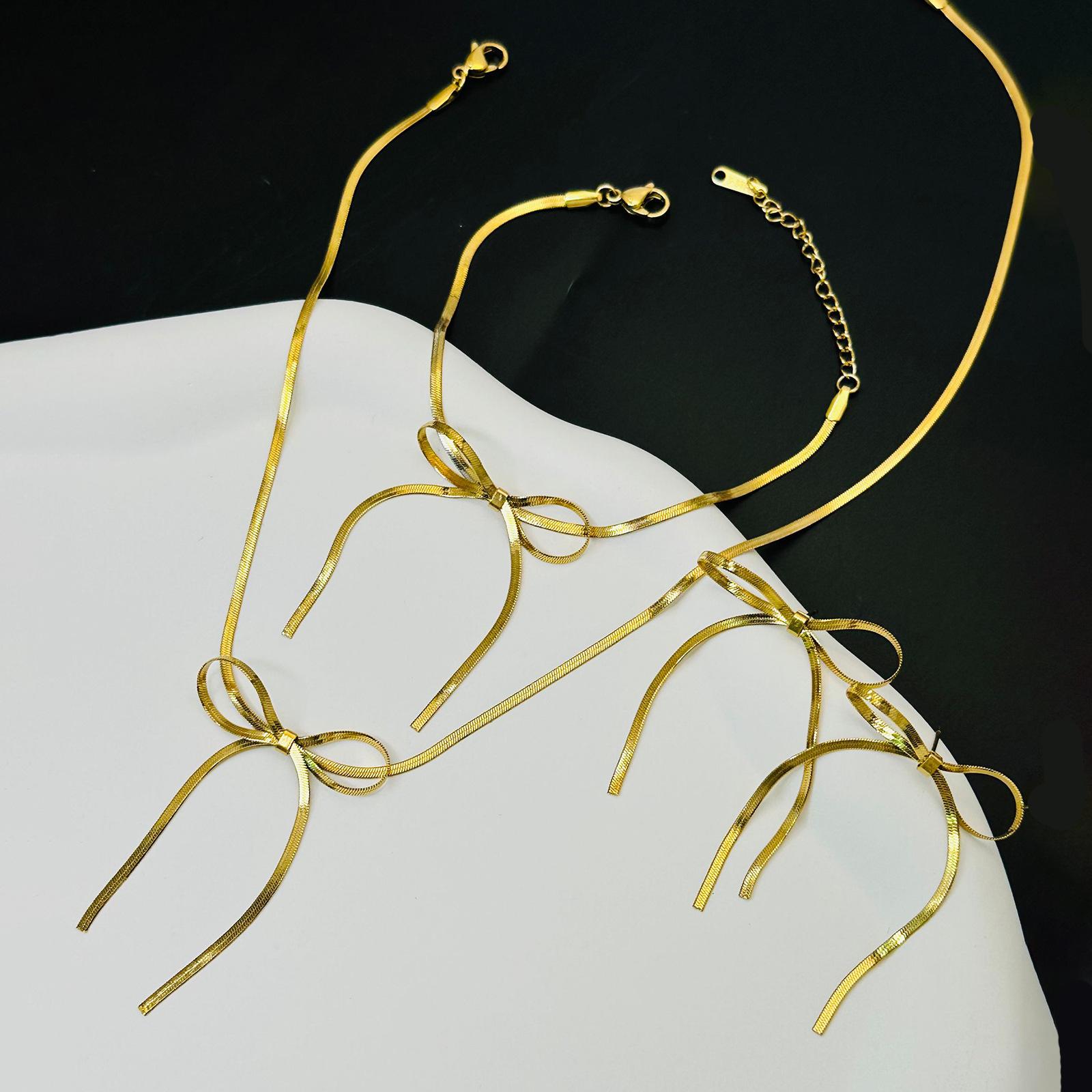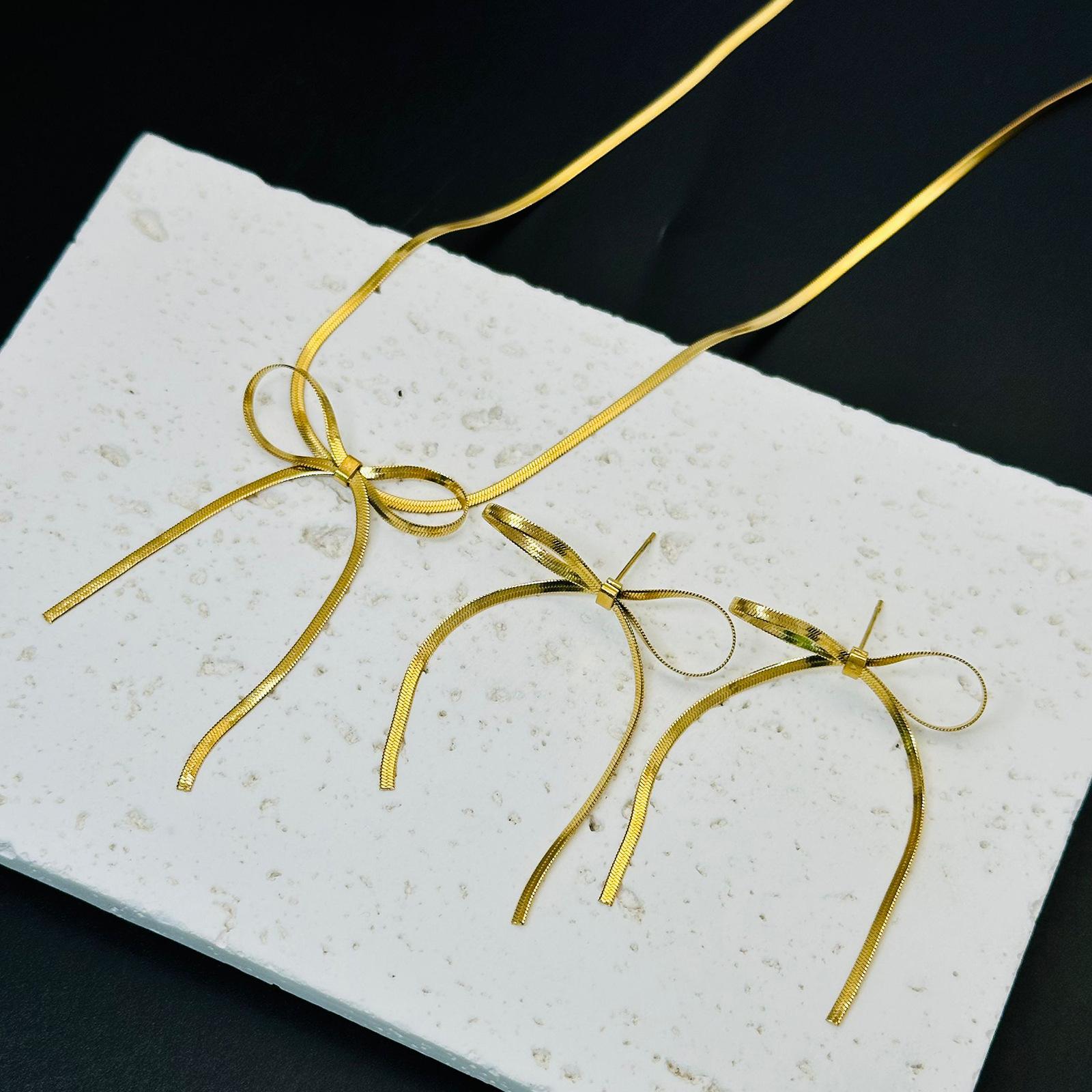 [86444] Golden bow necklace, [86431] steel bow necklace, [7194] a pair of golden bow earrings, [7703] A pair o...