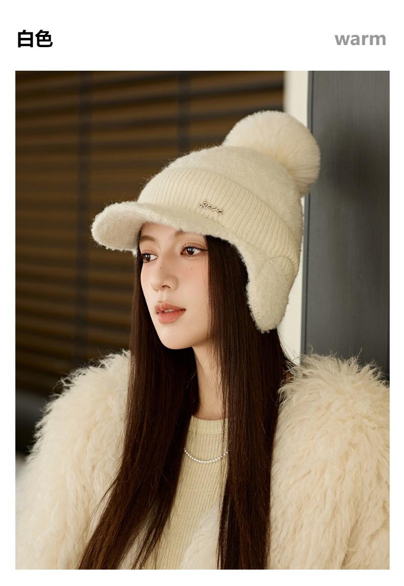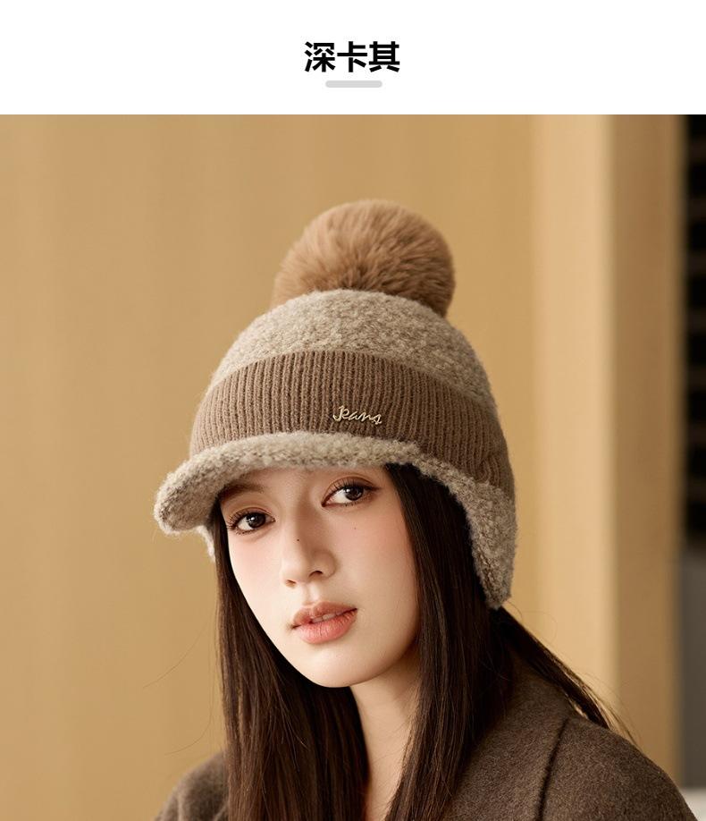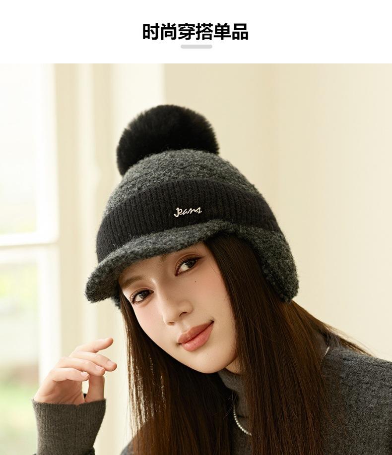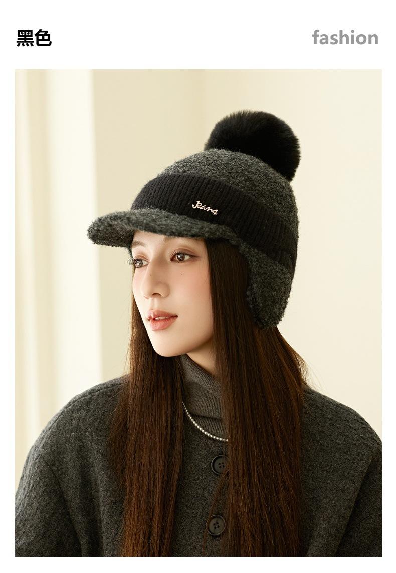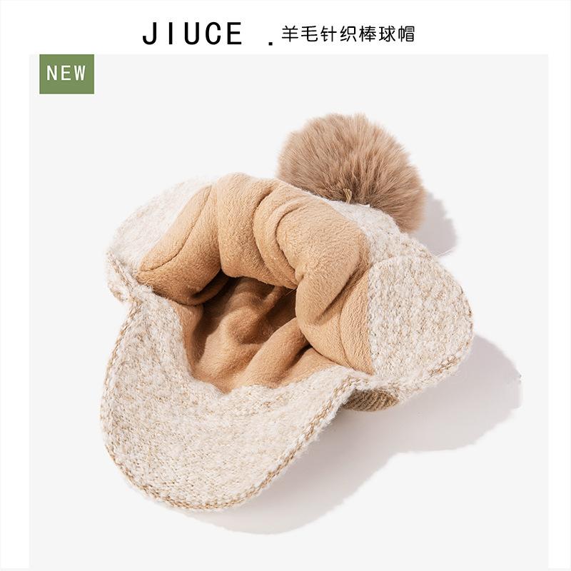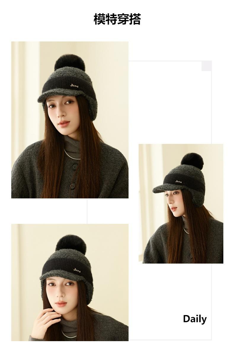 Gorra de Béisbol Gruesa de Lana de Corea del Sur para Niña Invierno Exterior Color Dividido Orejera Gorro con Pompon de Piel Gorro Tejido Grueso