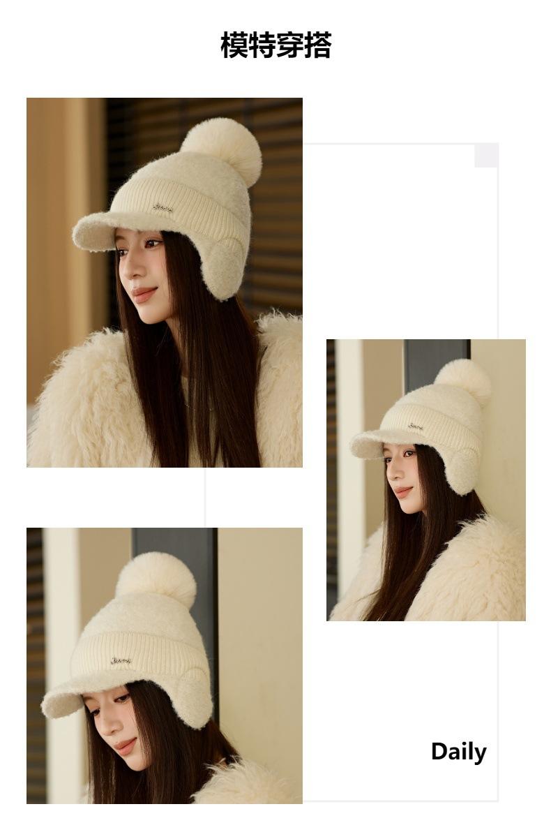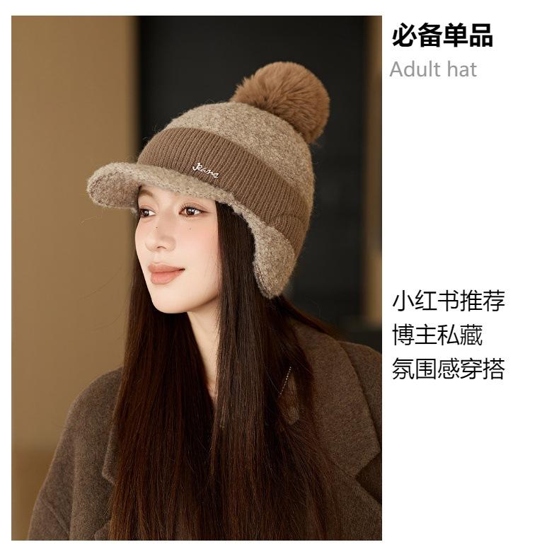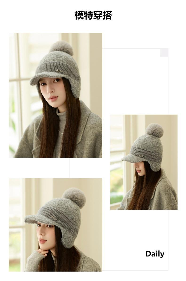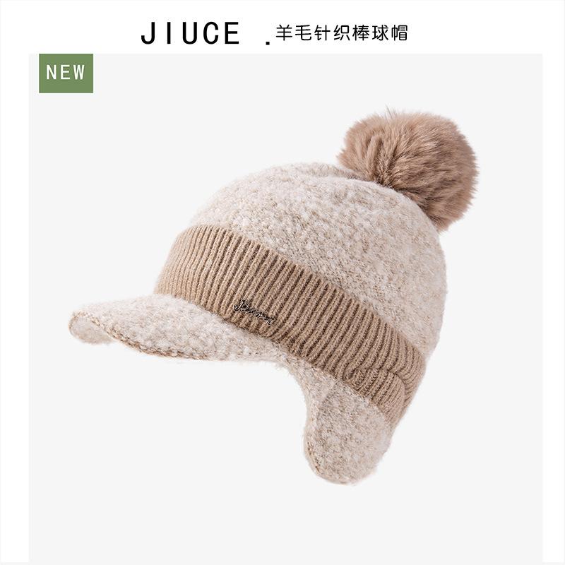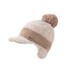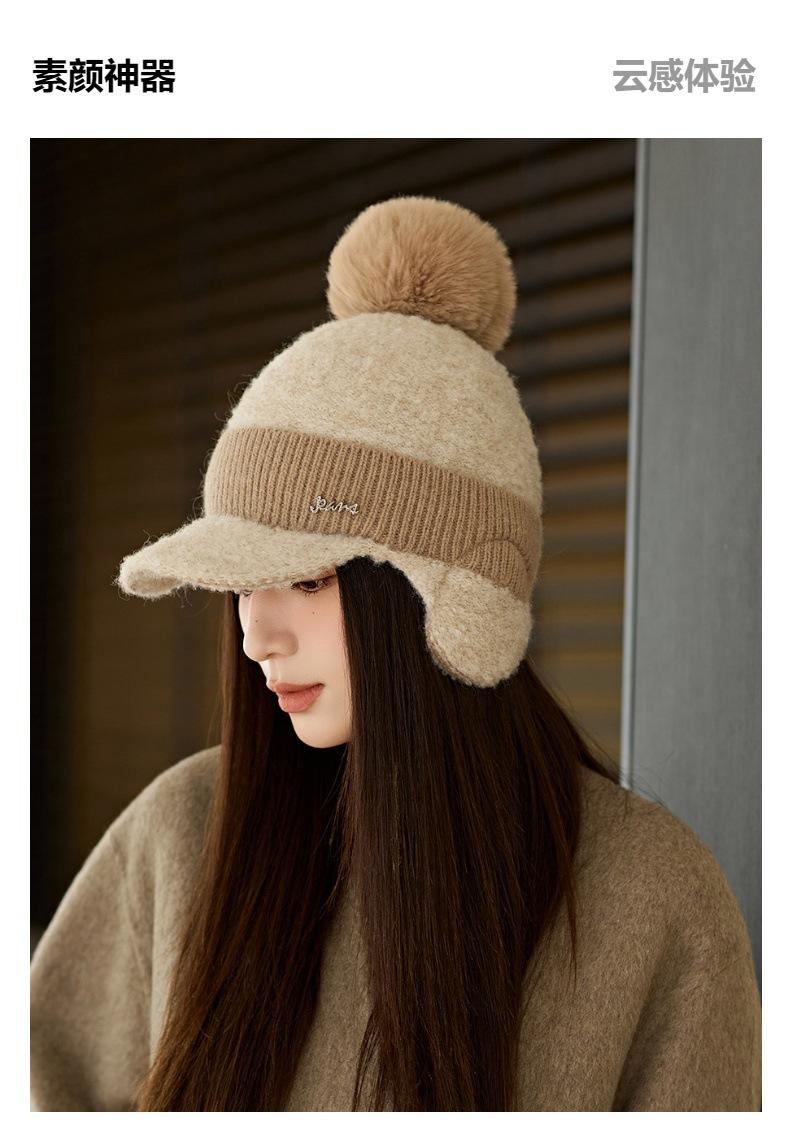 Gorra de Béisbol Gruesa de Lana de Corea del Sur para Niña Invierno Exterior Color Dividido Orejera Gorro con Pompon de Piel Gorro Tejido Grueso