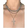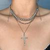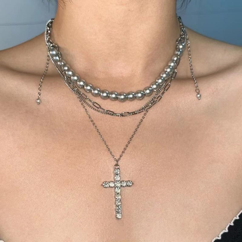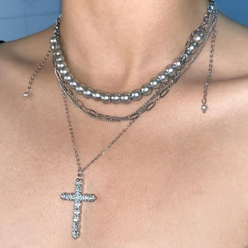 Collar con colgante de cruz con borlas y cadena multicapa de cuentas redondas grises para mujer, estilo frío y ligero, de lujo, a la moda