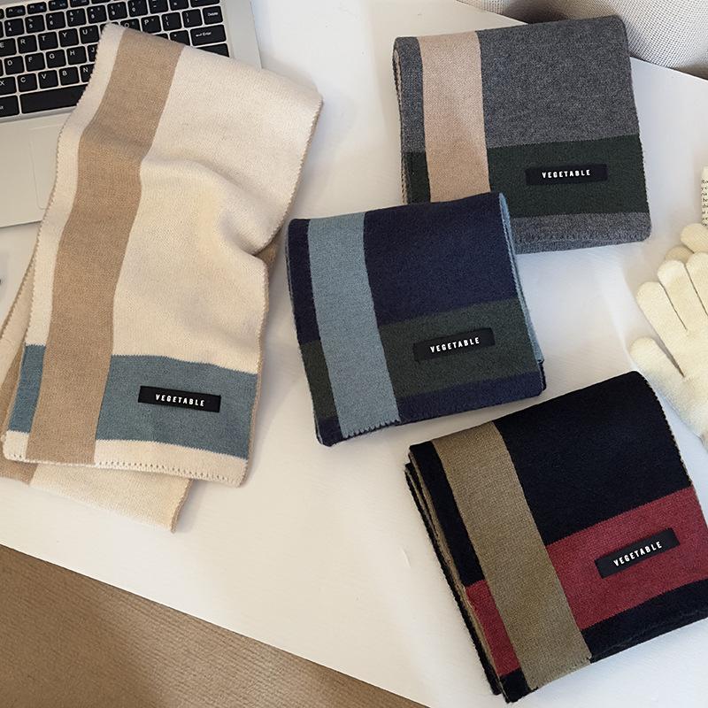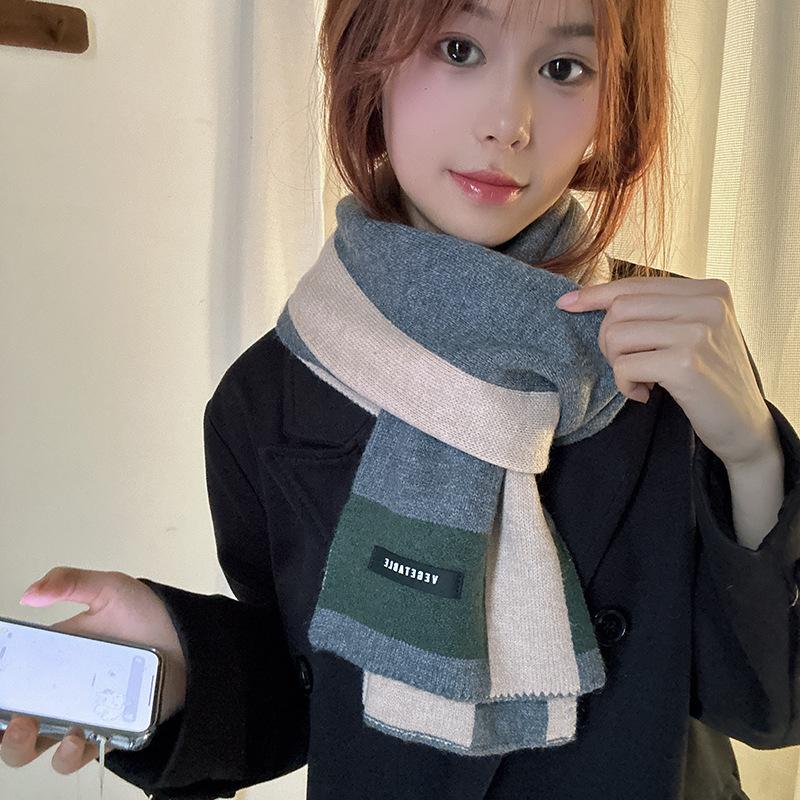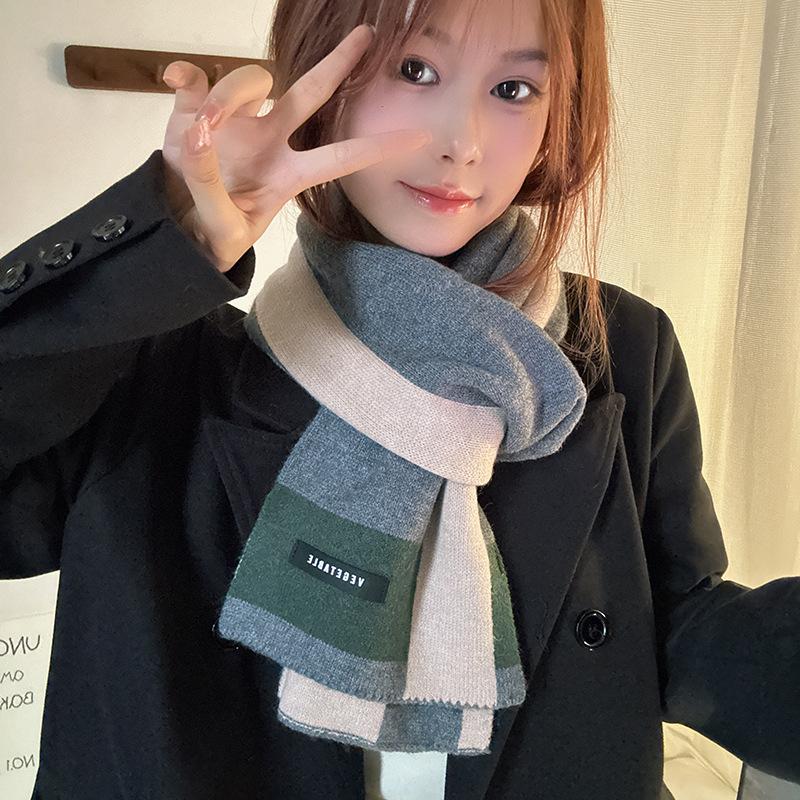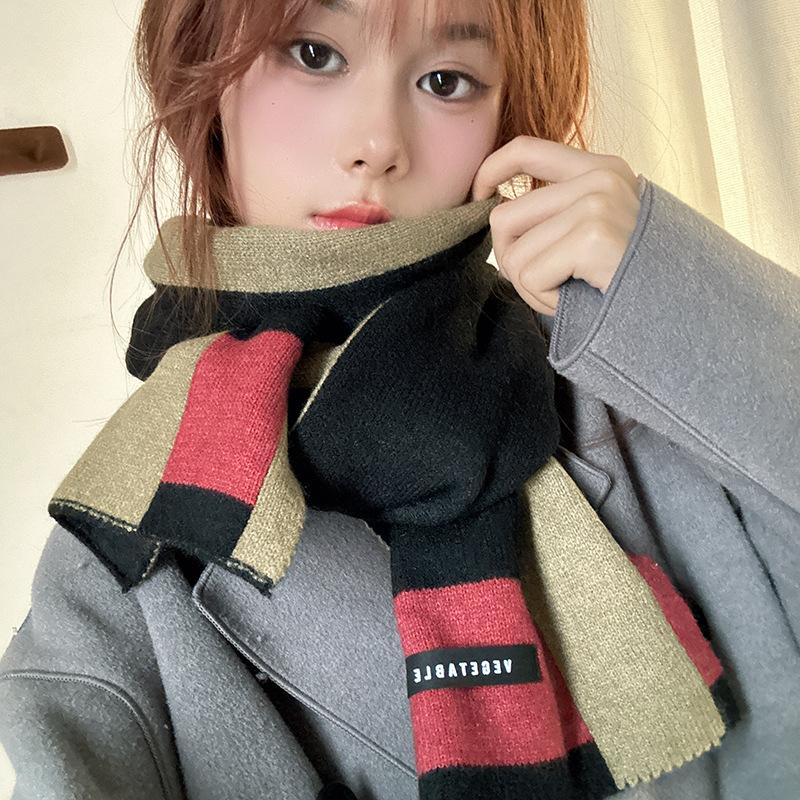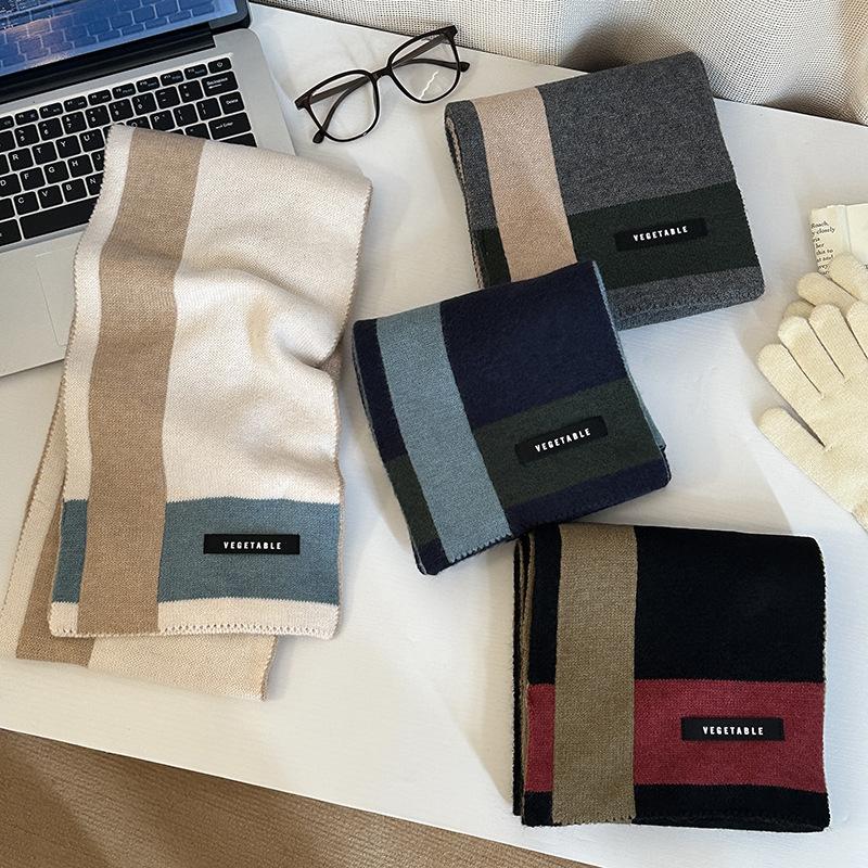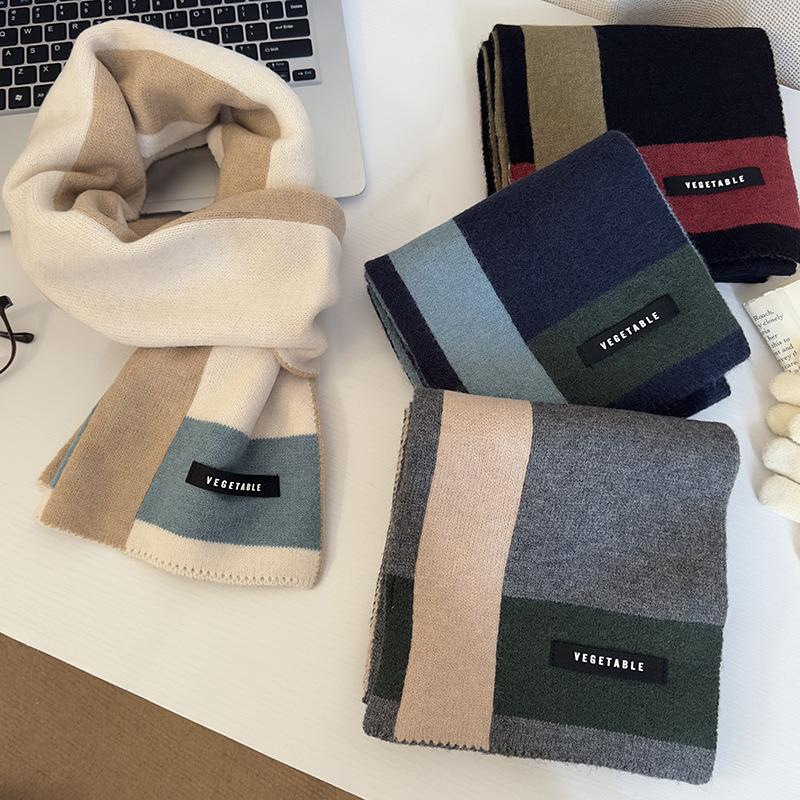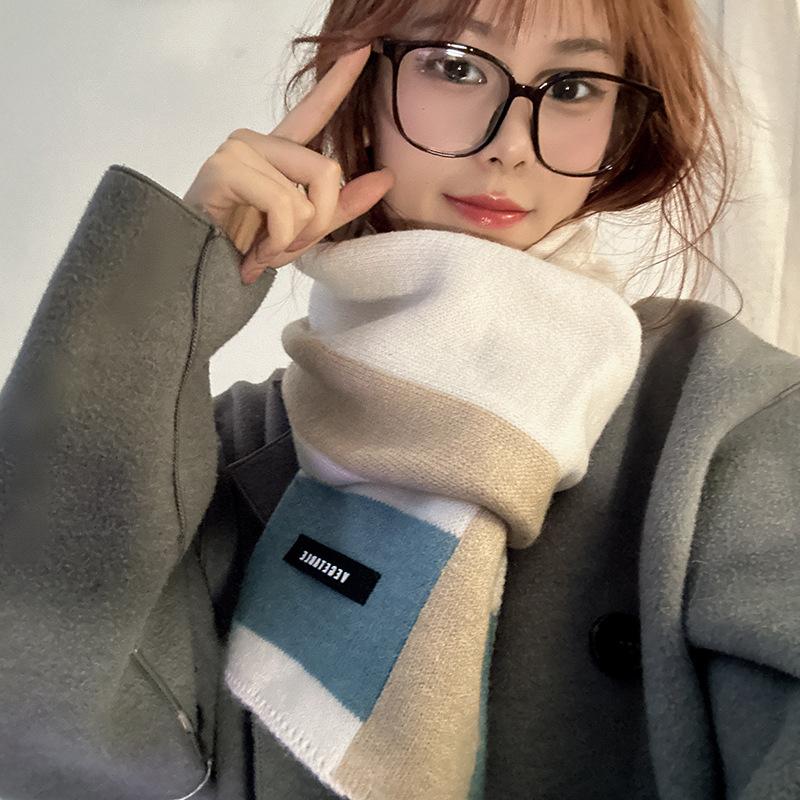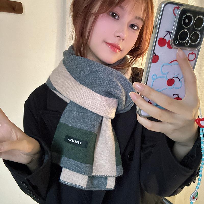 Bufanda de invierno con bloques de colores a cuadros para parejas, cálida, de lana tejida en contraste, de imitación de cachemira de alta calidad, estilo coreano para estudiantes.