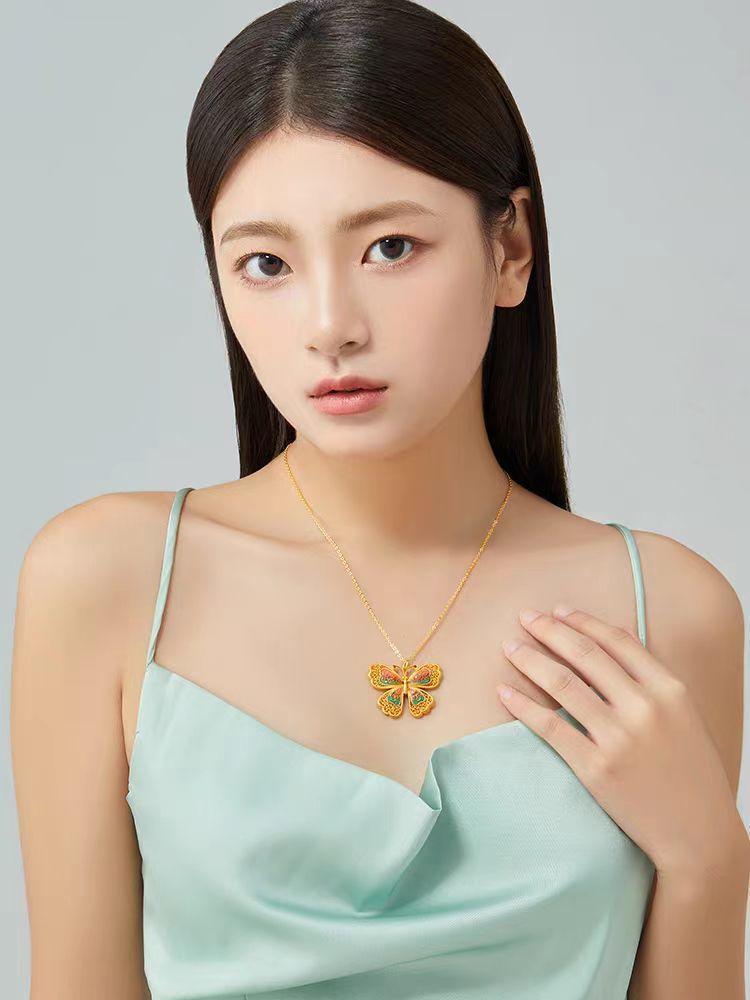 Conjunto de colgante de anillo con mariposa de esmalte de filigrana, latón chapado en oro, tendencia nacional, método antiguo, serie mariposa recortada, collar colgante